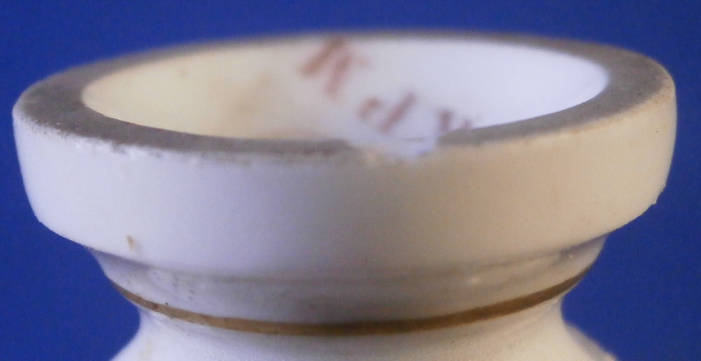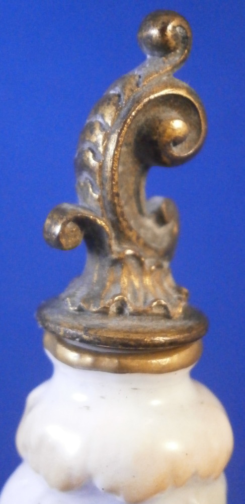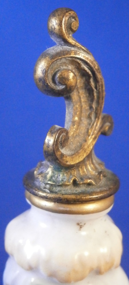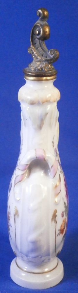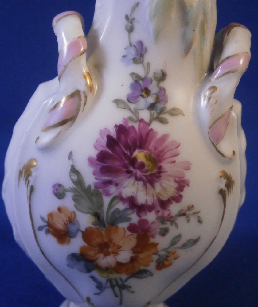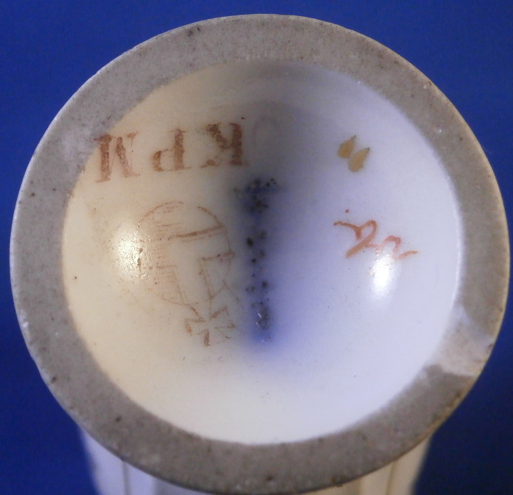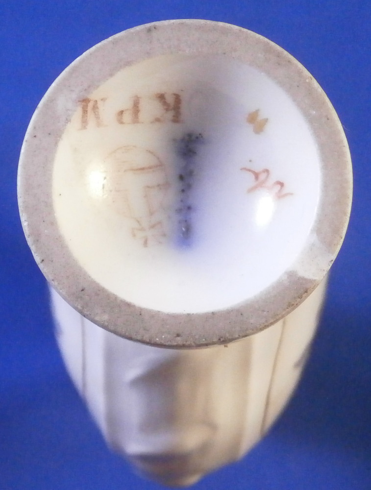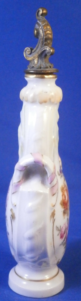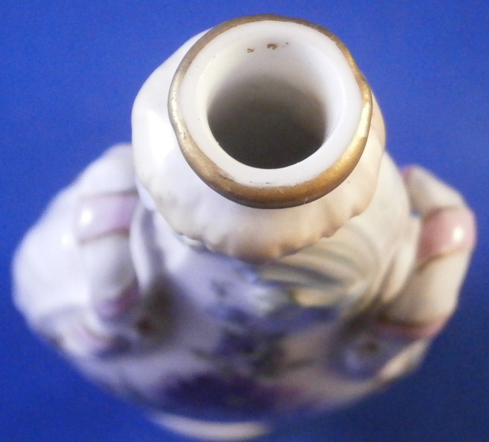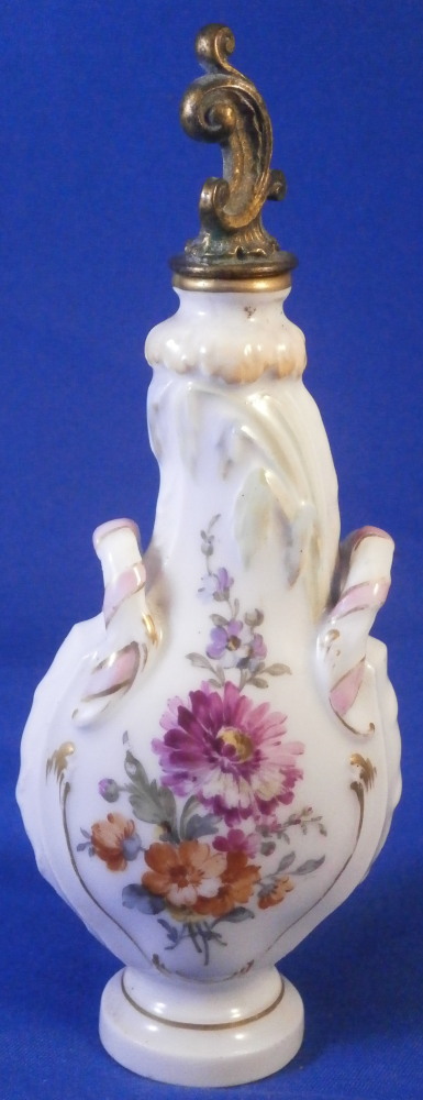 This is a superb perfume / scent bottle / flacon made by KPM in the early 20th century. It is hand painted very nicely with a floral arrangement to the front and back with some nice relief detail partially highlighted with gilding, a little handle to either side with a pink band design wrapped around it and a blue leaf design to the top part. It still has its nicely shaped original metal stopper as well as the original cork on it. The metal is brass or bronze and could use a bit of a polish to bring the shine back but it's fine the way it is as well. It is a bit loose since the cork is old and has been openend so many times over all these years and dried out a bit but that is normal! The piece is marked underneath with the under glaze blue scepter mark, the red orb as well as a gilder's and painter's mark as shown. The perfume bottle is 4.75 inches tall with the stopper, 1.75 inches wide and 1 inch deep. The piece is in great condition with just a tiny shallow flake to the underside rim which doesn't show when on display. Please email me for more information or other pictures.