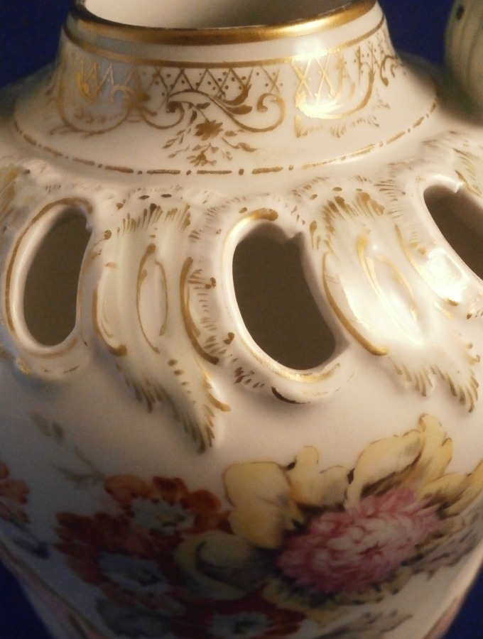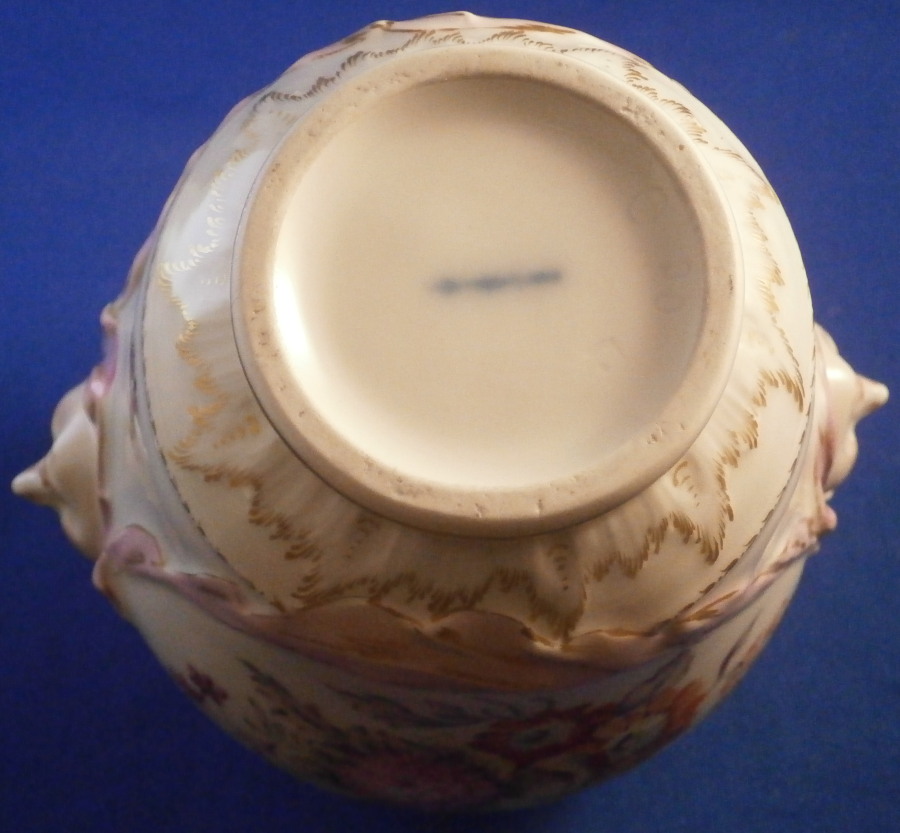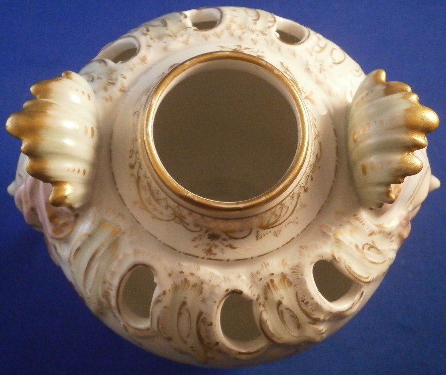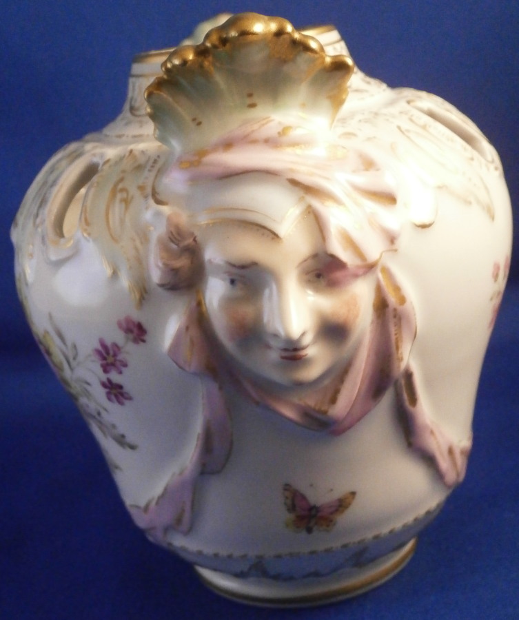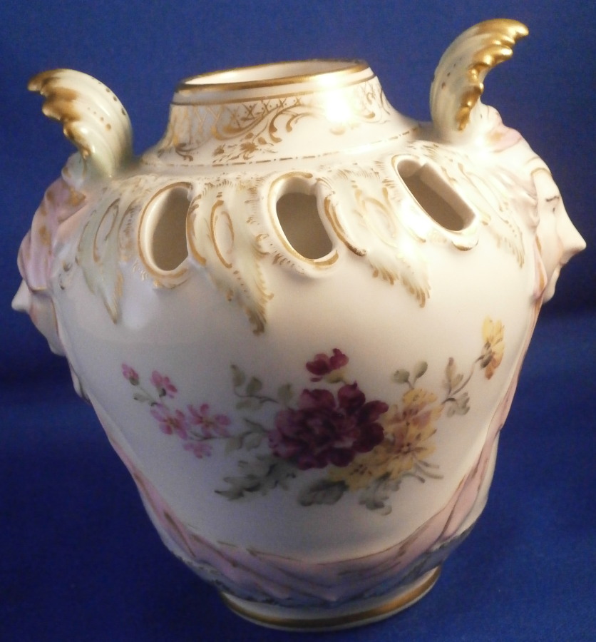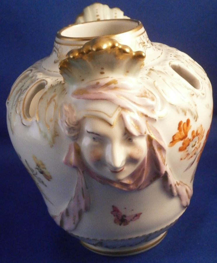 This is a little vase with mascarone handles made by KPM in the early 20th century. It isa really nicely shaped piece with cutouts to the top, a lady's face with a leaf crown on either side and lots of relief and hand painted detail. Lots of nice gilding and a floral arrangement to the front and back with a butterfly under each handle. The piece is in perfect condition and is marked underneath with the under glaze blue scepter mark as well as the usual impressed marks of this period as shown. The vase is just under 4.5 inches3.75 inches in diameter. Please email me for more information or other pictures.