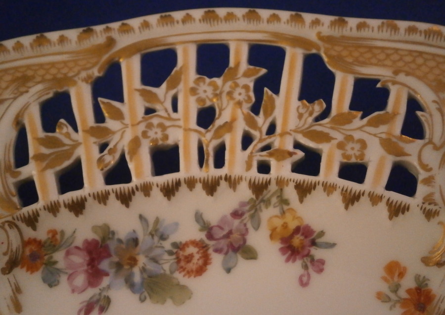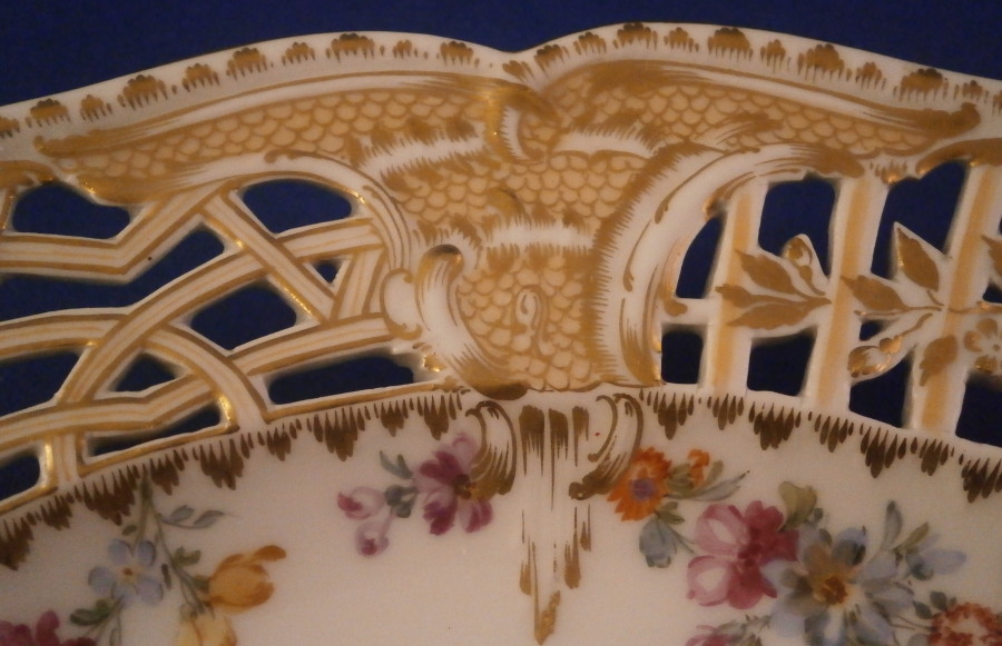 This is a superb reticulated dessert plate made by KPM in the early 20th century. Some of my favorite plates are from this service! The piece is decorated with the Potsdamer Stadtschloss decor including a hand painted nice larger floral arrangement including a red poppy and fancy carnations as well as floral swags along the edge of the well and alternating panels of two different reticulated designs. The reticulated panels are superb with lots of detail to the edges and the flowering branch is stunning. These panels a devided up by sold areas with designs that have some superb gold work some of which is on a raised design to the paste and go into the well of the plate. The gold work is amazing and makes this a stunning plate! Hard to describe all that detail so just ahve a look at the pictures! The plate is in perfect condition. It is marked underneath with the under glaze blue scepter mark as well as the over glaze red KPM orb mark showing it was painted by KPM and the usual impressed and artist marks as shown. The plate is 1.25 inches tall and 8.875 inches in diameter. Please email me for more information or other pictures.