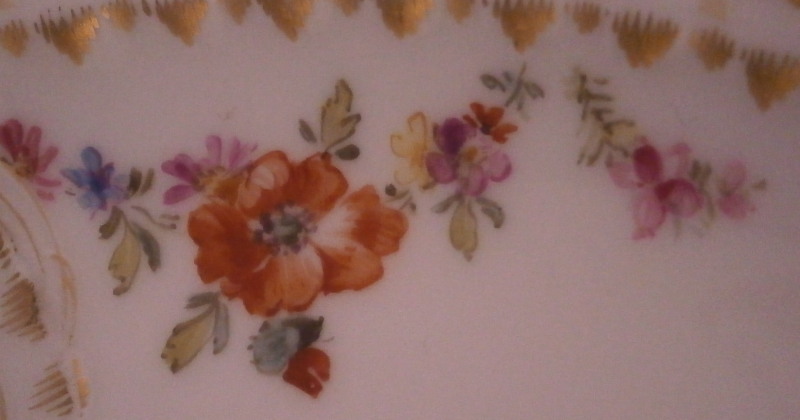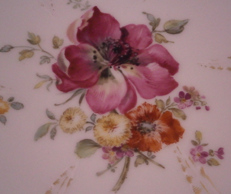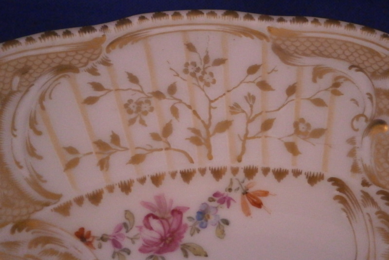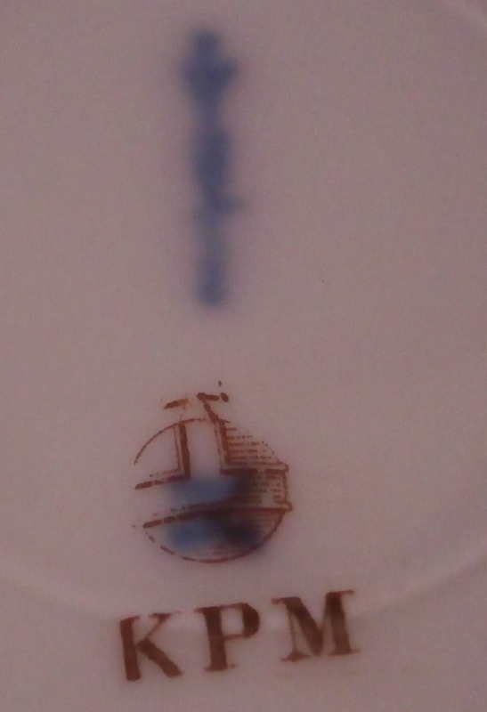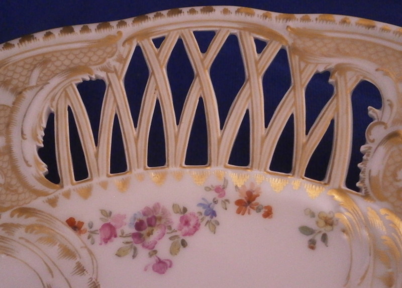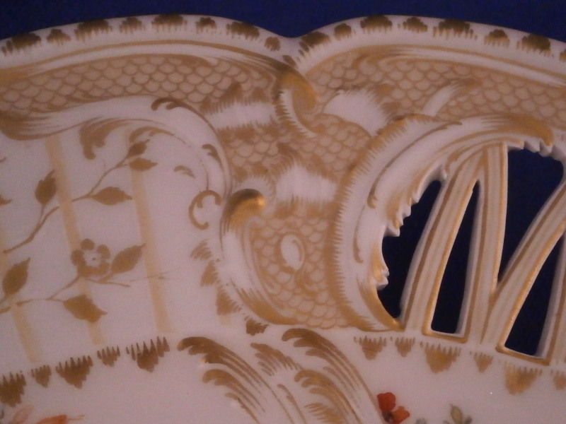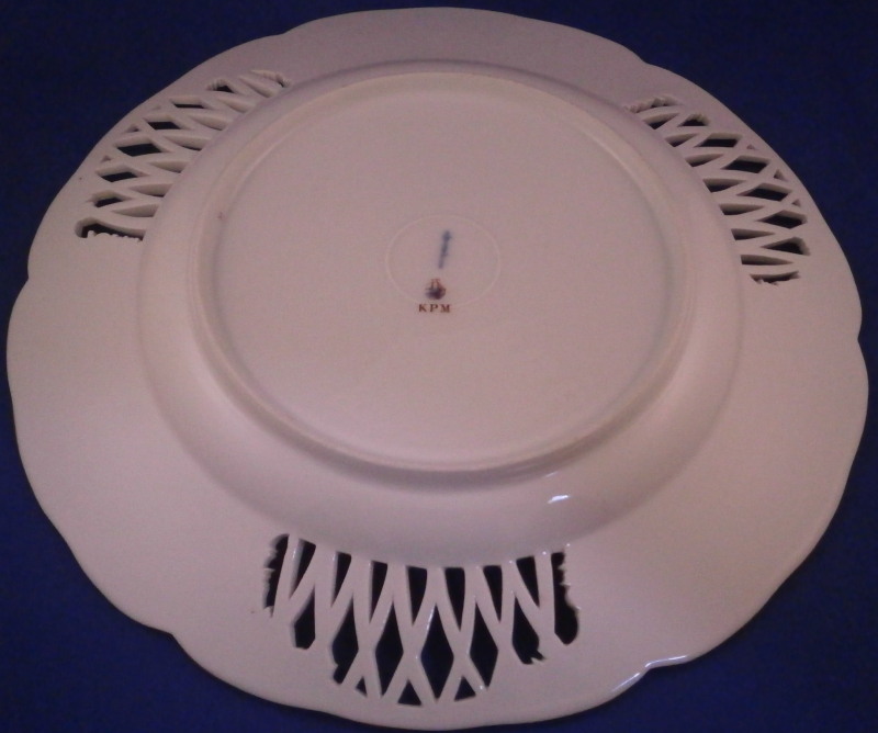 This is a superb reticulated plate made by KPM in the early 20th century. It is decorated with the Potsdamer Stadtschloss decor with this being the reticulated version which is much harder to find than the regular plates. The piece is hand painted with a nice larger floral arrangement including a purple anemone blossom in the center as well as floral garlands along the edge of the well and alternating panels of reticulated panels and panels with a gold flowering twigs design. The reticulated panels are superb with lots of detail to the edges and then there are the designs that break up the panels that have some superb gold work some of which is on a raised design to the paste and go into the well of the plate. The gold work is amazing and makes this a stunning plate! The plate is in perfect condition. It is marked underneath with the under glaze blue scepter mark as well as the over glaze red KPM orb mark showing it was painted by KPM and the usual impressed and painter's / gilder's marks as shown. The plate is 1.25 inches tall and 10.25 inches in diameter so the larger version of these plates! Please email me for more information or other pictures.