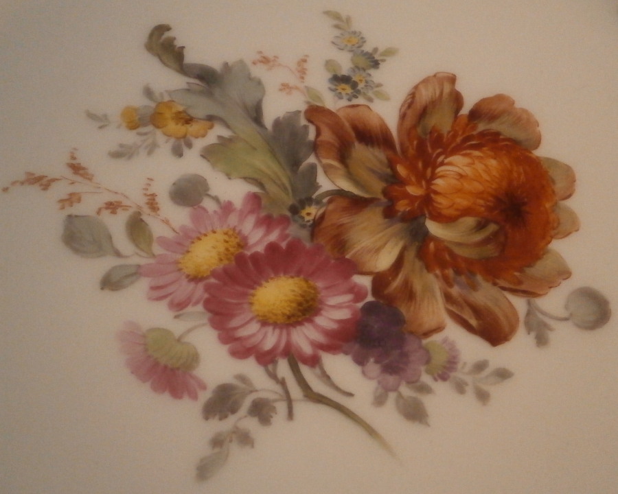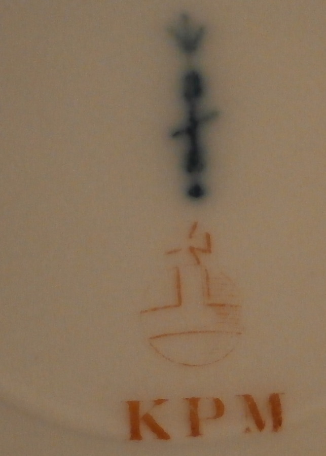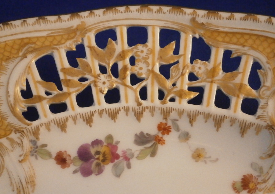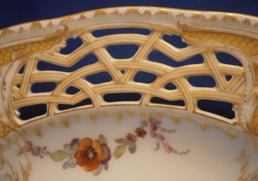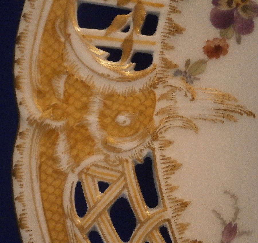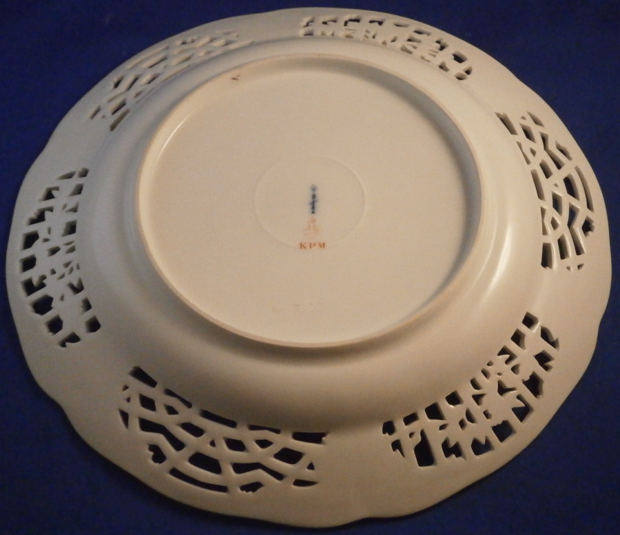 This is a superb reticulated plate made by KPM in the early 20th century. Some of my favorite plates are from this service! The piece is decorated with the Potsdamer Stadtschloss decor with this being the reticulated version which is much harder to find than the regular plates. The piece is hand painted with a nice larger floral arrangement in the center as well as floral garlands along the edge of the well and alternating panels of reticulated panels and panels with a gold flowering twigs design. The reticulated panels are superb with lots of detail to the edges and then there are the designs that break up the panels that have some superb gold work some of which is on a raised design to the paste and go into the well of the plate. The gold work is amazing and makes this a stunning plate! The plate is in perfect condition. It is marked underneath with the under glaze blue scepter mark as well as the over glaze red KPM orb mark showing it was painted by KPM and the usual impressed and gilder's / painter's marks as shown. The plate is 1.25 inches tall and 8.875 inches in diameter. Please email me for more information or other pictures.