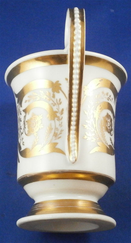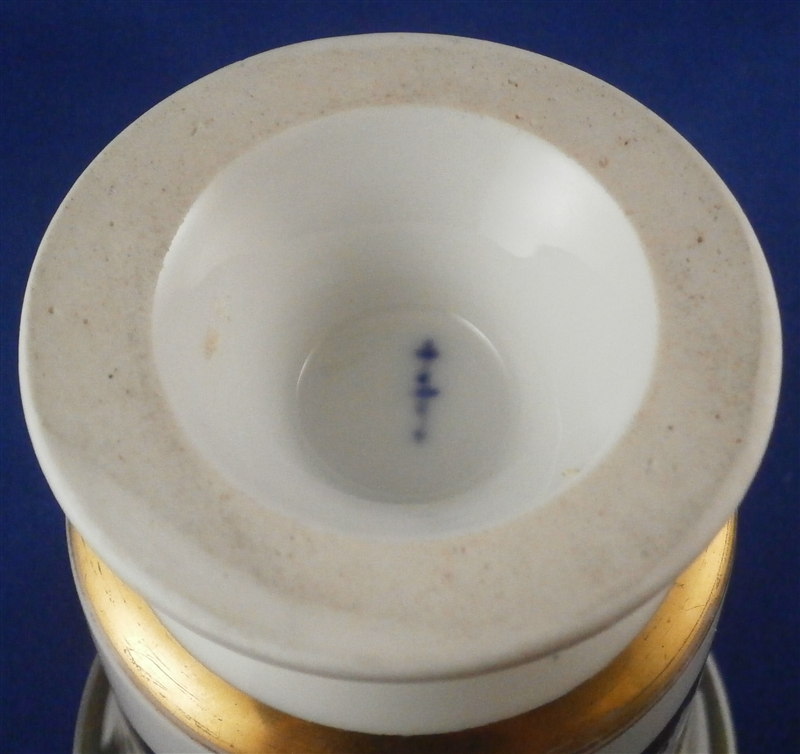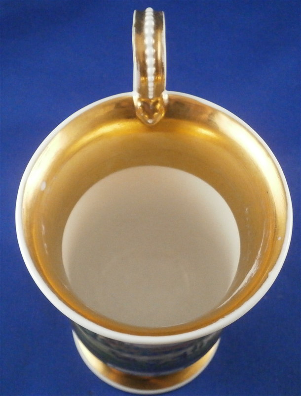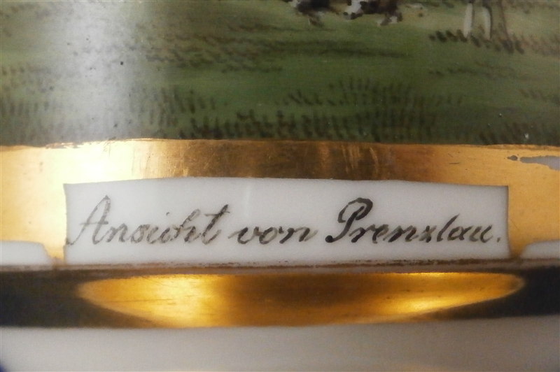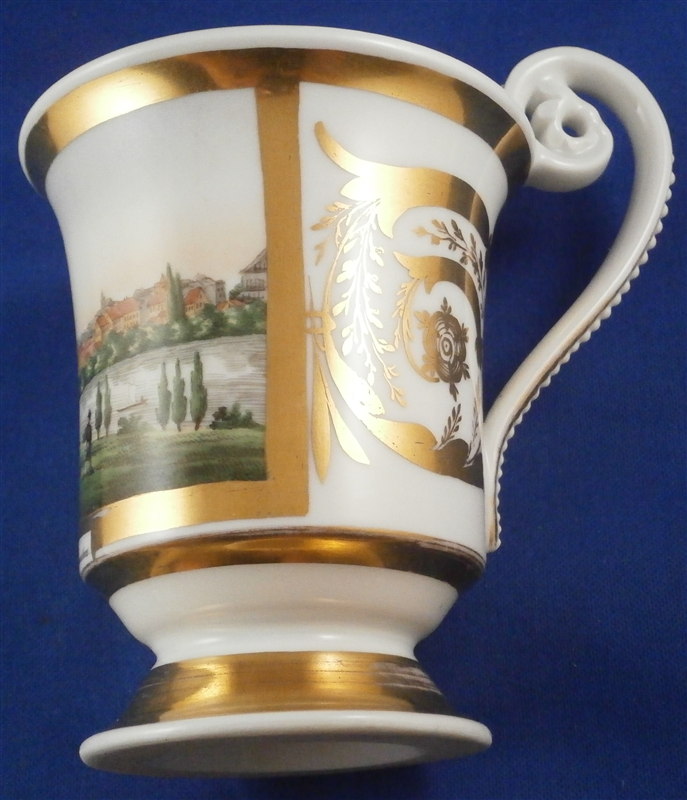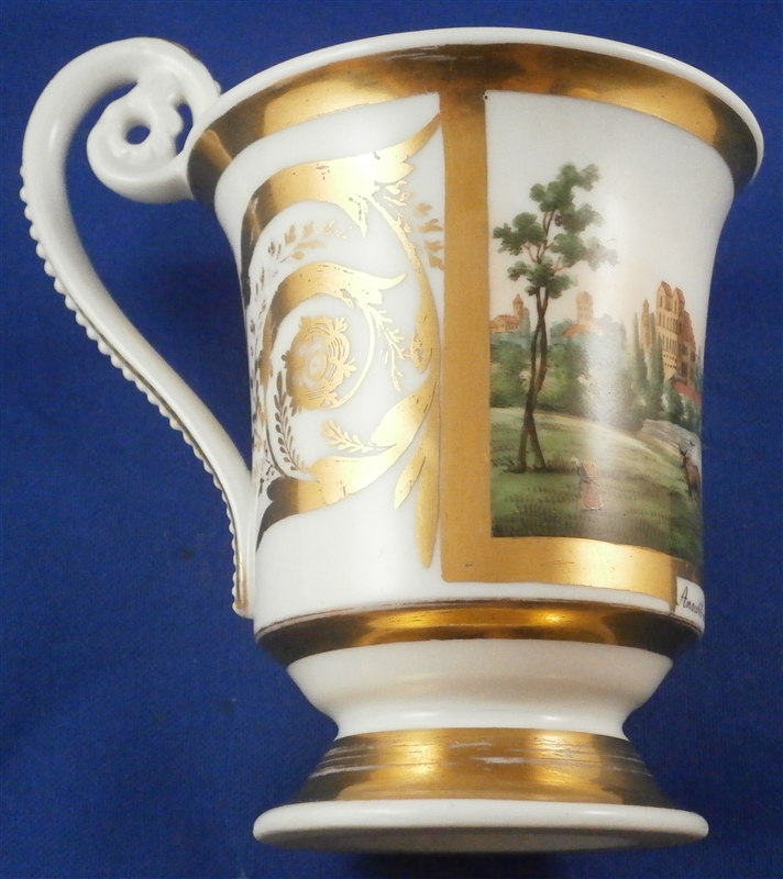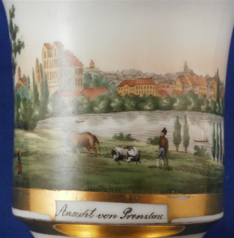 This is a great cup made by KPM in about 1830. It is hand painted with a superb scenic view of the city of Prenzlau which is in the state of Brandenburg which is a little bit north of Berlin . The scene is of nice quality and the rest of the cup has some nice gilding to it with the handle having a pearl design along it. The cup is 3.75 inches tall (4.5 including the handle) and 3.125 inches in diameter. The cup is in great condition with a bit of wear to the gilding. It is marked underneath with the underglaze blue scepter mark as shown. Please email me for more information or other pictures.