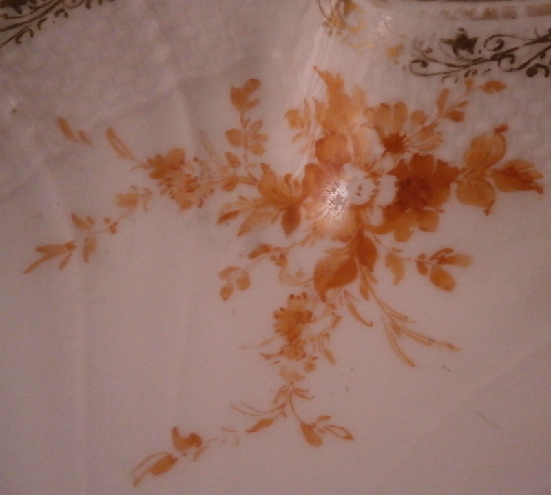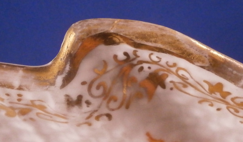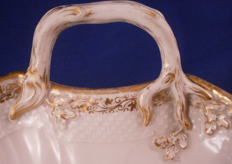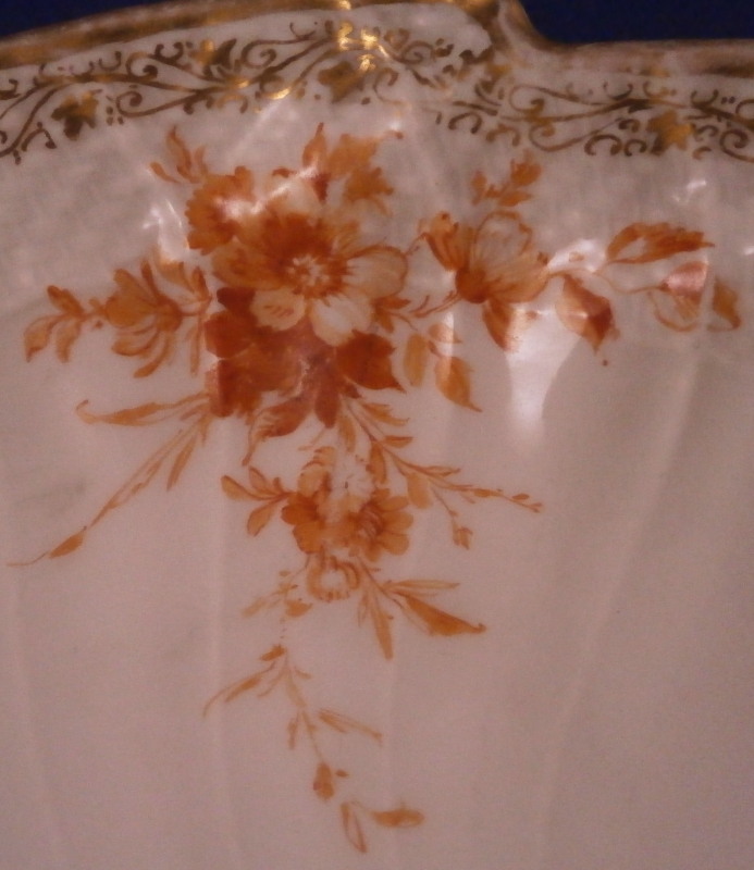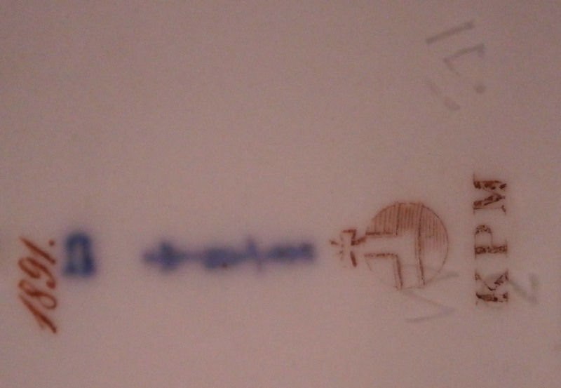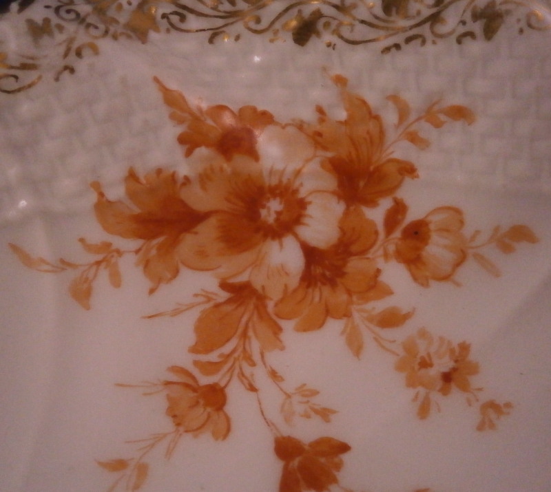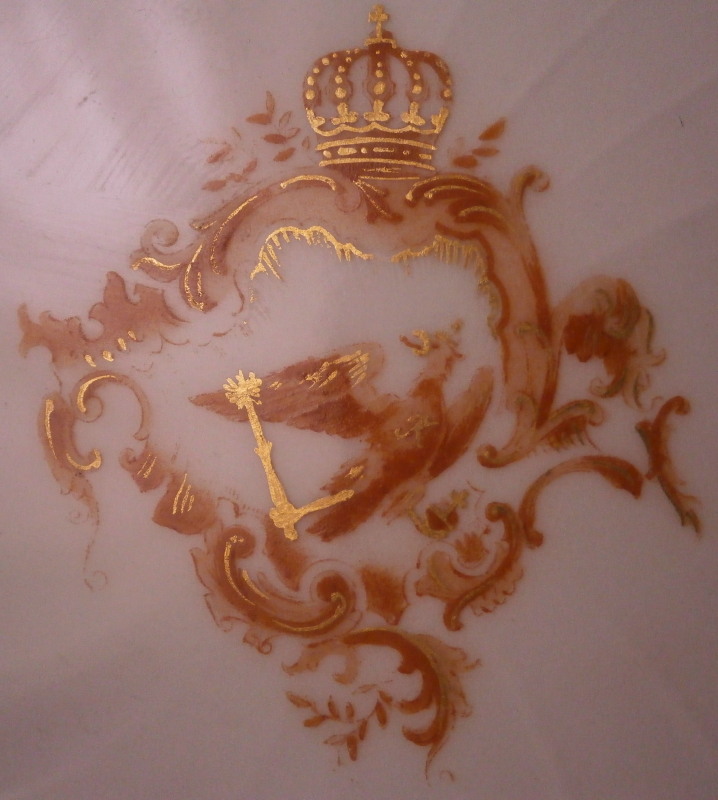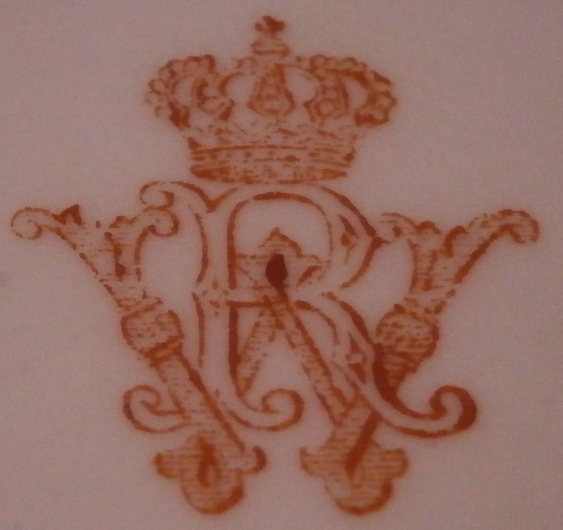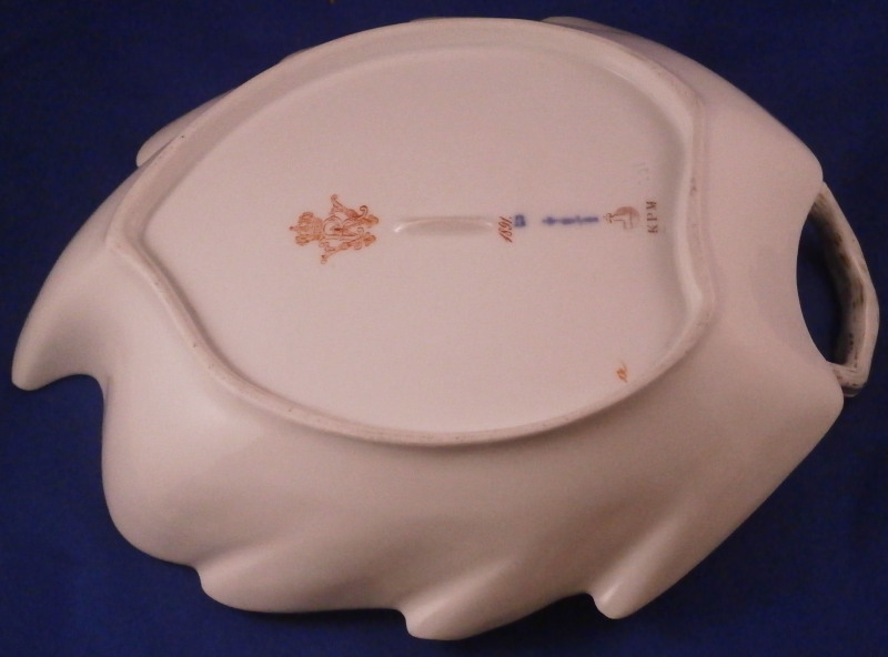 This is a plate made by KPM in the late 19th century (1891 to be exact) for Kaiser Wilhelm II . It is part of the famous Preußen Service aka Prussian Royal Table Service and has a nice leaf shape to it likely for serving small items like candy or baked goods. It is a nicely hand painted with three orange floral arrangements, a gold trim on a basketweave design along the edge, has a nice branch handle to one side ending in gilded leaves and the best part being the center which has an orange design to it including the Prussian eagle holding an orb and a scepter while wearing a tiny gold crown and the letters / monogram FR on its chest. FR stands for Fredericus Rex , Friedrich I King of Prussia - one of the most famous Kings of Germany before it was actually Germany. Another larger crown on top of the central design. The dish is in great condition with some wear to the gilding along the edge with a small spot of the edge ground downs a tiny bit to hide a firing flaw. That does not take away from the piece and was done at the factory. The piece is 2.375 inches tall at the handle, about 8.75 inches long and 7.25 inches wide. It's hard to find pieces like this from a royal service as they were much rarer than plates or cups. The dish is marked underneath with the under glaze blue scepter, the red orb as well as various artist and impressed marks and off course the cypher for Kaiser Wilhelm II in red with the year 1891 under it. Please email me for more information or other pictures.