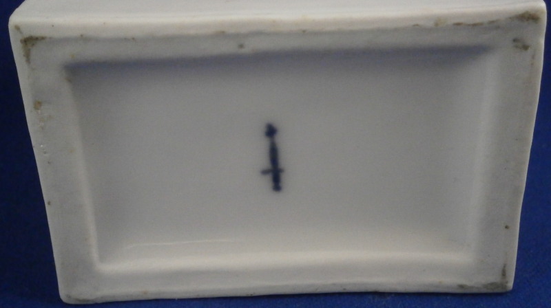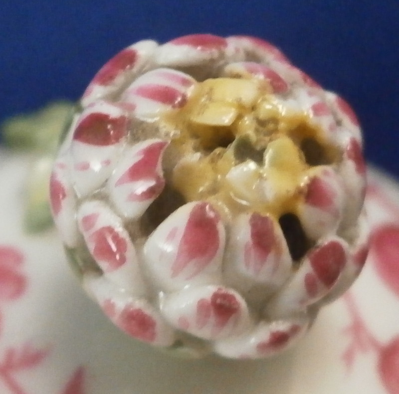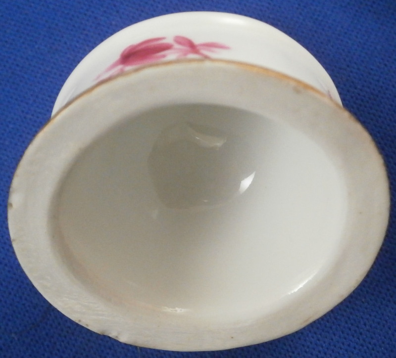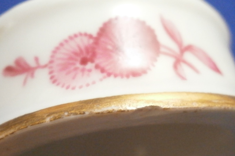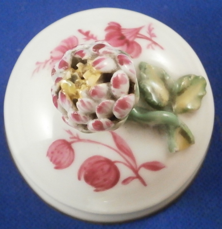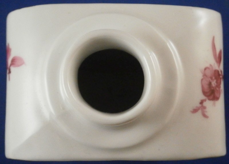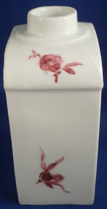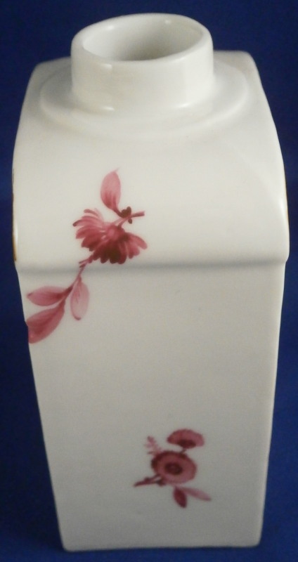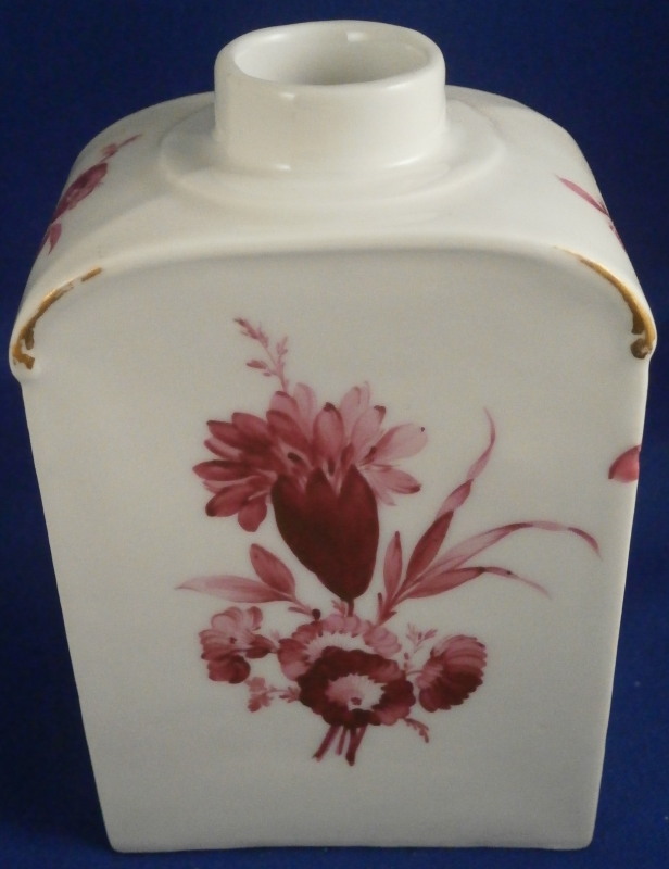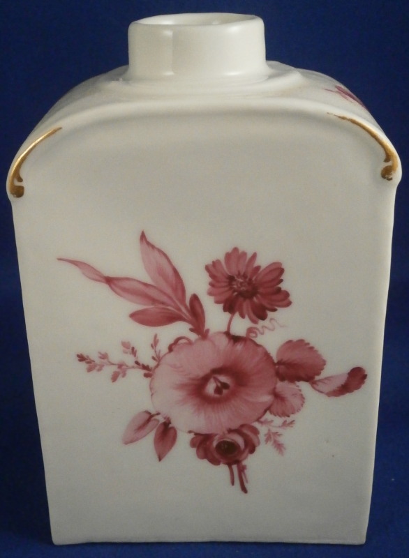 This is a tea caddy or jar with its lid made by KPM around 1800. It is hand painted with two large floral arragementsin puce as well as some smaller flowers along the sides and a bit of gold trim to the corners. The lid also has some puce flowers to the sides and top and a very nice flower finial. The caddy and lid are in superbt condition with some very minor wear to the gilding! One tiny petal might have a small chip to the very tip but it's hard to tell and the underside rim of the lid has a very minor flake to it. The piece is marked underneath with the under glaze blue scepter mark as shown. The tea jar is 5.125 inches tall with the lid in place, 2.75 inches wide and 1.875 inches deep. Please email me for more information or other pictures.