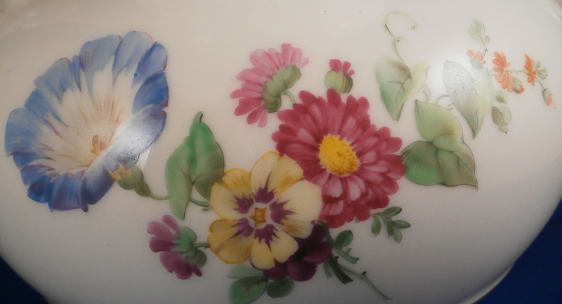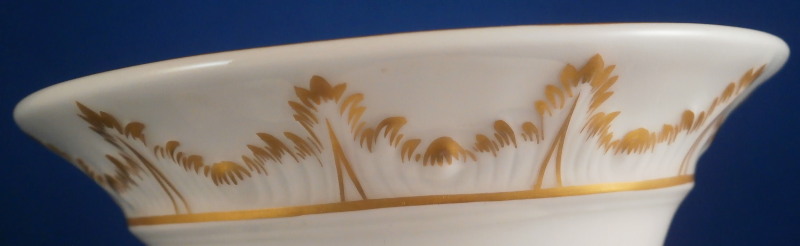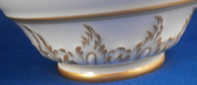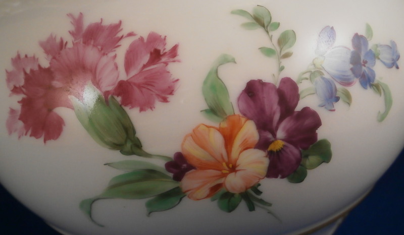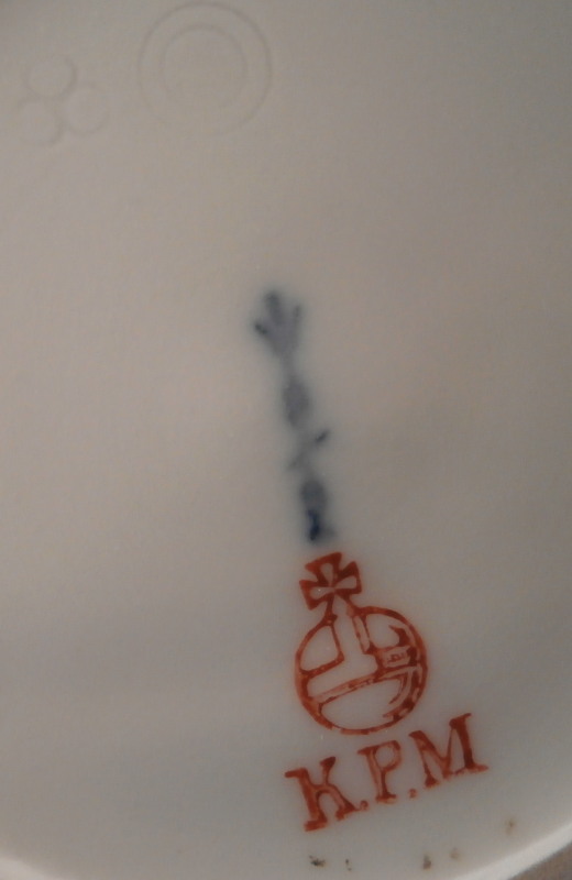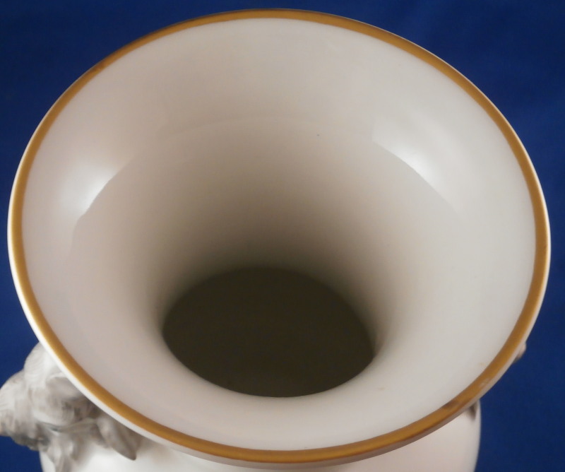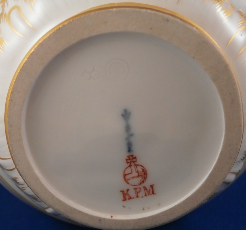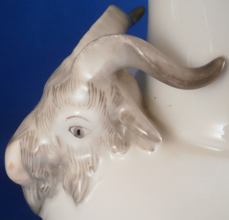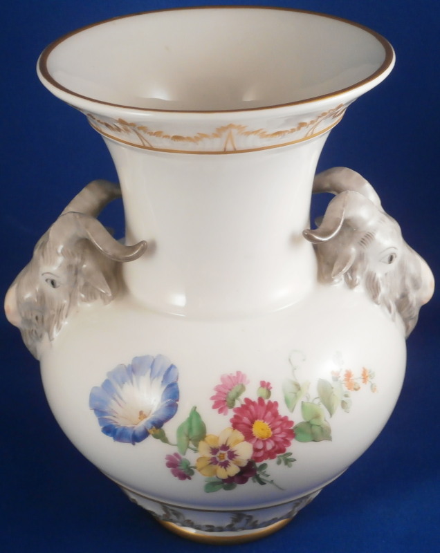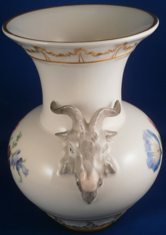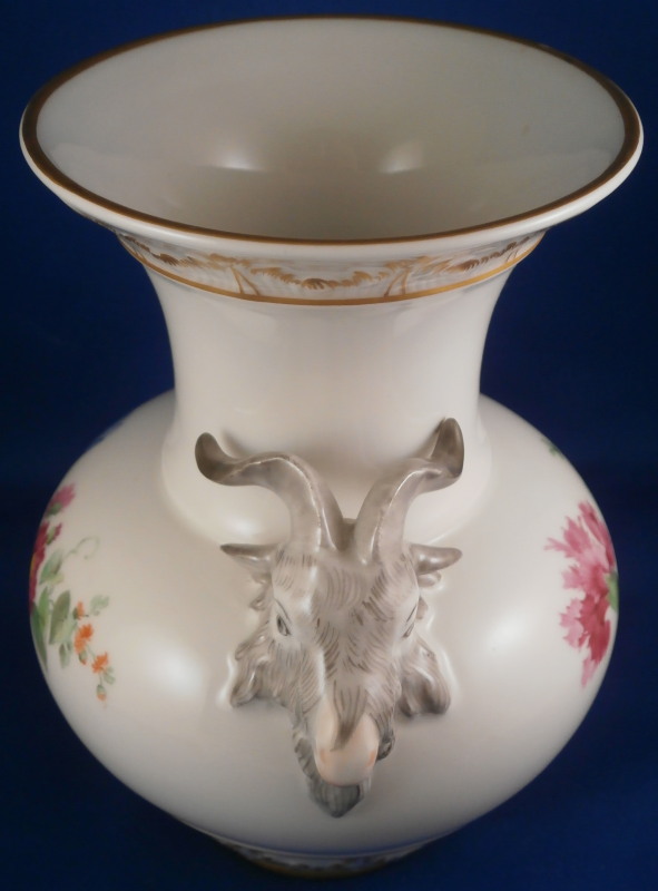 This is a fun vase made by KPM in the 20th century. I really enjoy this design since it is not just painted with flowers but also has a nice shape to it and those two handles on the sides are just superb! The vase is hand painted with two very nice floral arrangements, lots of gilding on raised designs, gold trim to the rims and two amazingly detailed goat / ram's heads on either side acting as handles. These are hand painted superbly mostly in grey tones - there are different colored versions of these. The piece is in perfect condition and is marked underneath with the underglaze blue scepter mark, the red orb as well as the usual impressed marks normal to this period. The vase is 6.625 inches tall, 5.75 inches from nose to nose and 4.75 inches in diameter. Please email me for more information or other pictures.
