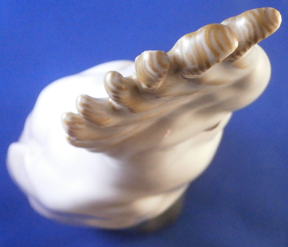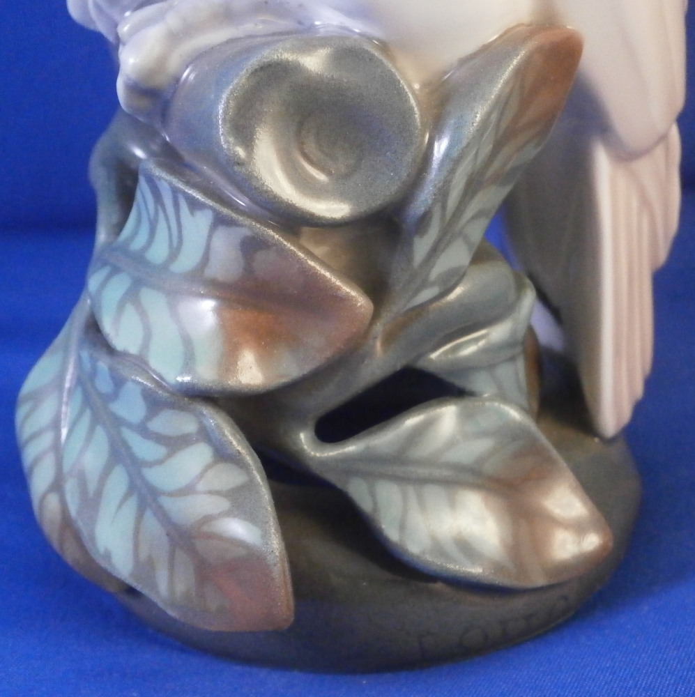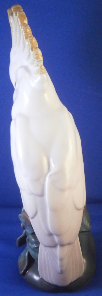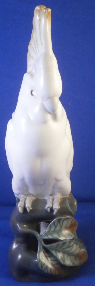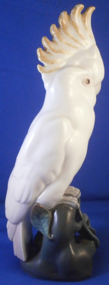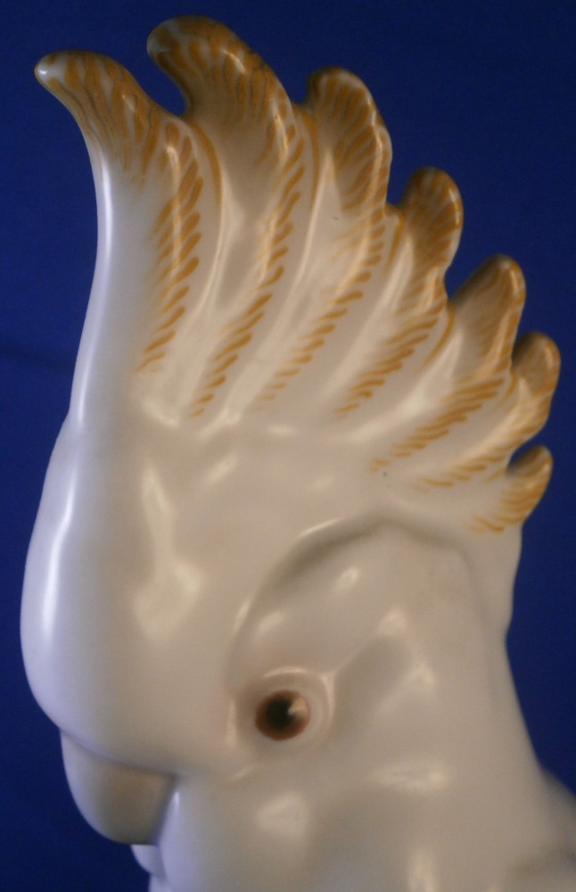 This is a superb cockatoo figurine made by KPM in the 20th century during the Art Nouveau / Jugendstil period. This figure comes in different decorations and this one here is the rarest and nicest. It was done in the under glaze colors only used during this period. The bird is very elegantly painted with a yellow plume, a nice base with leaves on it and a pinkish tail area. The figure is in perfect condition. He is 9.75 inches tall, 3 inches wide and 3.375 inches deep. The piece is marked underneath with the under glaze blue scepter, the under glaze blue orb mark only used for under glaze decorated pieces. as well as the usual impressed marks used during this period as shown. Please email me for more information or other pictures.