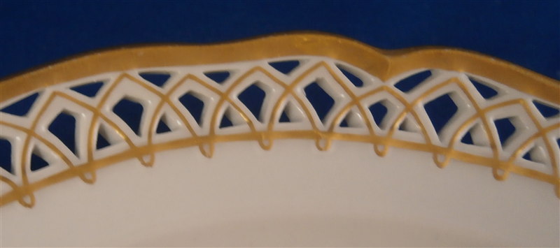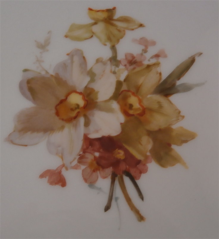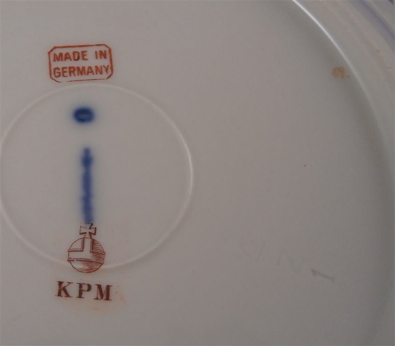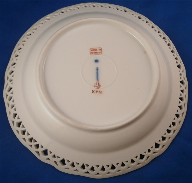 This is a nice little plate made by KPM in the early 20th century. It is handpainted with a very realistic floral arrangement in the center including Daffodils in the Weichmalerei colors of the Art Nouveau period plus the rim itself has a nice reticulated design to it that is highlighted with gilding. The plate is in perfect condition. It is 7.75 inches in diameter and 1.25 inches tall. The plate is marked underneath with the underglaze blue scepter, the red orb mark, a red rectangle with Made in Germany, painter's/gilder's marks and the usual impressed marks of the period. Please email me for more information or other pictures.