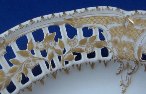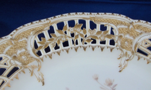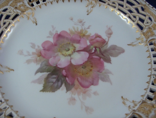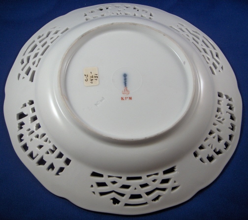 This is a reticulated plate made by KPM in the beginning of the 20th century. It is handpainted with a superb floral arrangement in the Weichmalerei style in the center, has a reticulated rim highlighted with a fancy gold design and is very elegant all around. The plate is in perfect condition and marked underneath with the underglaze blue scepter mark as well as the overglaze red KPM orb mark showing it was painted by KPM. Also some impressed marks typical of this time period. There are two painters marks on the footring. The plate is 1.25 inches tall and 8.75 inches in diameter. Please email me for more information or other pictures.