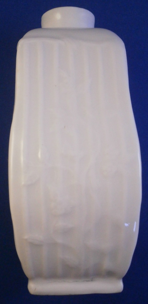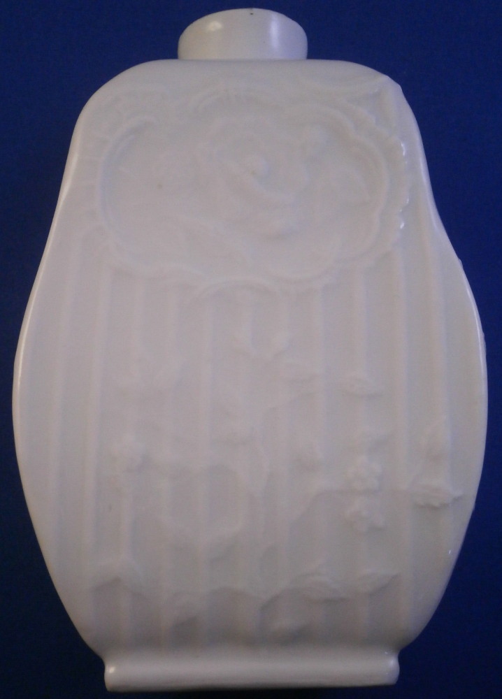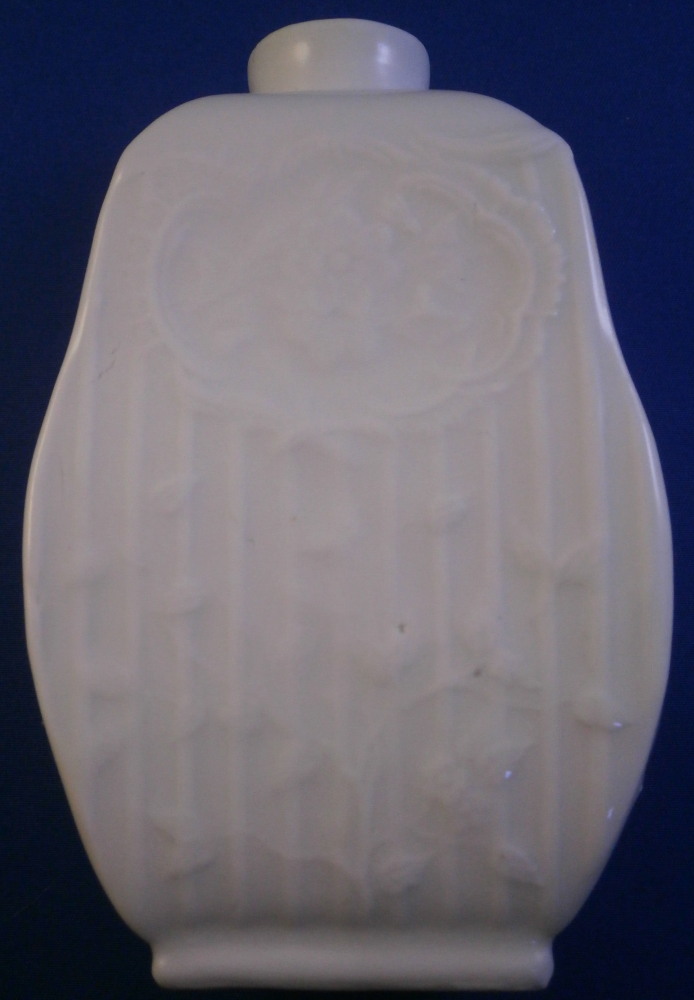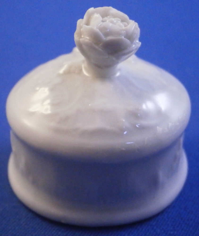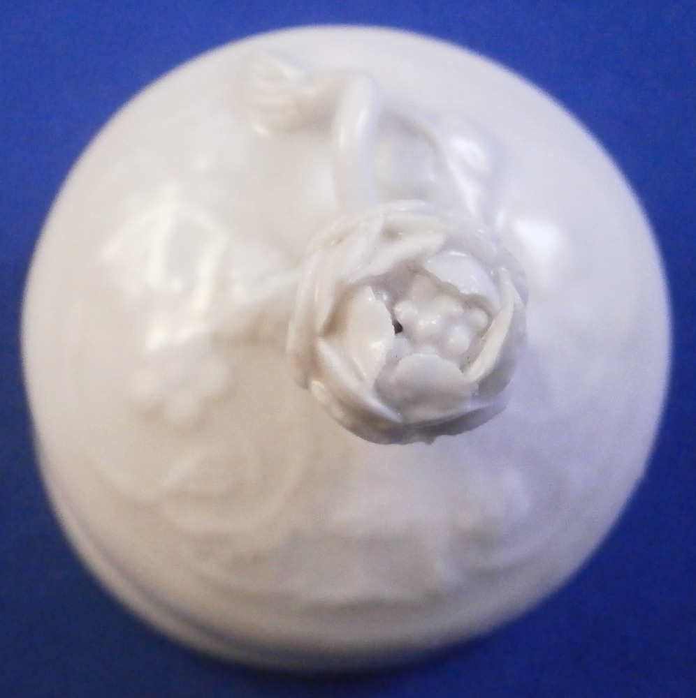 This is a tea caddy / jar with its lid made by KPM around 1800. I have seen this design called Rocaille and more commonly Reliefzierat. It was left in the white which was more appreciated back then but is decorated in relief with a trellise design that has vines with leaves growing up them and a floral design in a cartouche to the top front and back surrounded by scroll work. Nice design to the lid with a floral finial with stem and leaves. It's a great looking piece and not something I ahve come across from this period but you can find the newer versions quite easily. The caddy and lid are in superb condition with no real issues I can find. Maybe a tiny chip to the finial and a few minor firing faults common to these early pieces but no real damage. It displays perfectly! The piece is marked underneath with the under glaze blue scepter mark as shown as well as the usual impressed numbers and lines. The tea jar is 5.375 inches tall with the lid in place, 2.875 inches wide and 1.875 inches deep. Please email me for more information or other pictures.