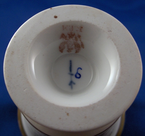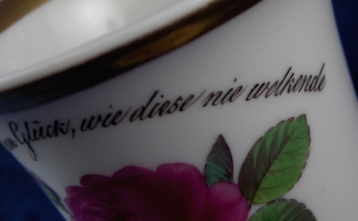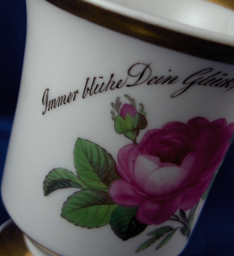 This is a cup made by KPM in the 1820's. It is handpainted with a superb rose flower in the front as well as a saying - Immer bluehe Dein Glueck , wie diese nie welkenede which means may your luck always blossom like this never wilting (insert rose at the end). The flower is of very high quality and the rest of the cup has some nice gilding and a fancy handle also highlighted with gilding. The cup is 3.625 inches tall (4.75 including the handle) and 3.125 inches in diameter. It is marked underneath with the underglaze blue scepter as well as the iron red eagle mark and a blue painters mark. Please email me for more information or other pictures.