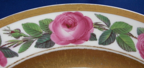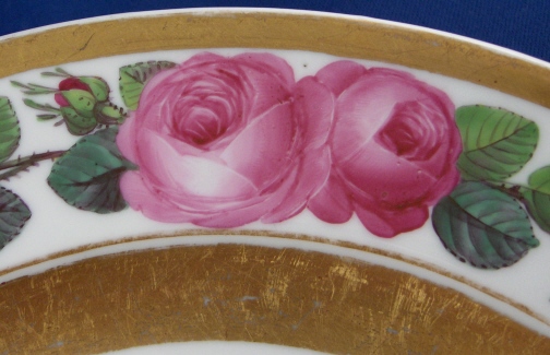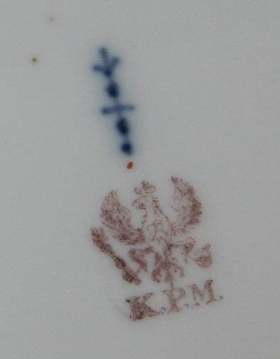 This is a fun plate made by KPM around the 1820's. It is handpainted with a ring of roses all around the rim with some gold trim to either side. The roses are extremely well painted and really very elegant! The plate is in great condition with a bit of wear to the gilding. To be expected after almost 200 years :) The plate is marked underneath with the underglaze blue scepter as well as the iron red eagle mark used before they introduced the red orb mark. Also the usual impressed marks of the period as shown. The piece is 1.375 inches tall and 9.5 inches in diameter. Please email me for more information or other pictures.