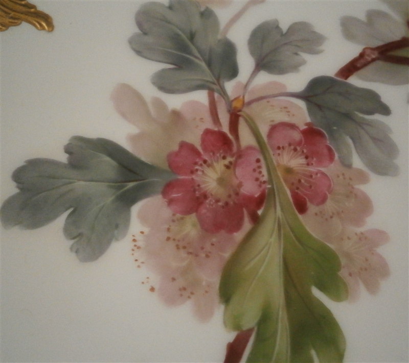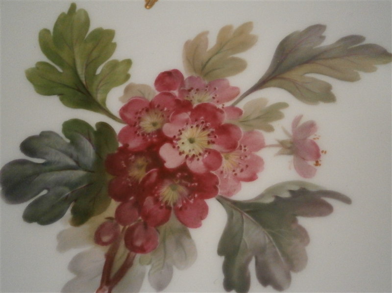 This is a plate made by KPM in about 1912. It is hand painted with the rarest design on these plates of this style - the tree branch / leaf motif. This one is of branch of a Hawthorn tree including its leaves and branch but also the flwoers which makes this one really superb plate and one of my new favorite's of this style! Kind of the German version of the Flora Danica :) Just an amazingly detailed painting and the with rim painted with gold on a raised design it is just spectacular. The plate is in perfect condition. It is 8.5 inches in diameter so a nice size and 0.875 inches tall. The plate is marked underneath with the under glaze blue scepter, the red orb mark, some black numbers, a painter's and a gilder's mark, the usual impressed marks of this period and the name of the tree - Rotdorn in black script. Please email me for more information or other pictures.