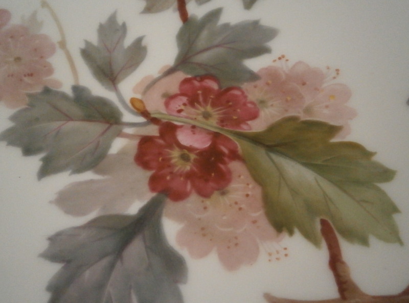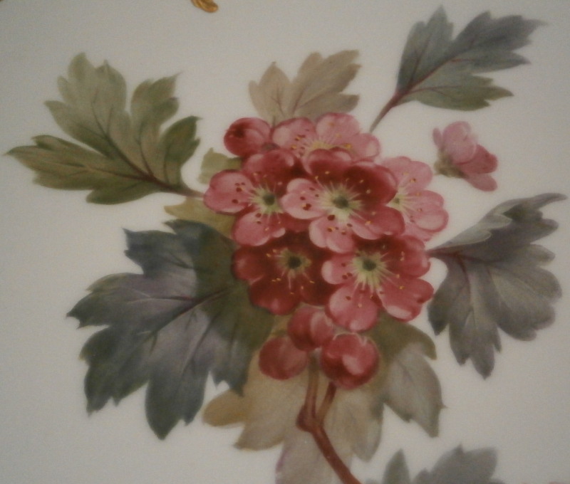 This is a plate made by KPM in the early 20th century. It is hand painted with the rarest design on these plates of this style - the tree branch / leaf motif. This one is of branch of a Hawthorn tree including its leaves and branch but also the flwoers which makes this one really superb plate and one of my new favorite's of this style! Kind of the German version of the Flora Danica :) Just an amazingly detailed painting and the with rim painted with gold on a raised design it is just spectacular. The plate is in perfect condition with a spot of two of minor wear to the gilding. It is 8.625 inches in diameter so a nice size and 1 inch tall. The plate is marked underneath with the under glaze blue scepter, the red orb mark, some black numbers, a painter's or gilder's mark, the usual impressed marks of this period and the name of the tree - Rotdorn in black script. This one has a plate hanger attached. Normally I would take them off but this one is a nice design and shouldn't harm the plate so it can be used and makes for an easy way to display the piece on the wall! Please email me for more information or other pictures.
