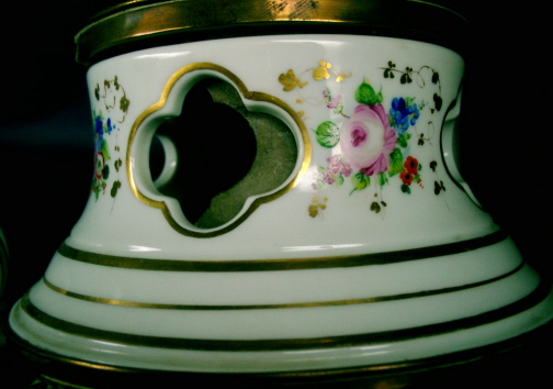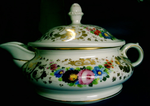 This is a Samovar or early coffee/tea machine made by KPM around 1845. It is handpainted with a nice floral garland design and a detailed gold trim. A rare find and it is complete which I have never seen again. The piece is in good condition with a small firing crack on the top rim of the bottom piece. Marked underneath the pot with the underglaze blue eagle carrying the orb and scepter with KPM underneath. Also incised III , III u and incised A on various parts. The entire setup is 13.75 inches tall and has a maximum diameter of 7.5 inches. Please email me for more information or other pictures.