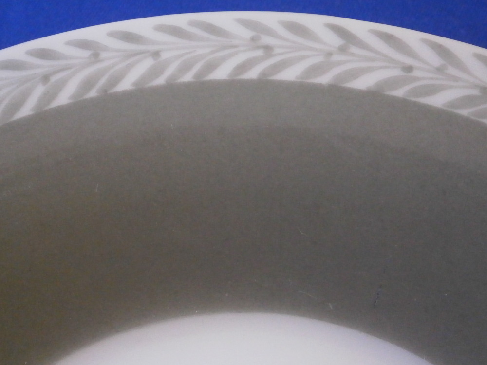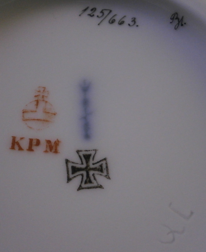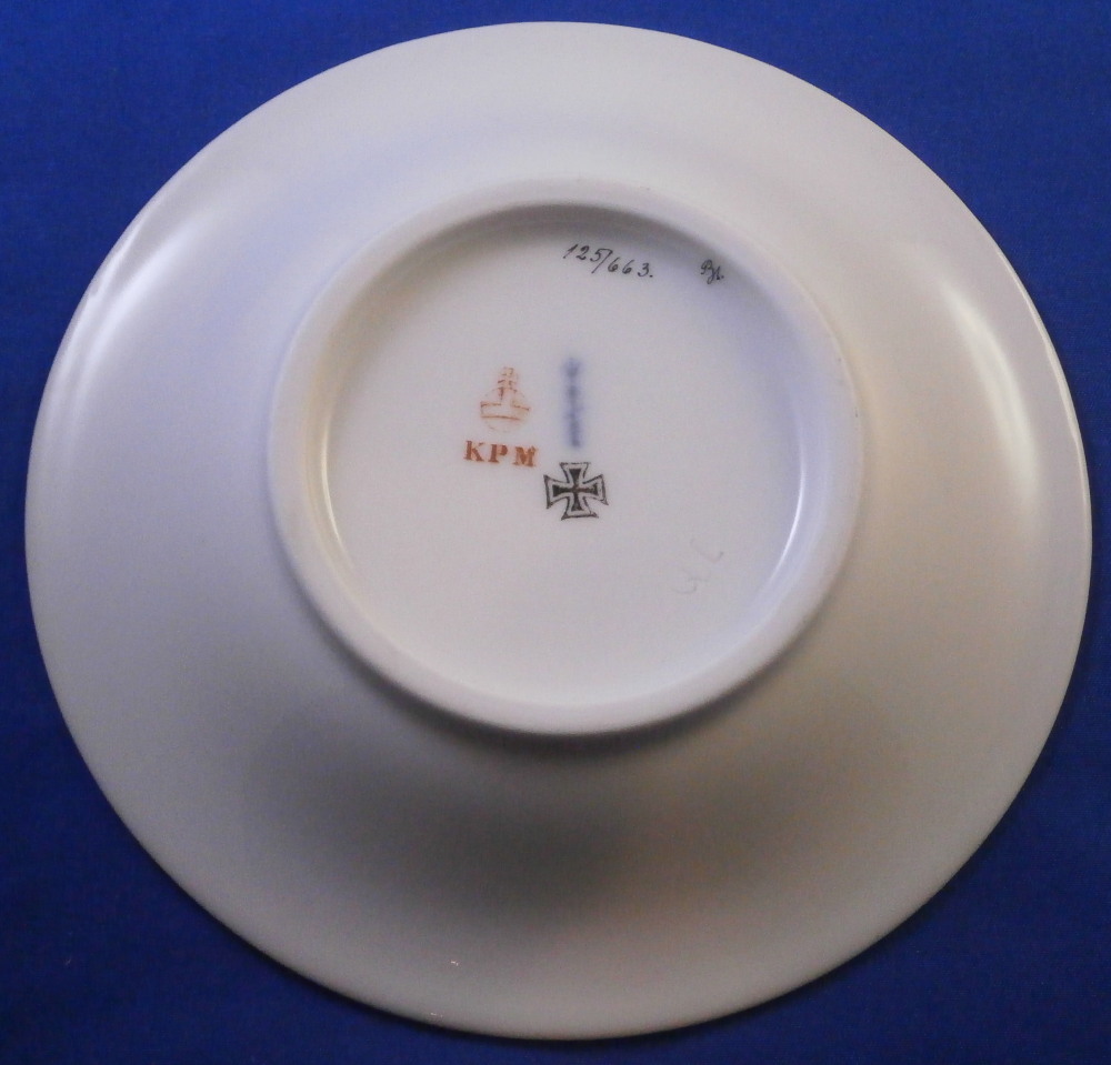 This is a saucer made by KPM in the early 20th century during WWI at the end of the Art Nouveau / Jugendstil period. One usually sees this type of design for the cups with the large Iron cross on them but most of the time the leaf garland design along the rim is done in gold which is not the case here. The saucer is decorated with a thick greyish band around the well and that leaf design along the edge in the same color. No gilding at all. The cups usually had three claw feet. The piece is marked underneath with the under glaze blue scepter mark as well as the red orb and the iron cross plus various painted and impressed marks as shown. It is in perfect condition. The saucer is 0.875 inches tall and 5.625 inches in diameter. Please email me for more information or other pictures.