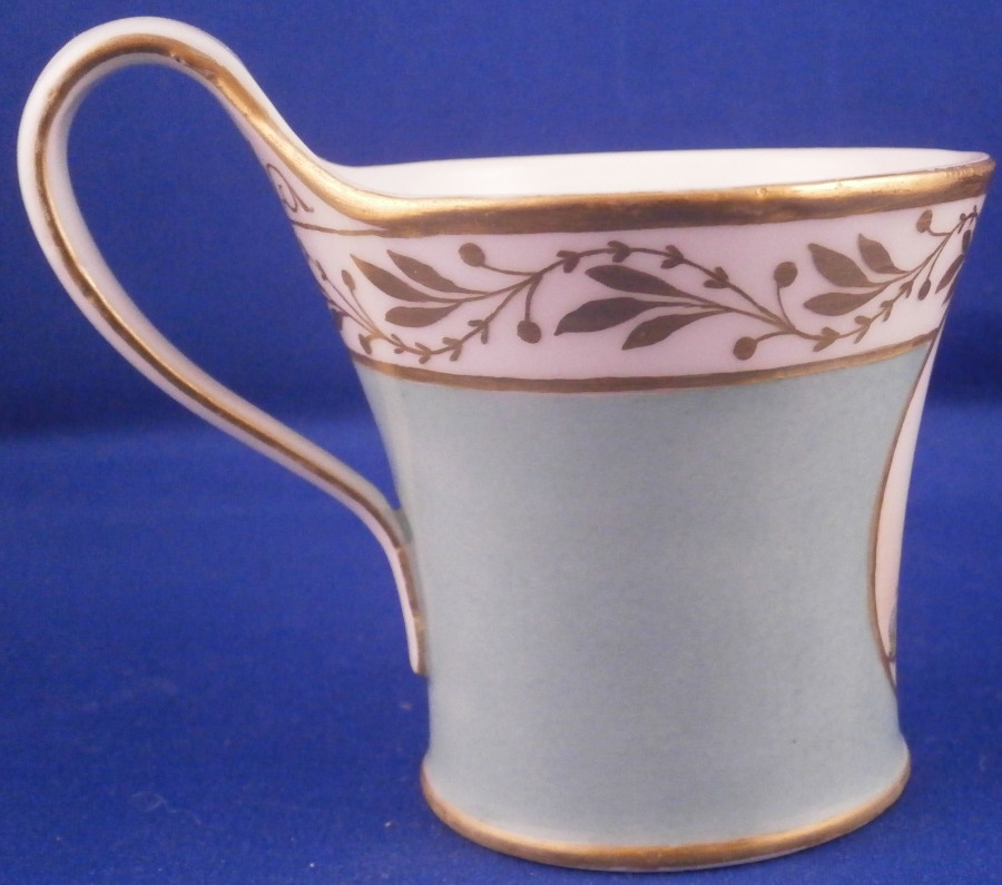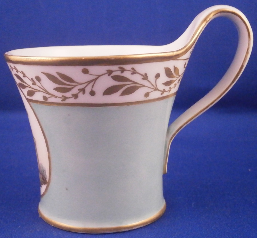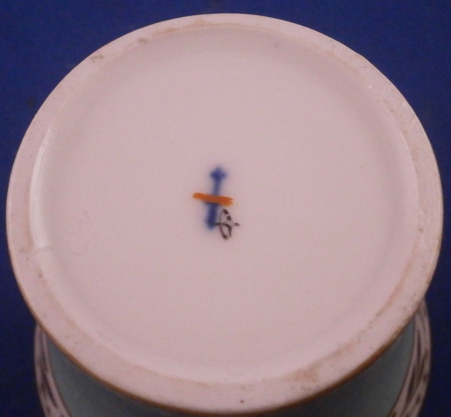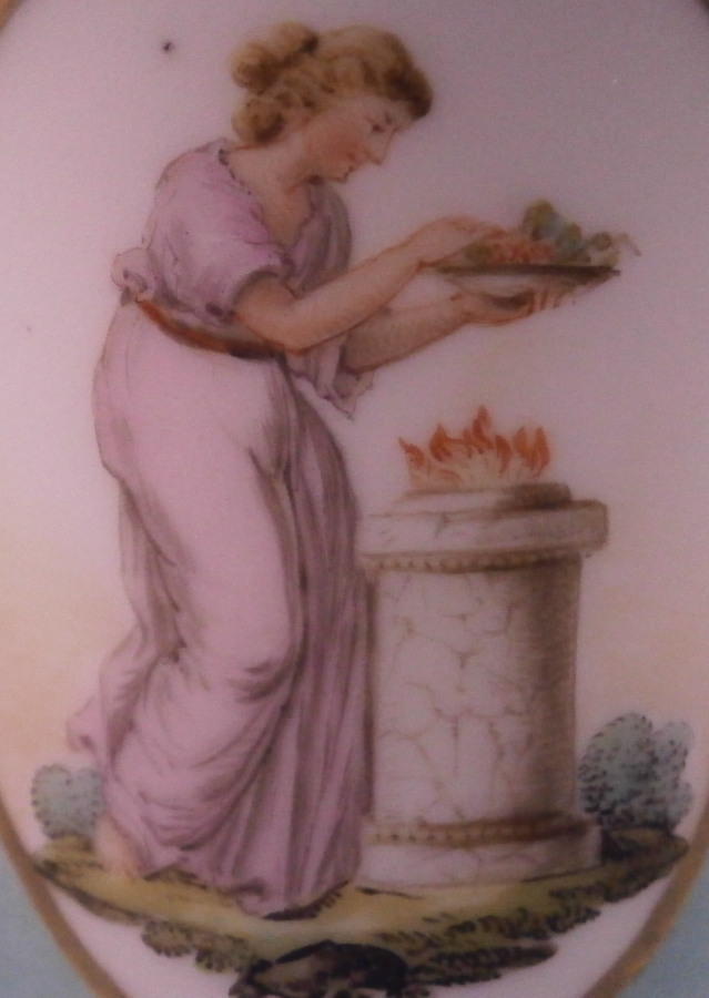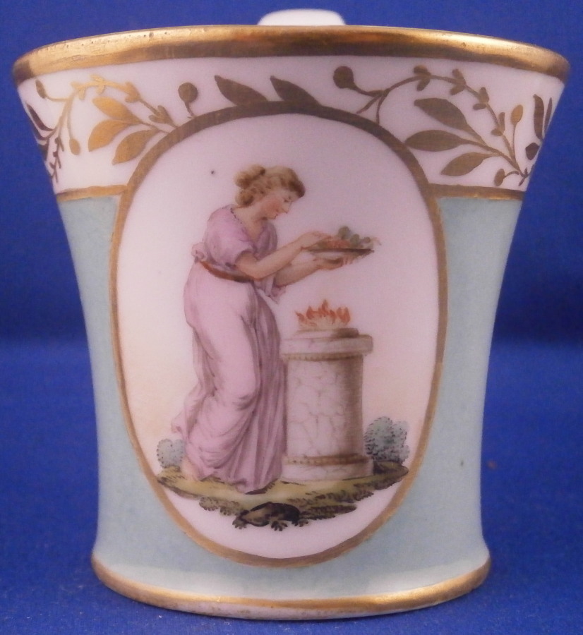 This is a really nice cup and saucer made by KPM in the early 19th century during the Biedermeier period. It was made before they used their red orb mark thus you only have the blue scepter and impressed marks / painter's marks most of the time. The style of the cup is really very sleek with that destinctive handle shape from this period. Both pieces are hand painted with a turquoise ground color and gold leaf and berry garland trim but the best part is that superb scene to the front of the cup of a lady making some offerings with a fire on top of a column. Really well done and together with the nice shape make this a superb set! Both pieces are in great condition with just some wear to the gilding of the saucer mostly. The cup is just under 3.25 inches tall including the handle and 2.875 inches in diameter. The saucer is 1 inch tall and 5.25 inches in diameter. Both pieces are marked underneath with the underglaze blue scepter mark as well as a painter's marks on the cup and some impressed numbers to both pieces. Please email me for more information or other pictures.