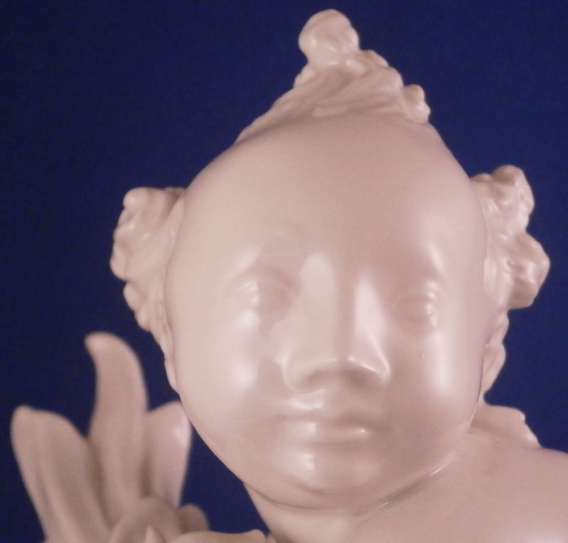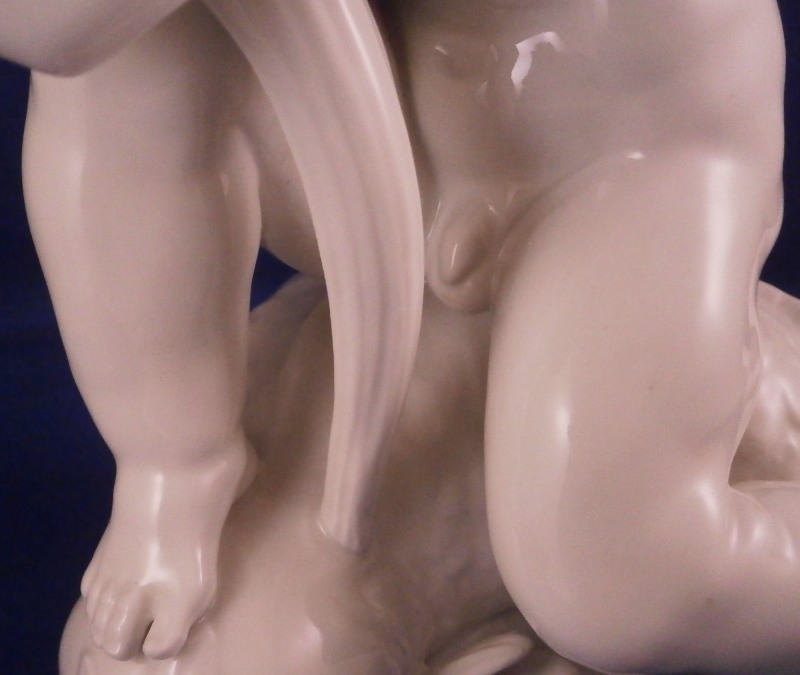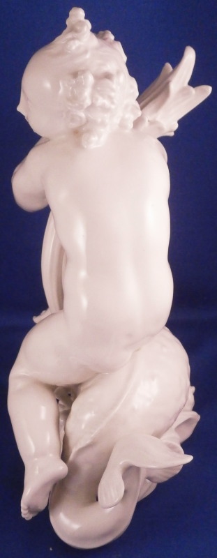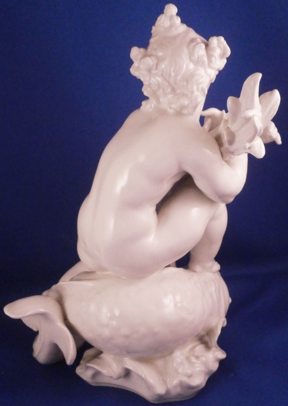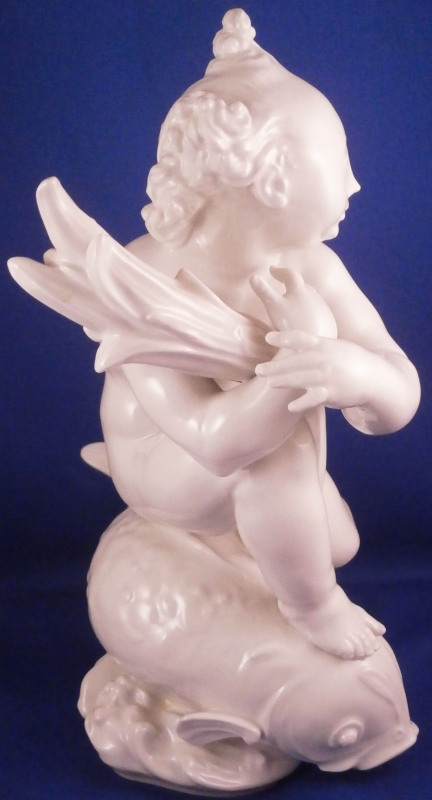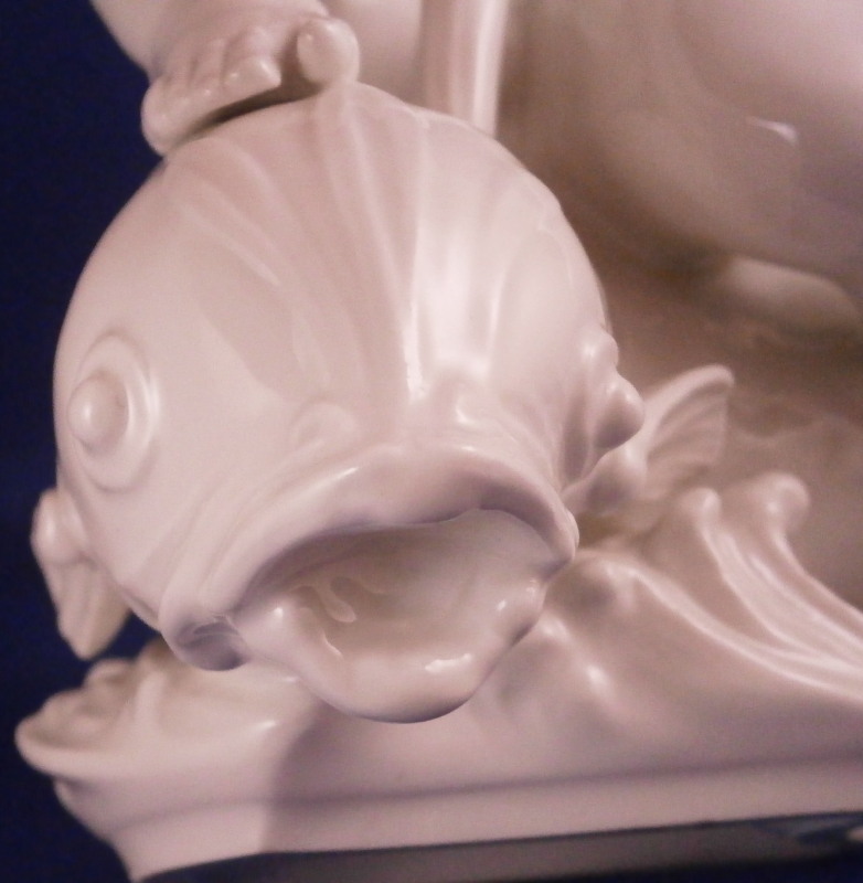 This is really nice and large blanc de chine figurine first modeled by Paul Scheurich in the early 1940's and made by KPM in 1943 if I read the date code correctly. Part of the " birth of beauty " series it is of a male putto riding a dolphin with water underneath while holding a bit of greenery in his arms. A truly fun figure to look at and very typical of his work! Very well modeled with lots of detail and left in the white to show it all off. The figurine is in perfect condition. It is 8.5 inches tall, 6.25 inches deep and 5.5 inches wide. It is marked with the under glaze blue scepter mark as well as the usual impressed marks of the period as shown. Please email me for more information or other pictures.
