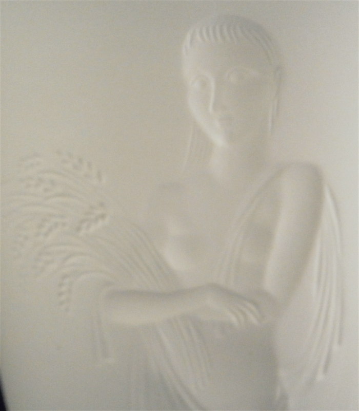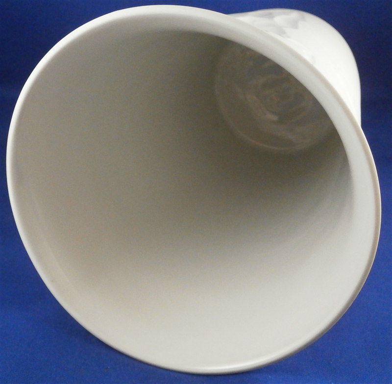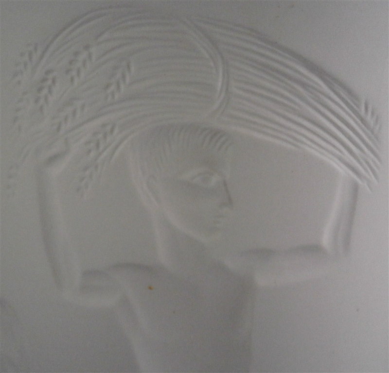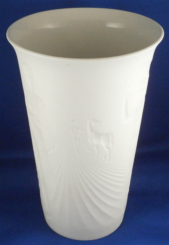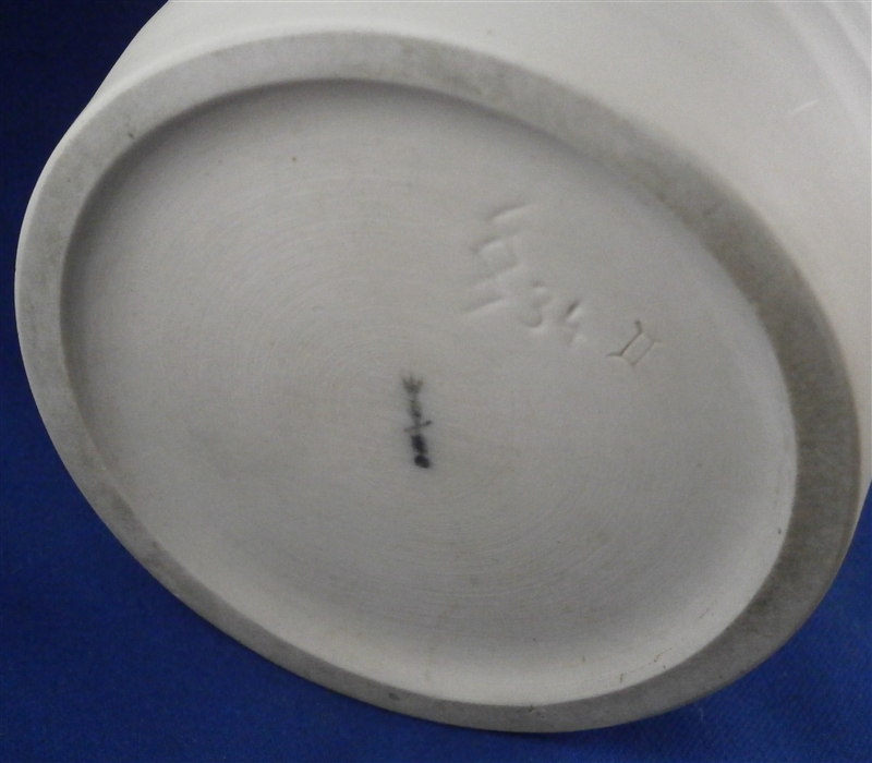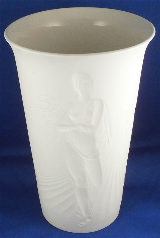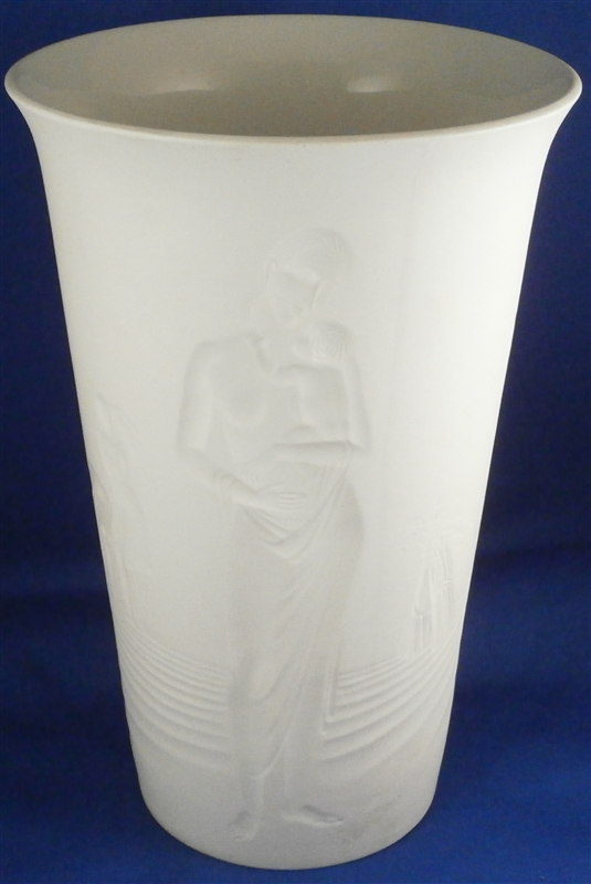 This is a nice vase made by KPM around the mid 20th century. The vase is called a Harvest Vase and it is made of unglazed biscuit porcelain on the outside and glazed on the inside so it can hold water. The outside has a superb design depicting different people at harvest time. A man holding wheat over his head, a lady with a baby and a lady holding wheat in her arms as well as some other smaller motifs. This is really a superb design and a very popular one for this period - it was designed first in 1933 by Siegmund Schütz . The vase is 8.50 inches tall and 5.5 inches in diameter. It is marked underneath with the blue scepter, the initials of Siegmund Schuetz as well as a number 34 and a date mark though I cannot figure out which date this one represents. It is in perfect condition! Please email me for more information or other pictures.