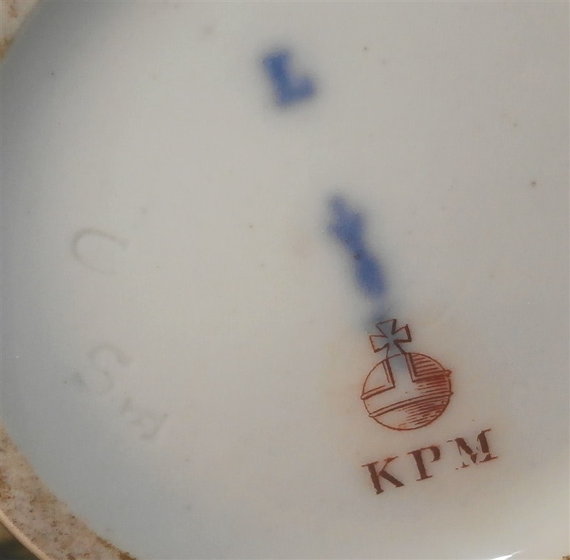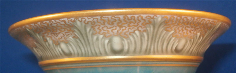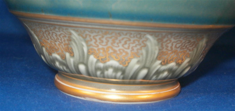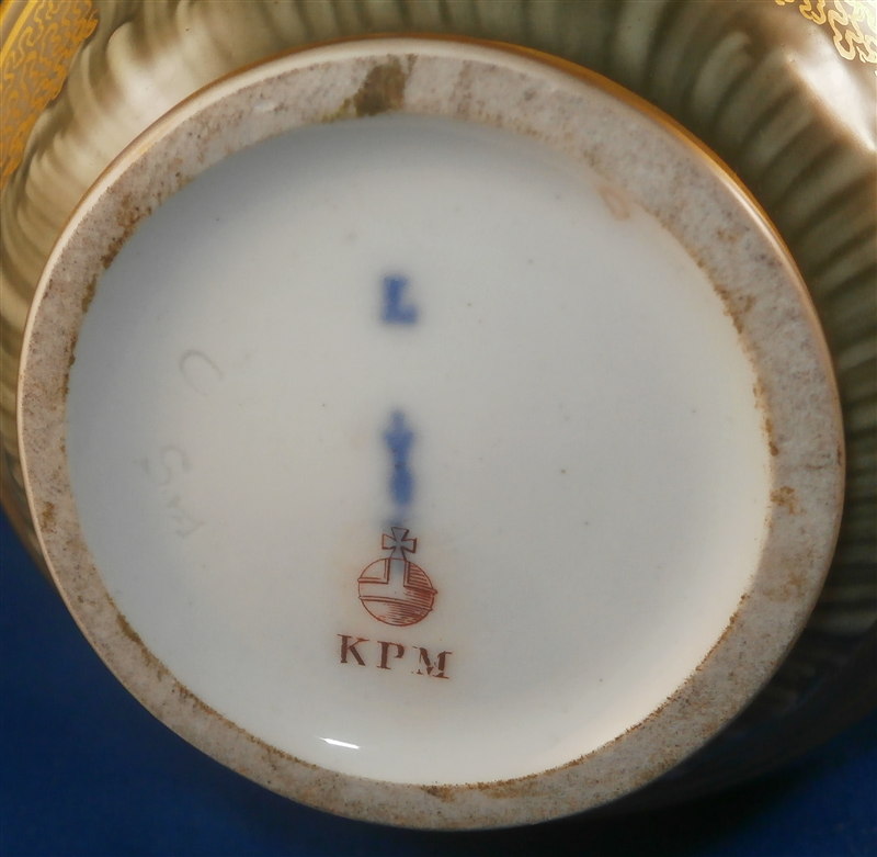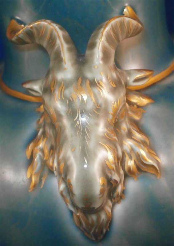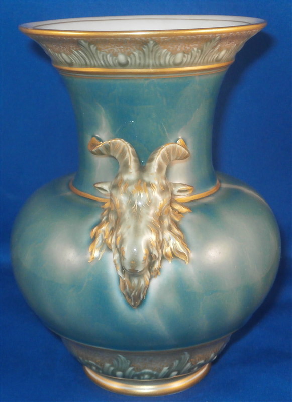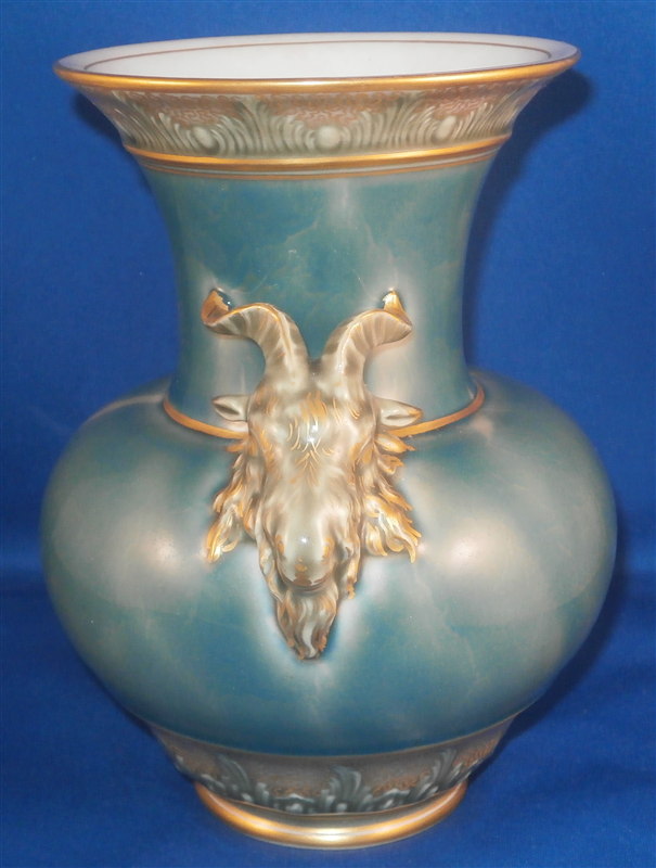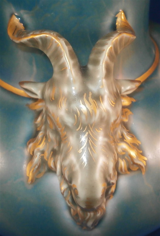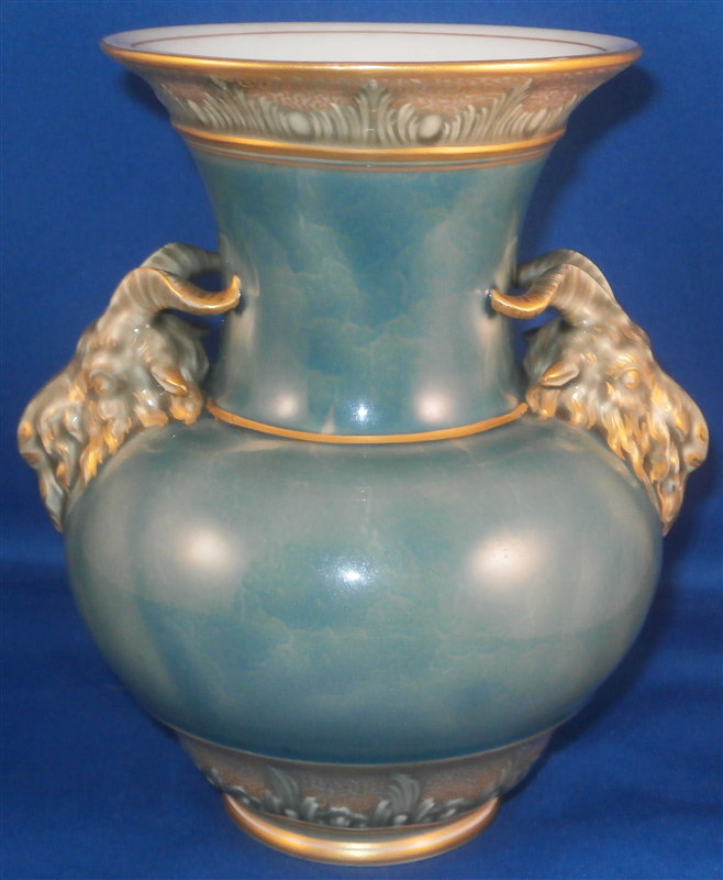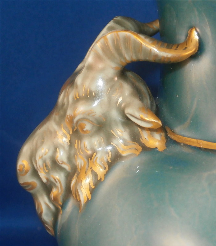 This is a superb vase made by KPM in the early 20th century in the Art Nouveau / Jugenstil period. The piece is handpainted with one of the Seger glazes whose depth of color is just amazing with the top layer being a turquoise type color and the bottom greyish color coming through in spots kind of like the currently popular crackle glazes for your house except is is perfectly smooth. Seger was quite famous for these new colors and glazes often copying earlier Chinese ones like the Sang du Boef (Oxblood) that no one else managed to copy until he came along. The shape of the vase is superb with a ram's / goat's head on either side forming the handles. Lots of nice gold highlights finishes off this perfect and elegant piece! The vase is in perfect condition. It matches another different shaped piece I own. The vase is 6.5 inches tall, 5.75 inches wide and 4.75 inches deep. The bottom is marked underneath with the underglaze blue scepter as well as the red orb mark, the usual impressed letters and numbers and an underglaze blue L. Please email me for more information or other pictures.