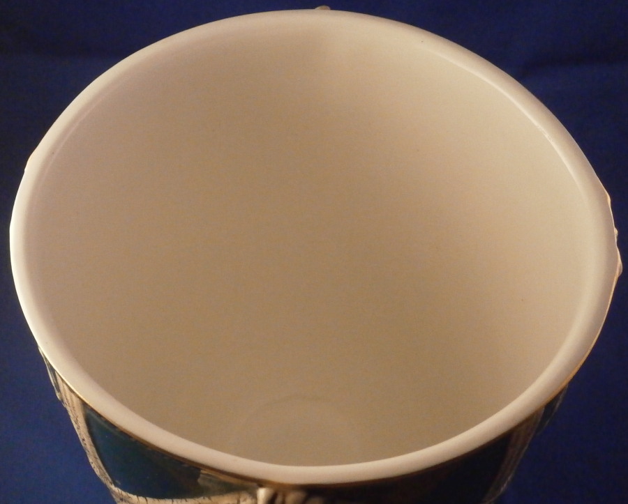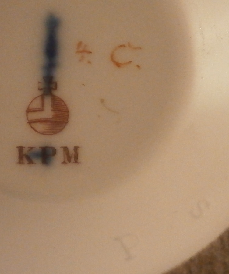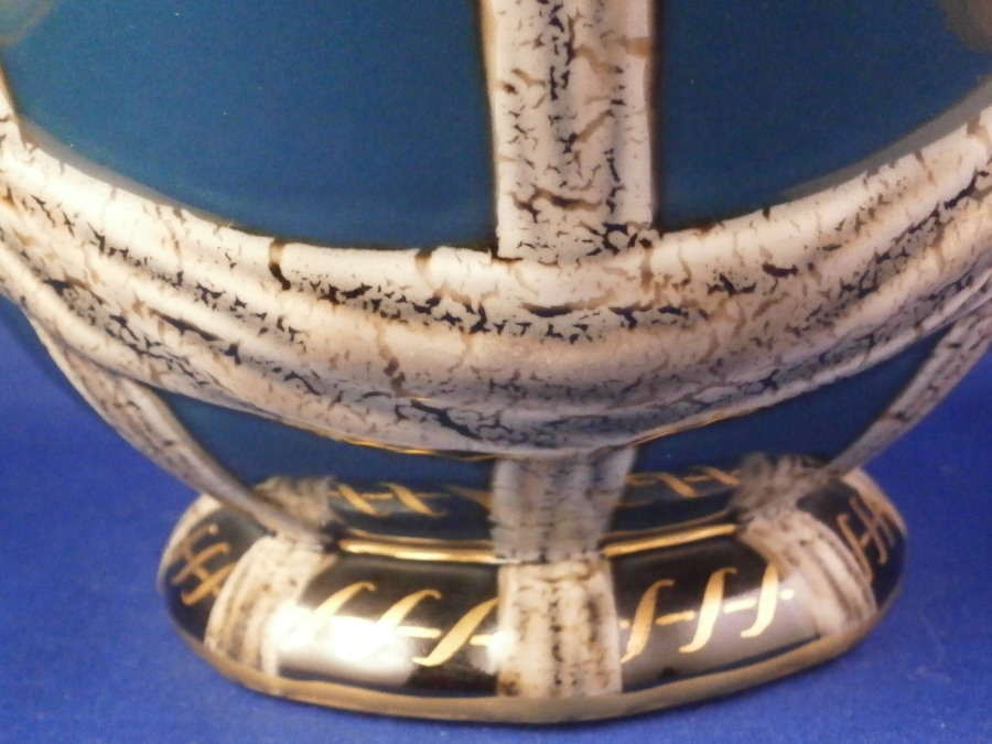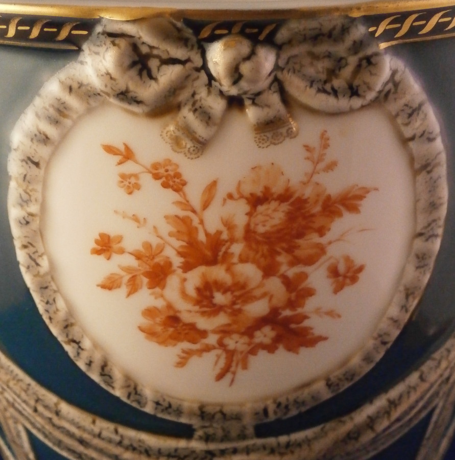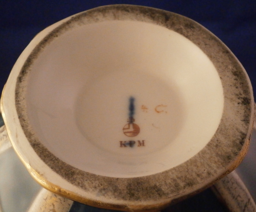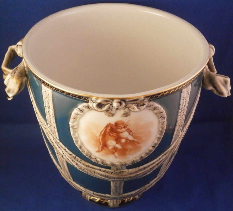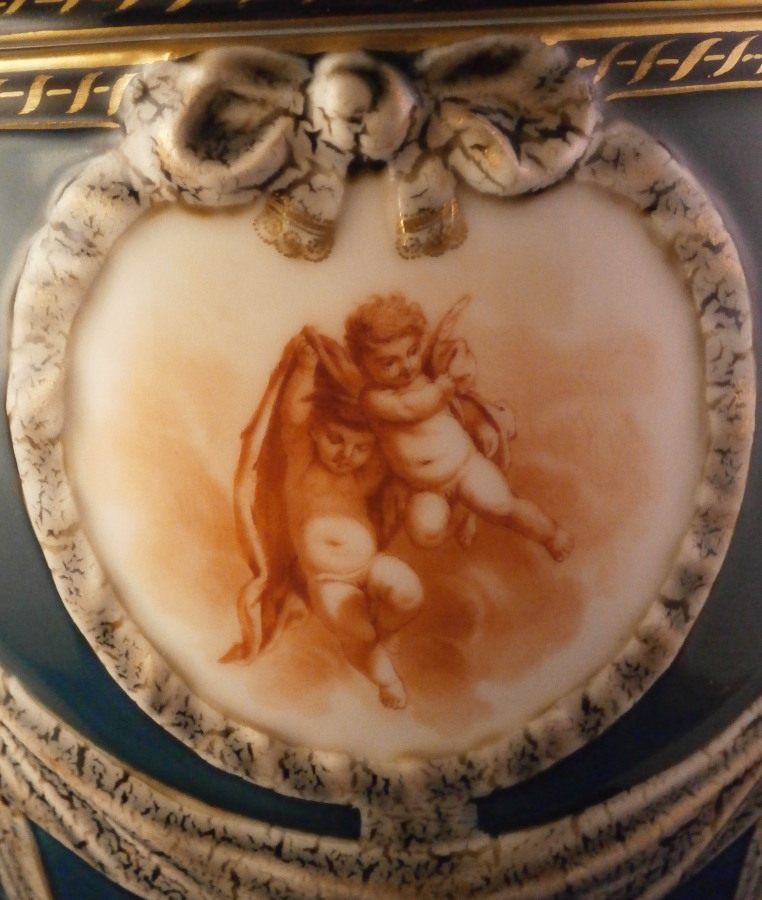 This is a superb lidded vase, a giant ginger jar or even would be perfect as a cookie jar made by KPM in the early 20th century. It is superbly hand painted with a scene in orange tones on one side including angels / cherubs in a cloud and a floral arrangement on the other side as shown. The main area of each piece has this superb turquoise ground color to it with a cobalt blue and gold trim to the edges. The entire bottom piece has a design that is meant to look like a ribbon all around the piece tied into bows to form handles on either side. The lid has a large bow as the finial. These are painted in the famous Seger enamels with the underlying color being a darker brownish color and the top a white color that "cracked" when it was fired and let the underlying color through. The effect is stunning and looks a bit like marble! The lid also has some nice gold trim along the rim. The combination of colors along with the size of the piece make is look amazing and perfect for display and use. And the best part is that I have a second piece to make a pair that I will also add to the site if anyone is interested in a rare pair! The piece is marked underneath with the under glaze blue scepter mark, the red orb mark, the usual impressed numbers and letter of the period and a painter's marks as shown. The udnerside lid just has a number under it which is normal. The jar with the lid on is about 10.75 inches tall and 7.125 inches in diameter. The handles stick out about1.25 inches from either side. The jar and lid are in perfect condition. Please email me for more information or other pictures.