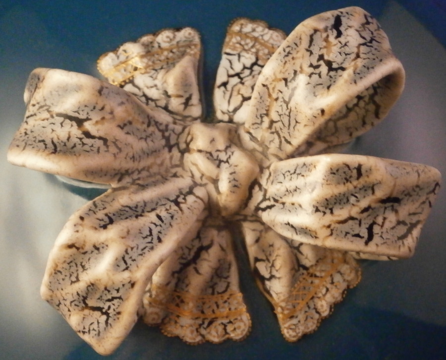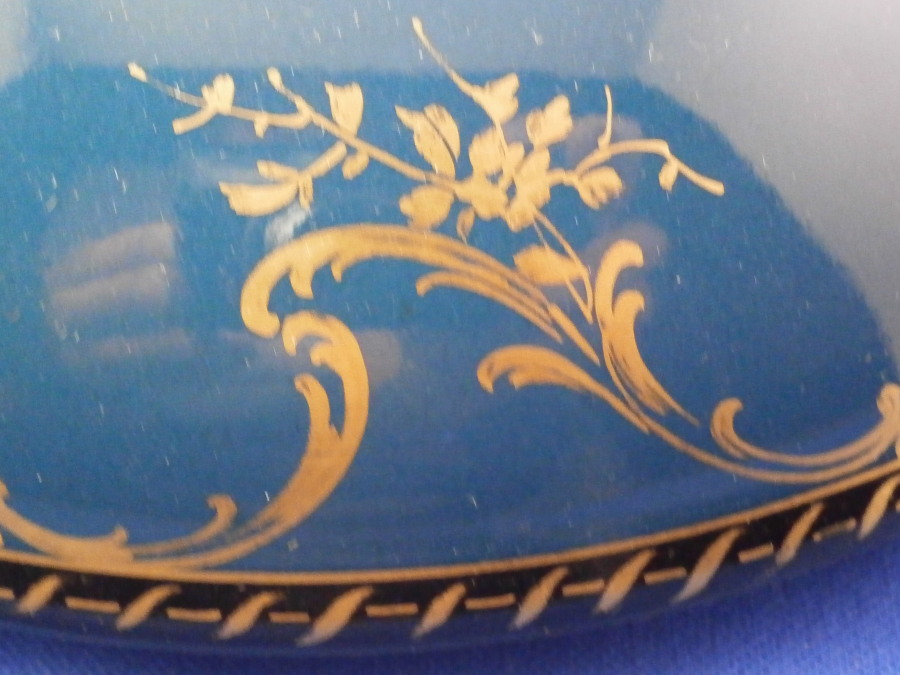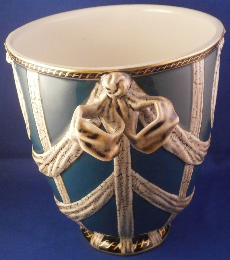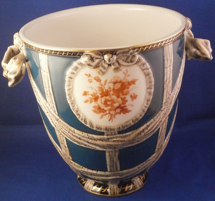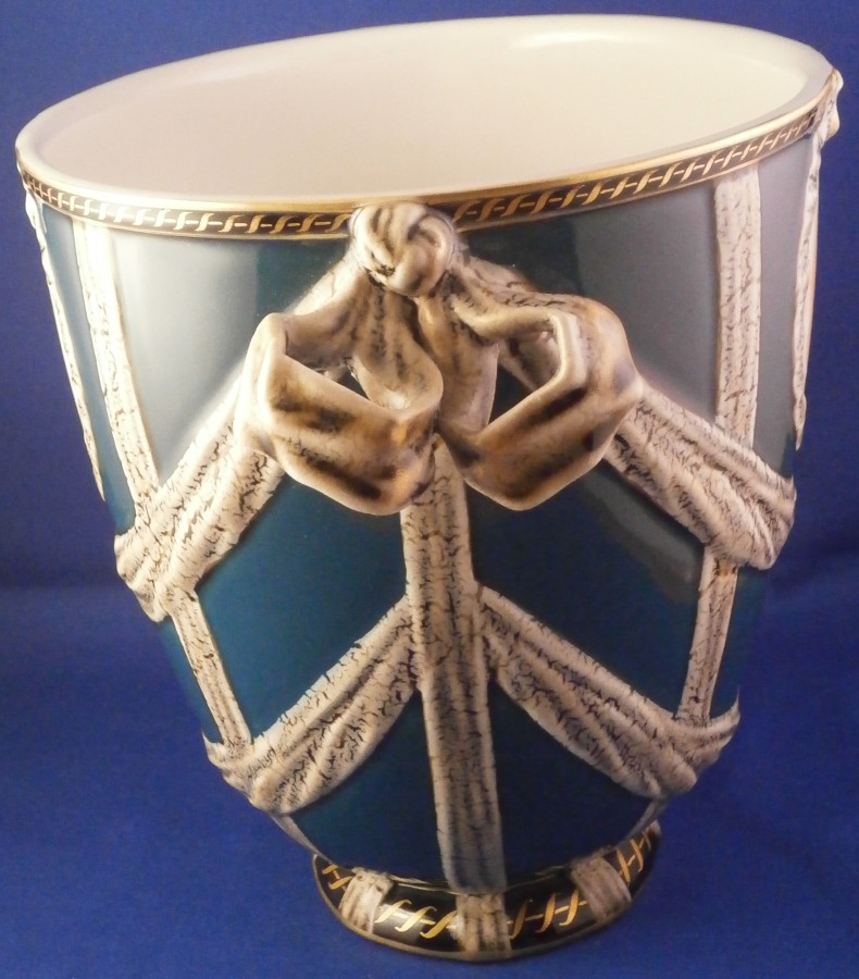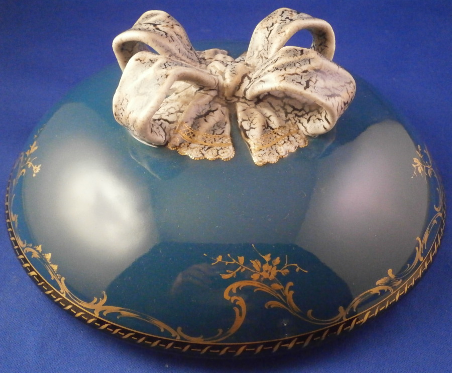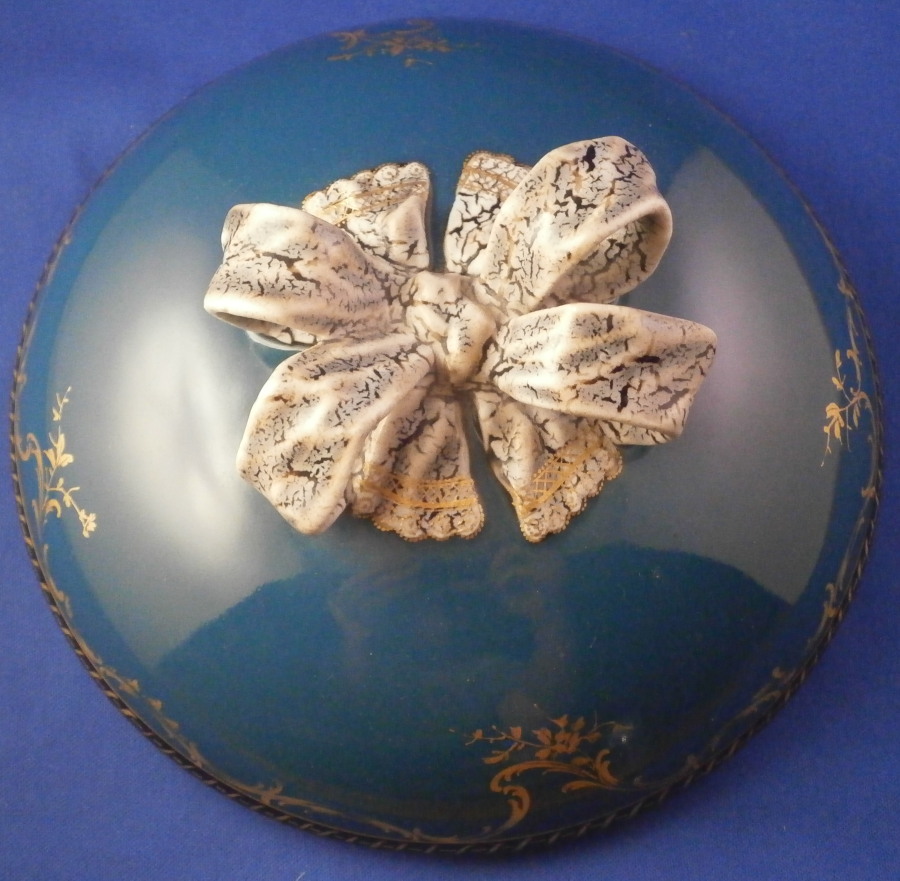 This is a superb lidded vase, a giant ginger jar or even would be perfect as a cookie jar made by KPM in the early 20th century. It is superbly hand painted with a scene in orange tones on one side including angels / cherubs in a cloud and a floral arrangement on the other side as shown. The main area of each piece has this superb turquoise ground color to it with a cobalt blue and gold trim to the edges. The entire bottom piece has a design that is meant to look like a ribbon all around the piece tied into bows to form handles on either side. The lid has a large bow as the finial. These are painted in the famous Seger enamels with the underlying color being a darker brownish color and the top a white color that "cracked" when it was fired and let the underlying color through. The effect is stunning and looks a bit like marble! The lid also has some nice gold trim along the rim. The combination of colors along with the size of the piece make is look amazing and perfect for display and use. And the best part is that I have a second piece to make a pair that I will also add to the site if anyone is interested in a rare pair! The piece is marked underneath with the under glaze blue scepter mark, the red orb mark, the usual impressed numbers and letter of the period and a painter's marks as shown. The udnerside lid just has a number under it which is normal. The jar with the lid on is about 10.75 inches tall and 7.125 inches in diameter. The handles stick out about1.25 inches from either side. The jar and lid are in perfect condition. Please email me for more information or other pictures.
