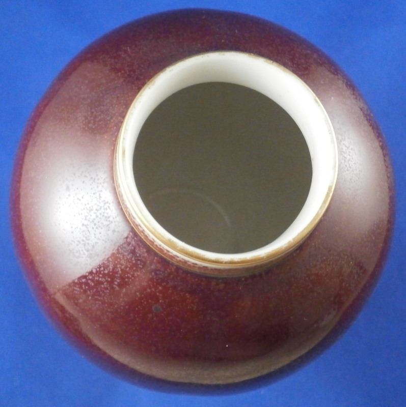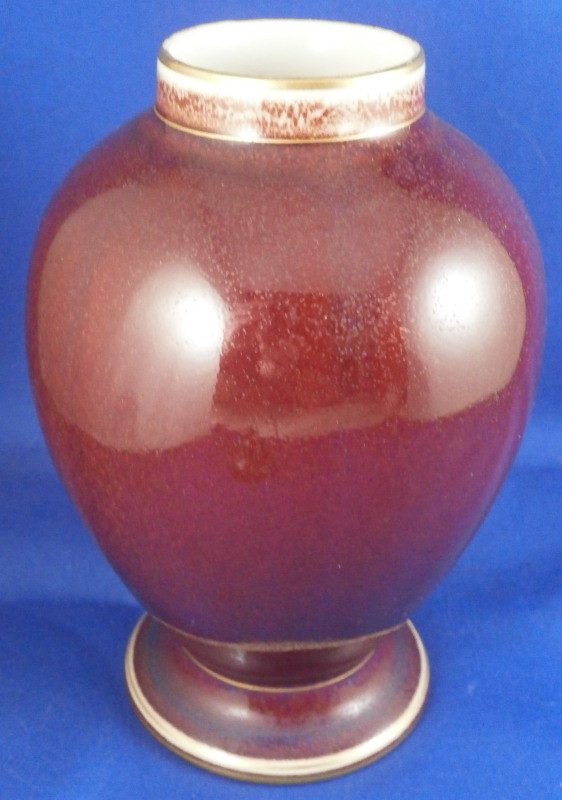 This is a rare and superb porcelain vase with its lid made by KPM around the late 19th century. The vase has a nice shape to it with groves from top to bottom at even intervals which are hard to see but gives it a more dimensional feel. It is hand painted with one of the famous Seger glazes (the oxblood or Sang du Boeuf color) as well as a bit of gold trim. Seger porcelain is very rare and sought after and the Chinese glazes he managed to copy are amazing! Such a deep color and so different from the usual KPM colors - just stunning! The piece is 7.25 inches tall and 4 inches in diameter. It is marked underneath as well as in the lid with the number 68. in blue / impressed. The vase part has the usual scepter mark with his letters underneath. The piece is in perfect condition. Please email me for more information or other pictures.