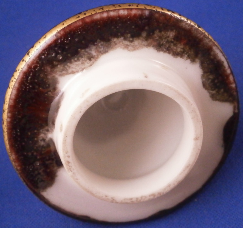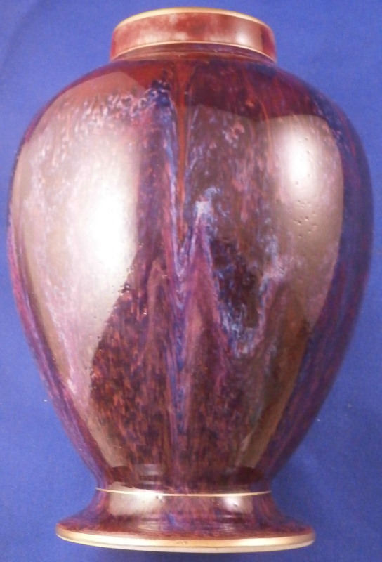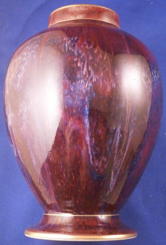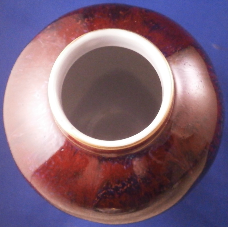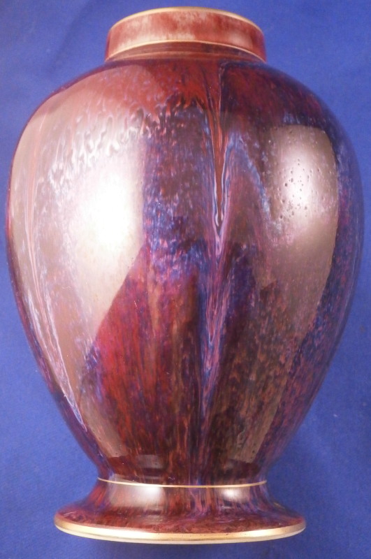 This is a superb and rare porcelain vase with its lid made by KPM around the early 20th century. The vase has a nice shape to it with groves from top to bottom at even intervals which are hard to see but gives it a more dimensional feel. It is covered with one of the famous Seger glazes (the oxblood or Sang du Boeuf color) as well as a bit of gold trim. In this case the oxblood glaze has tones of purple, blue and white in it with a nice pattern to it that resulted from it slowly flowing down the side while fired. Seger porcelain is very rare and sought after and the Chinese glazes he managed to copy are amazing! Such a deep and rich color and so different from the usual KPM colors - just stunning! The piece is 7.125 inches tall and 3.75 inches in diameter. It is marked underneath as shown with the usual scepter mark with his letters underneath and in this case also the red orb mark because of the gilding which was used after a certain period. The piece is in perfect condition. There are pockmarks all over the glaze which is completely normal on these pieces! Please email me for more information or other pictures.