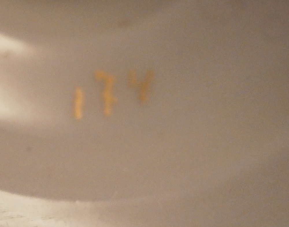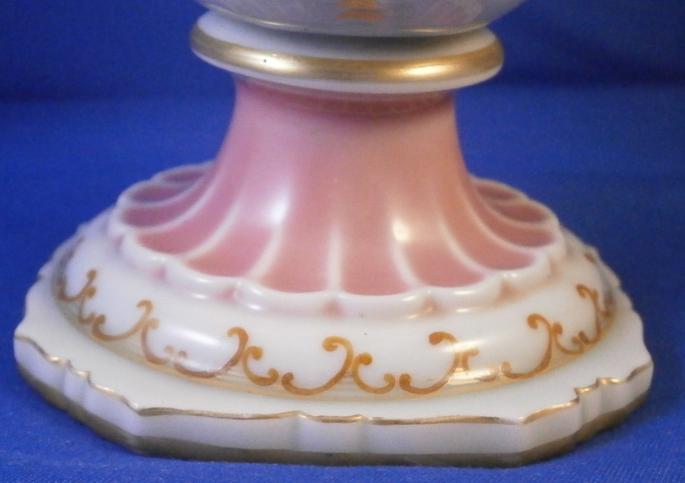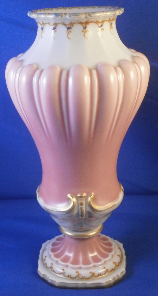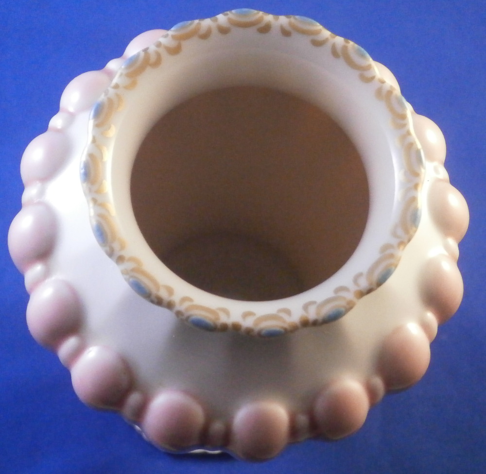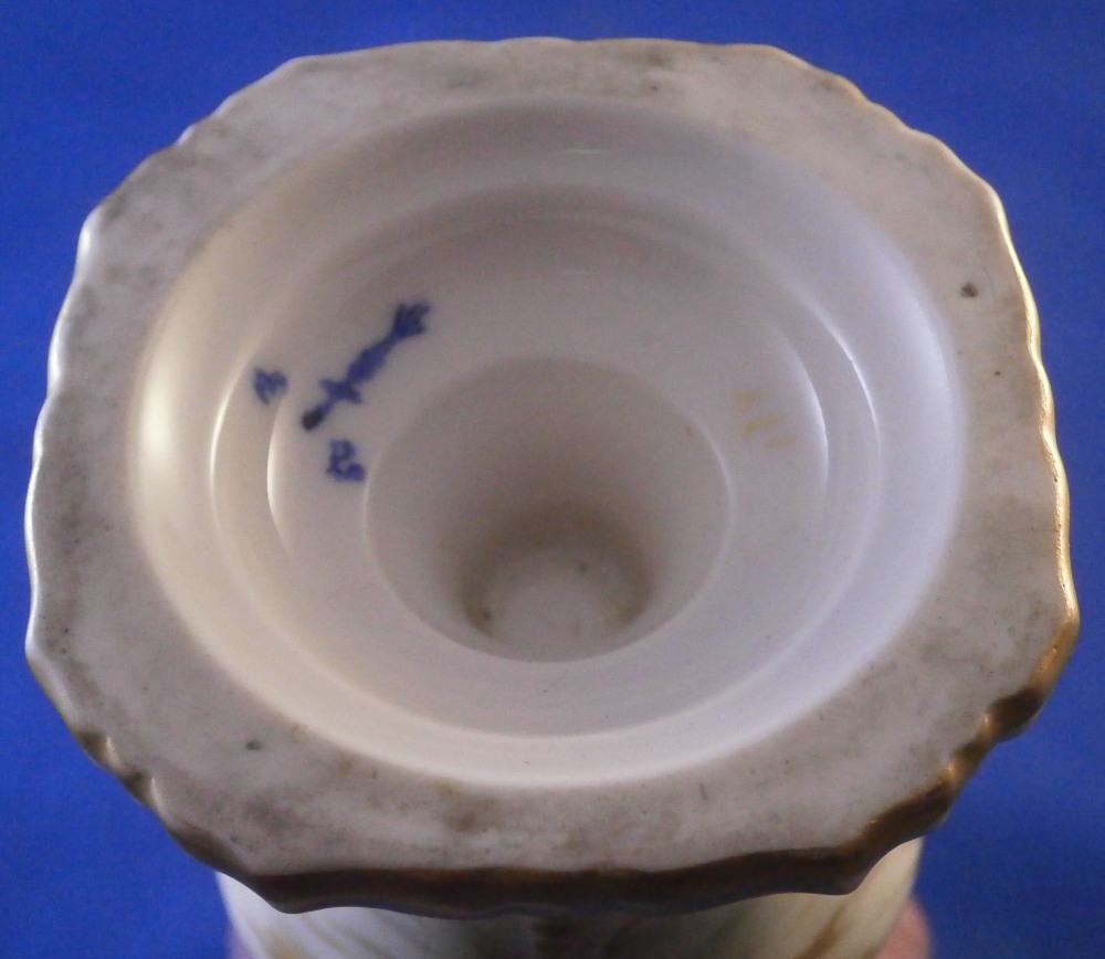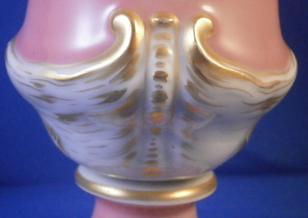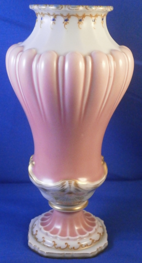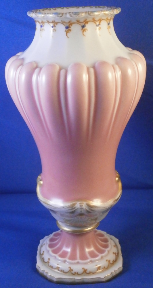 This is a second rare and beautiful vase made by KPM during the very early 20th century. It is one of their Seger porcelain pieces which are quite hard to find! Here we have a nicely shaped piece that has raised panels of pink ground with a scroll work base to the main body of a bluish tinted but mainly white ground with gold highlights. The top of the vase has that same ground color to it with an orange trim design with little blue "jewels" and a gold trim to the very edge with turquoise "jewels". These little jewels and cool ground colors are what Seger porcelain is all about. The foot of the vase has a pink design to it as well as orange trim to the bluish tinted white ground and a gold trim to the bottom edge. It's an awesome piece that you won't find again - except for me having a second matching one if you are itnerested in a pair. Il have it up on the site as well. The vase is in superb condition with maybe a spot of very minimal wear but it displays perfectly and looks stunning! The vase is marked with the under glaze blue scepter mark with the SgPr letters under it which are partially missing, as well as the usual impressed numbers and a gold number 174 as shown. The piece is just under 7.5 inches tall and it has a diameter of 3.5 inches. Please email me for more information or other pictures.