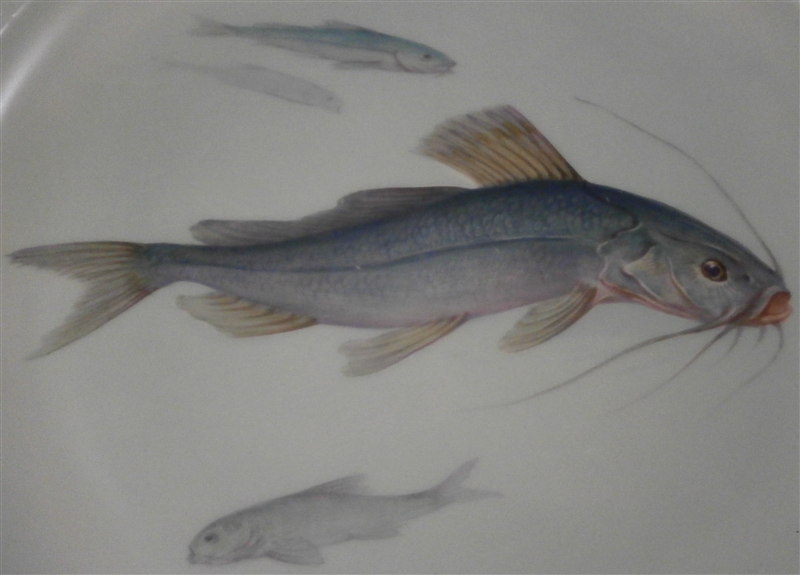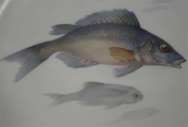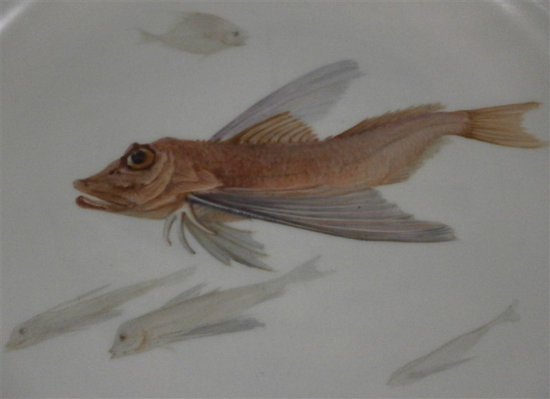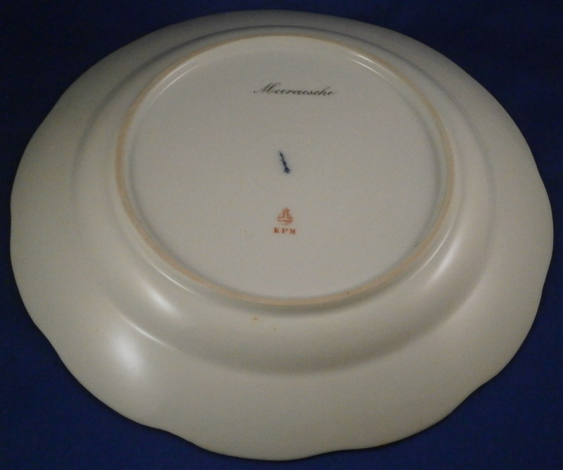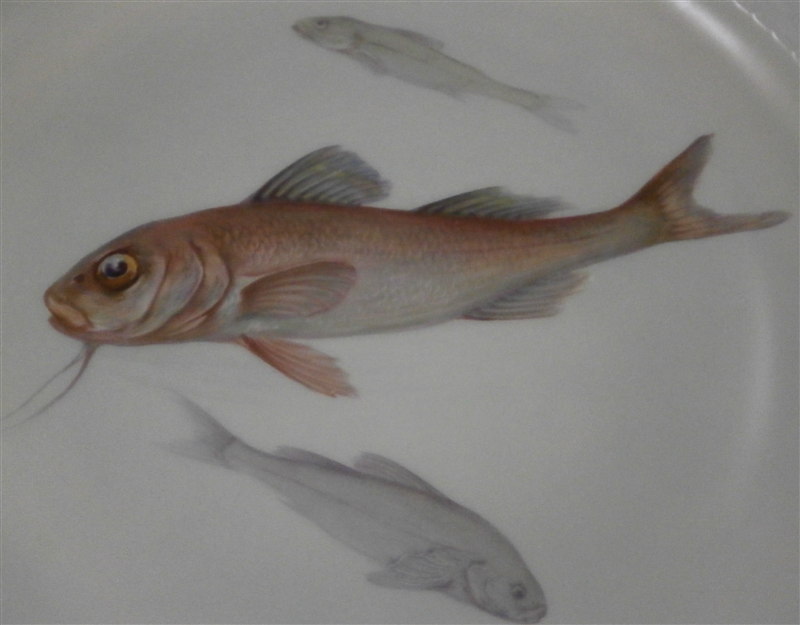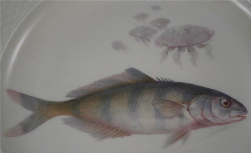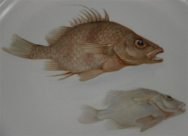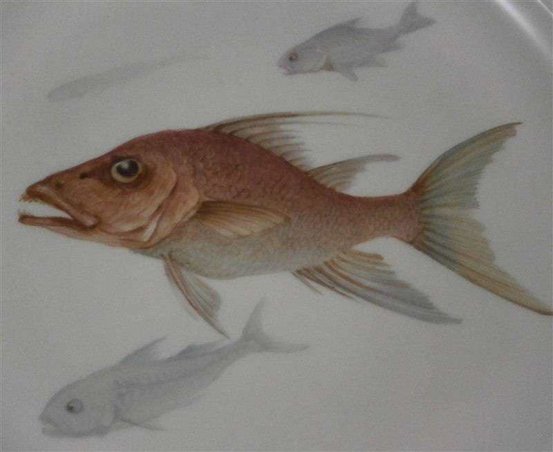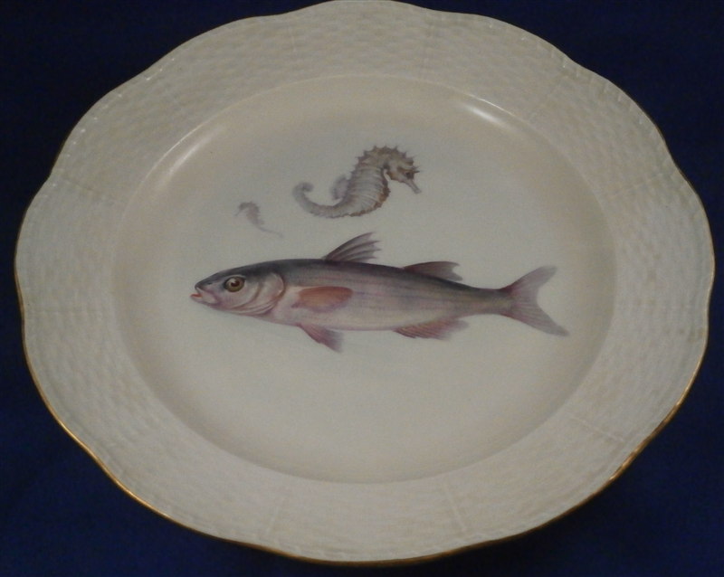 This is a superb set of twelve plates made by KPM in the early 20th century. Each plate is hand painted with a different fish design in the center including a large fish as well as some smaller fish or other sea creature with the rest of the well of the plate having a light blue ground color. The rims have a nice raised basket weave design to it with a gold trim to the nicely shaped edge. The plates are in superb condition ith the occasional minor small scratch but most plates are absolutely perfect! They are about 1.25 inches tall and 9.625 inches in diameter. Each is marked underneath with the underglaze blue scepter as well as the red orb mark and the usual impressed marks, painter's marks, etc. as well as the name of the main fish that is displayed on the front. These are Rochen ( Ray ), Aalmutter ( Eel Mother ), Meerbarbe ( Goatfish ), Dorsch ( Cod ), Lippfisch (Some sort of Wrasse ), Pfauenfisch (No idea), Brasilianischer Wels ( Brazilian Catfish ), Lotsenfisch ( Pilot Fish ), Knurrhahn ( Sea Robin ), Seebarsch ( Seabass ), Schraetzer (same name in English) and last but not least Meeraesche ( Mullet ). Please email me for more information or other pictures.