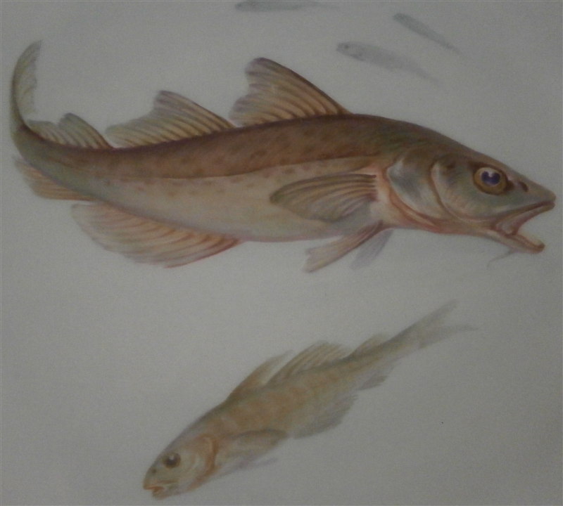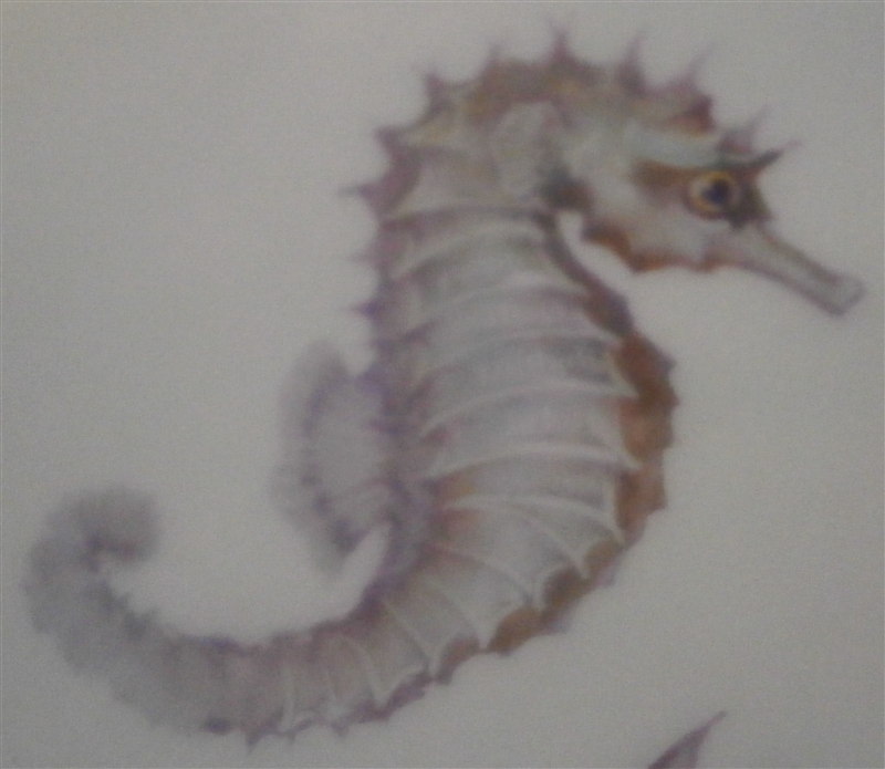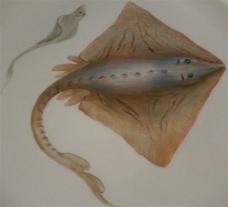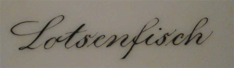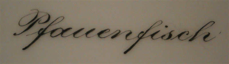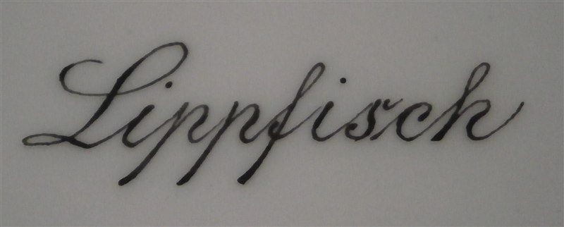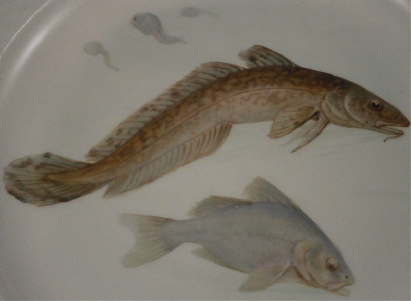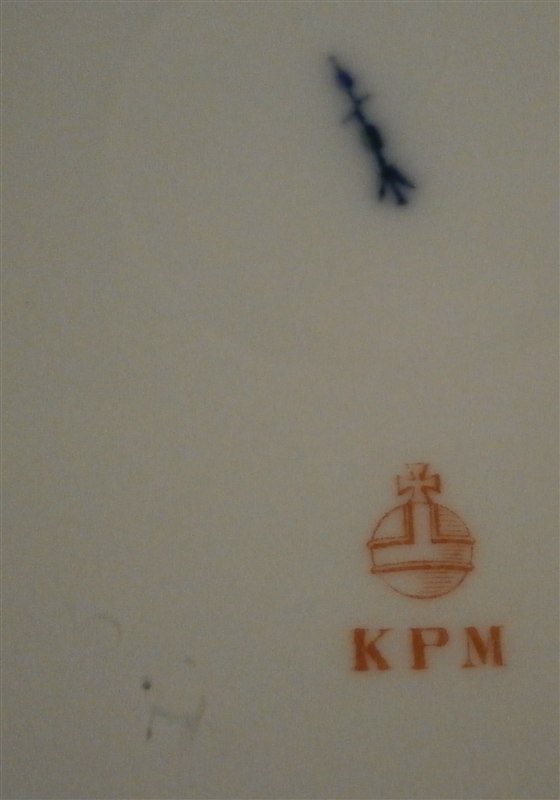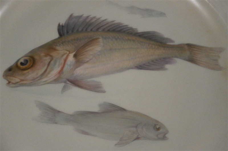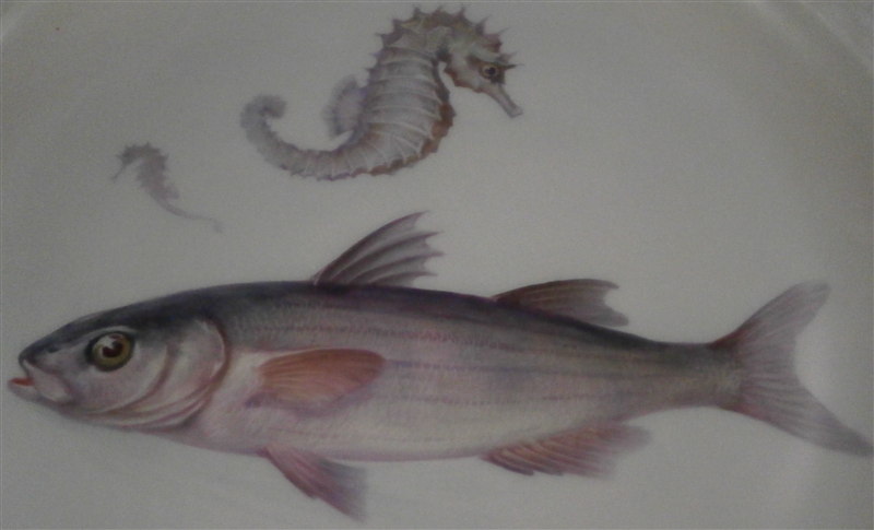 This is a superb set of twelve plates made by KPM in the early 20th century. Each plate is hand painted with a different fish design in the center including a large fish as well as some smaller fish or other sea creature with the rest of the well of the plate having a light blue ground color. The rims have a nice raised basket weave design to it with a gold trim to the nicely shaped edge. The plates are in superb condition ith the occasional minor small scratch but most plates are absolutely perfect! They are about 1.25 inches tall and 9.625 inches in diameter. Each is marked underneath with the underglaze blue scepter as well as the red orb mark and the usual impressed marks, painter's marks, etc. as well as the name of the main fish that is displayed on the front. These are Rochen ( Ray ), Aalmutter ( Eel Mother ), Meerbarbe ( Goatfish ), Dorsch ( Cod ), Lippfisch (Some sort of Wrasse ), Pfauenfisch (No idea), Brasilianischer Wels ( Brazilian Catfish ), Lotsenfisch ( Pilot Fish ), Knurrhahn ( Sea Robin ), Seebarsch ( Seabass ), Schraetzer (same name in English) and last but not least Meeraesche ( Mullet ). Please email me for more information or other pictures.