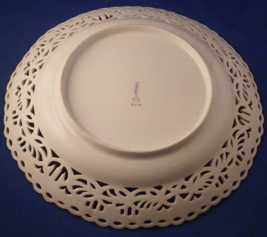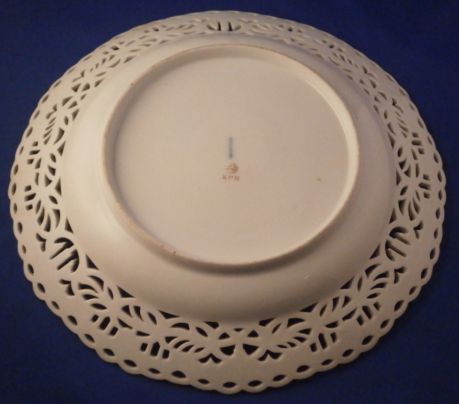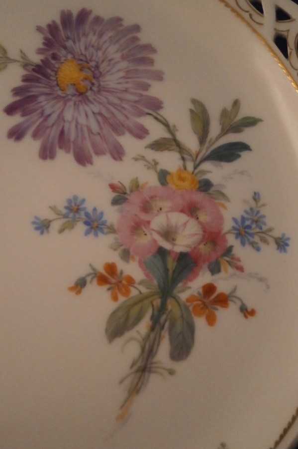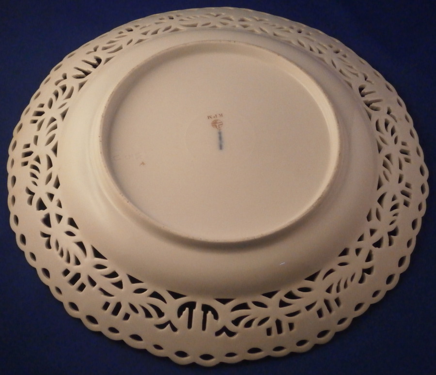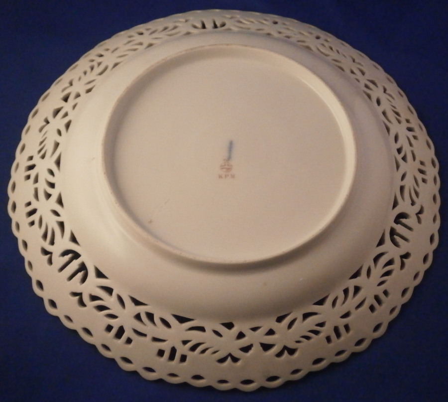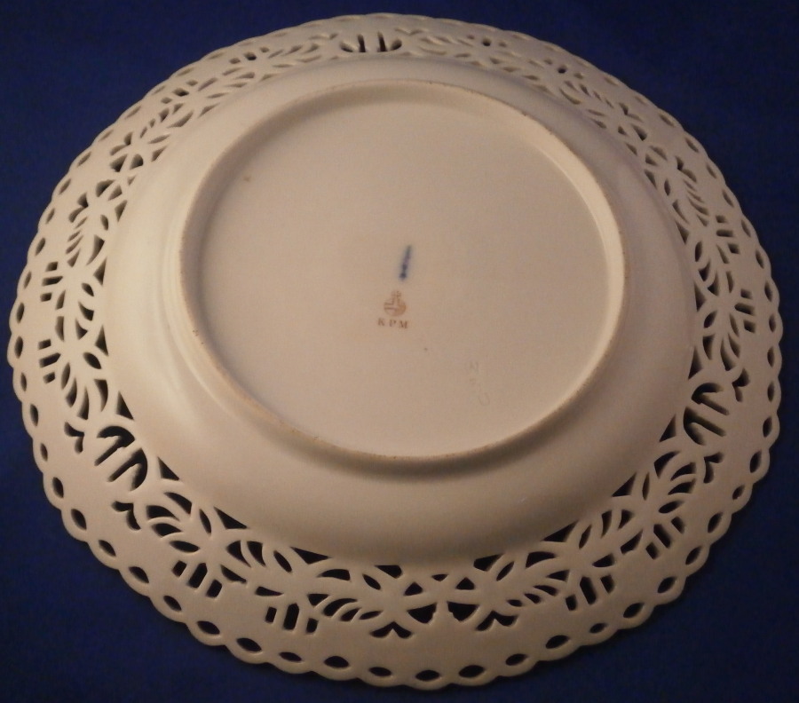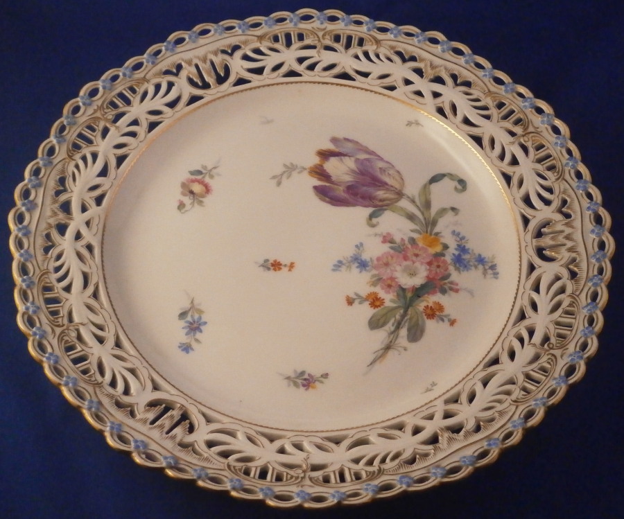This is a rare and superb set of 6 reticulated plates made by KPM in the early 20th century. They have one of the fanciest reticulations that KPM did and it is called Palmendurchbruch in German which translates to palm leaf reticulation which one can easily see in the design. Not a design one sees often at all but it originally dates to the 18th century. The rim is completely reticulated with the palm leaves closest to the well, three different designs above that and the little arches along the edge with small forget me nots flowers in between them. Lots of gold highlights and a gold trim along the edge of the well. The centers of the plates have a superb floral arrangement to it as well as some small single flowers and tiny leaves. The flowers of this period are superb - much nicer than more modern ones or even most earlier ones. The colors are nice and the detail top notch! The plates are in perfect condition! They are marked underneath with the under glaze blue scepter mark as well as the over glaze red KPM orb mark showing it was painted by KPM and the usual impressed and artist marks as shown. The plates are about 1.375 inches tall and 9.875 inches in diameter - a nice size for use or display. Please email me for more information or other pictures.