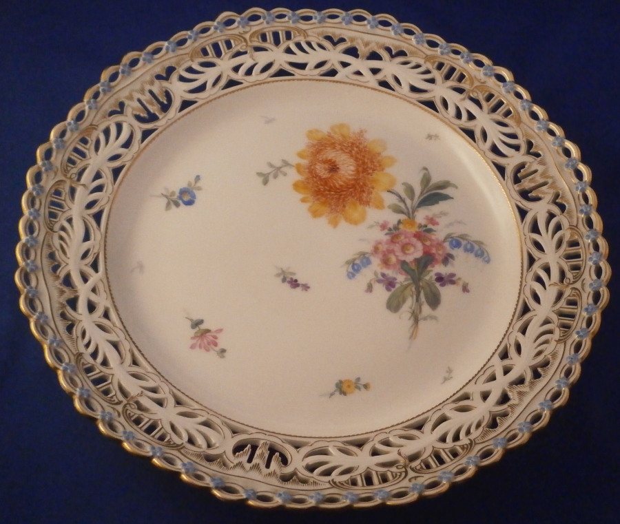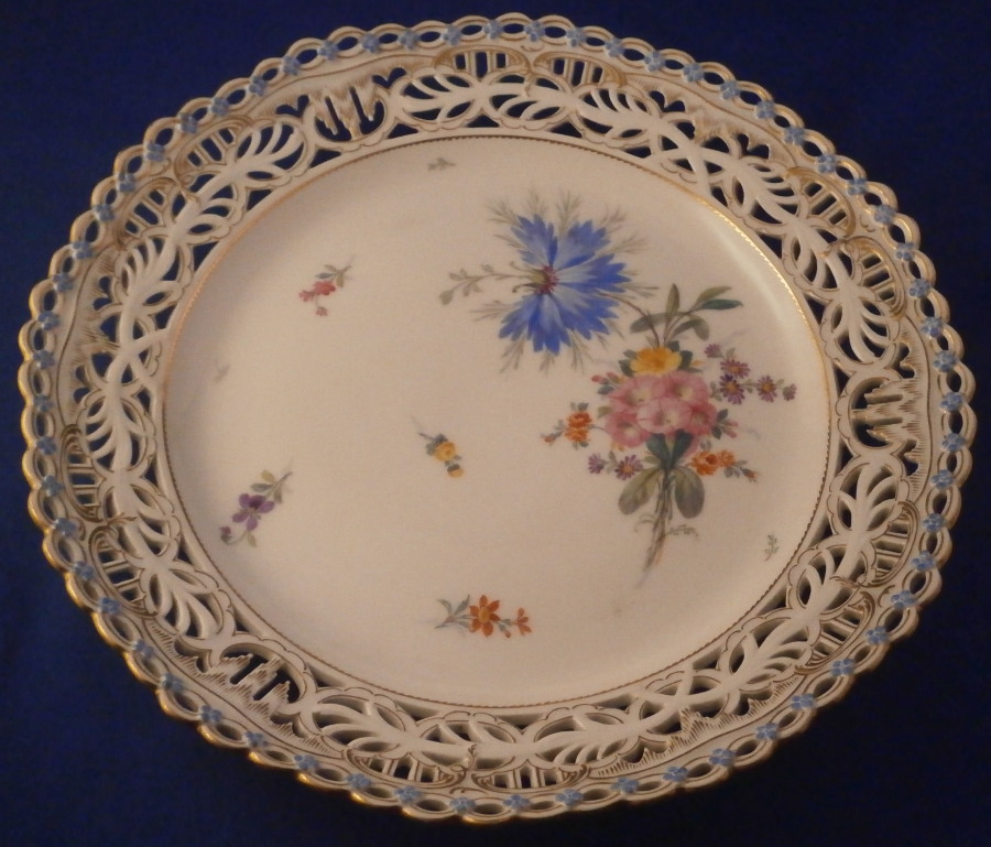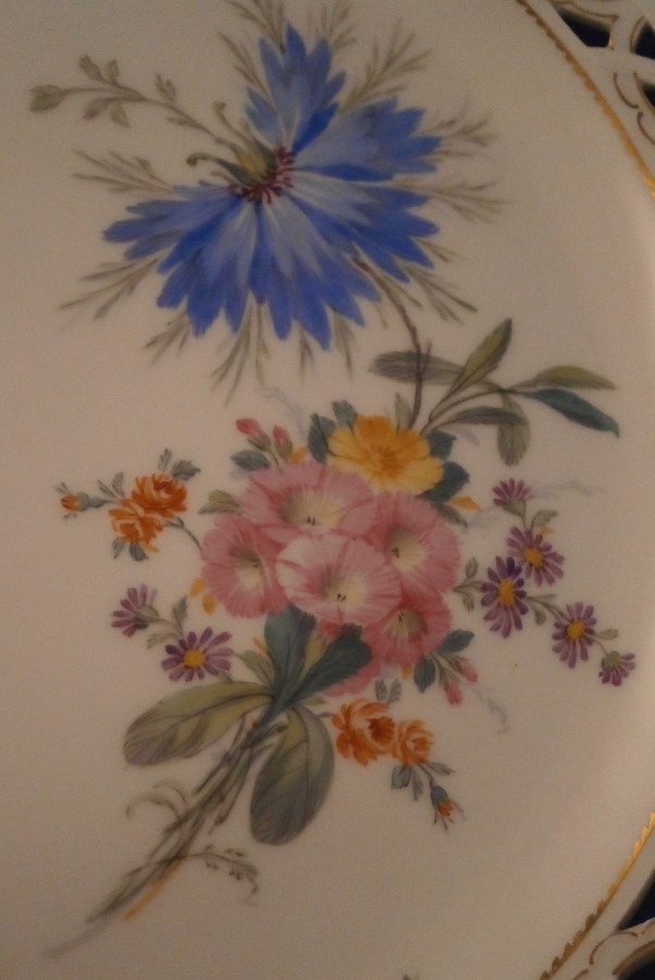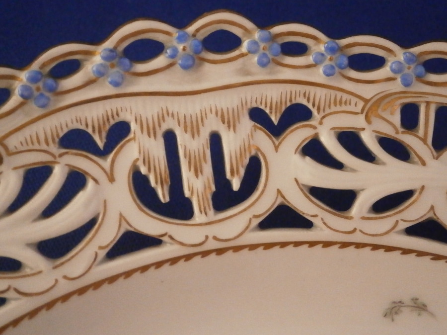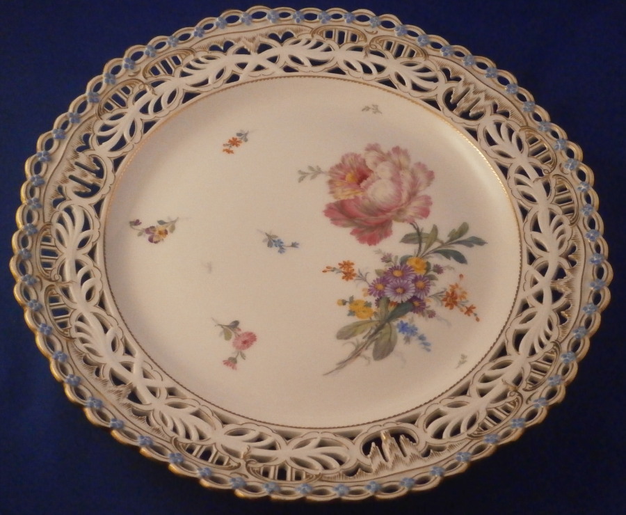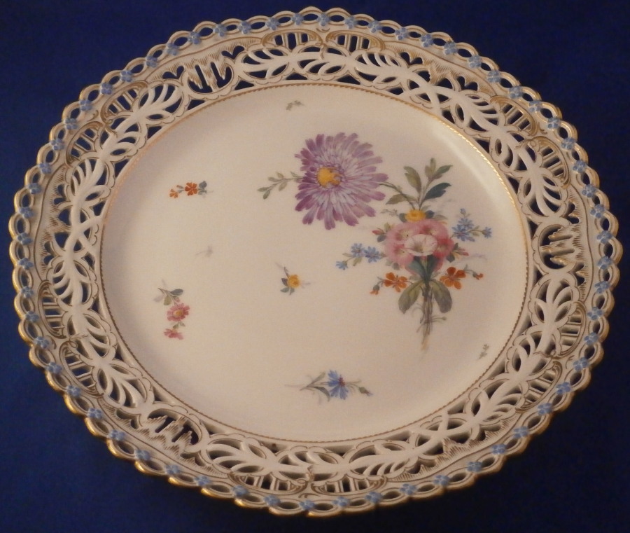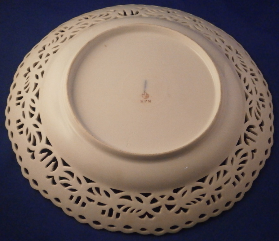 This is a rare and superb set of 6 reticulated plates made by KPM in the early 20th century. They have one of the fanciest reticulations that KPM did and it is called Palmendurchbruch in German which translates to palm leaf reticulation which one can easily see in the design. Not a design one sees often at all but it originally dates to the 18th century. The rim is completely reticulated with the palm leaves closest to the well, three different designs above that and the little arches along the edge with small forget me nots flowers in between them. Lots of gold highlights and a gold trim along the edge of the well. The centers of the plates have a superb floral arrangement to it as well as some small single flowers and tiny leaves. The flowers of this period are superb - much nicer than more modern ones or even most earlier ones. The colors are nice and the detail top notch! The plates are in perfect condition! They are marked underneath with the under glaze blue scepter mark as well as the over glaze red KPM orb mark showing it was painted by KPM and the usual impressed and artist marks as shown. The plates are about 1.375 inches tall and 9.875 inches in diameter - a nice size for use or display. Please email me for more information or other pictures.