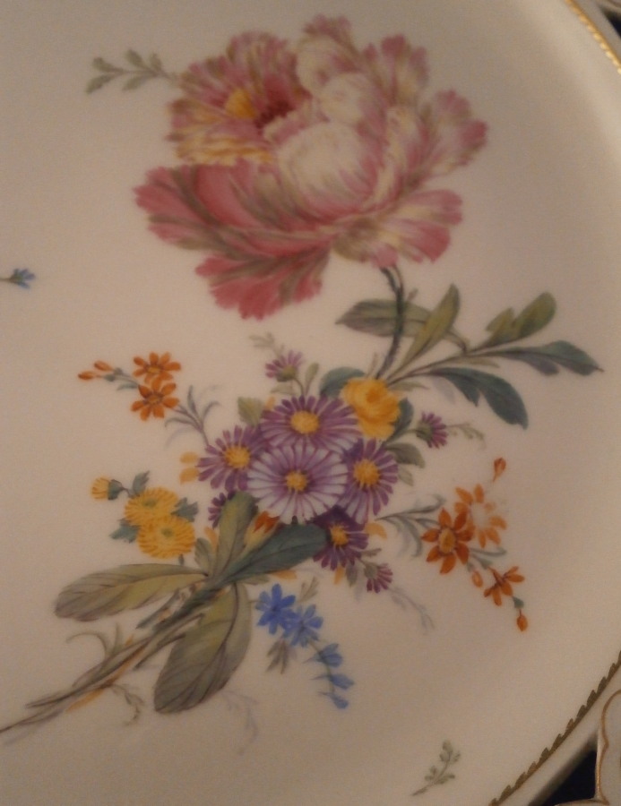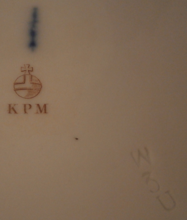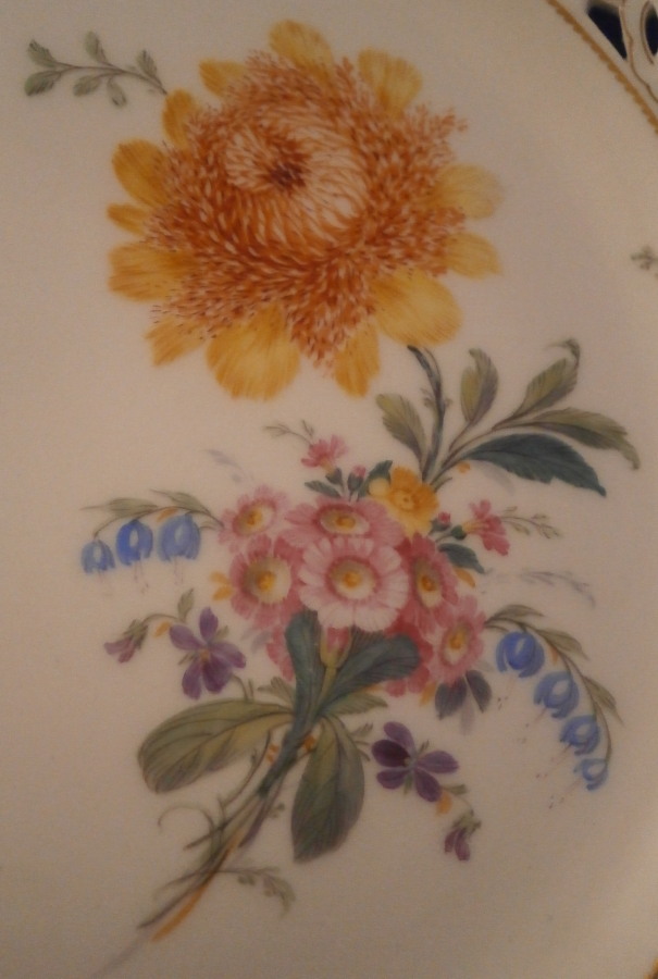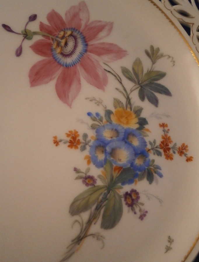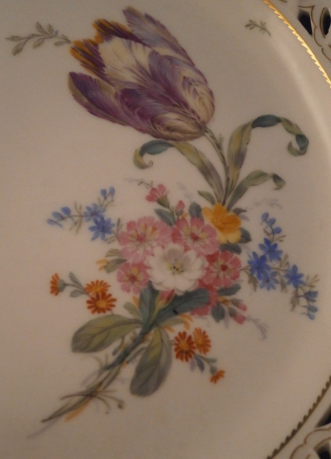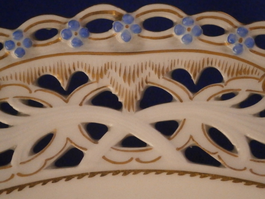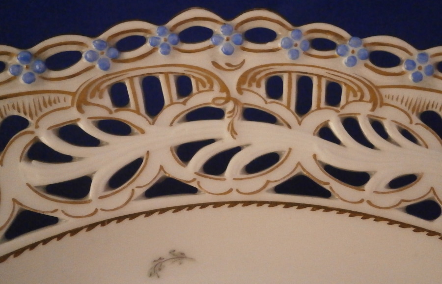 This is a rare and superb set of 6 reticulated plates made by KPM in the early 20th century. They have one of the fanciest reticulations that KPM did and it is called Palmendurchbruch in German which translates to palm leaf reticulation which one can easily see in the design. Not a design one sees often at all but it originally dates to the 18th century. The rim is completely reticulated with the palm leaves closest to the well, three different designs above that and the little arches along the edge with small forget me nots flowers in between them. Lots of gold highlights and a gold trim along the edge of the well. The centers of the plates have a superb floral arrangement to it as well as some small single flowers and tiny leaves. The flowers of this period are superb - much nicer than more modern ones or even most earlier ones. The colors are nice and the detail top notch! The plates are in perfect condition! They are marked underneath with the under glaze blue scepter mark as well as the over glaze red KPM orb mark showing it was painted by KPM and the usual impressed and artist marks as shown. The plates are about 1.375 inches tall and 9.875 inches in diameter - a nice size for use or display. Please email me for more information or other pictures.