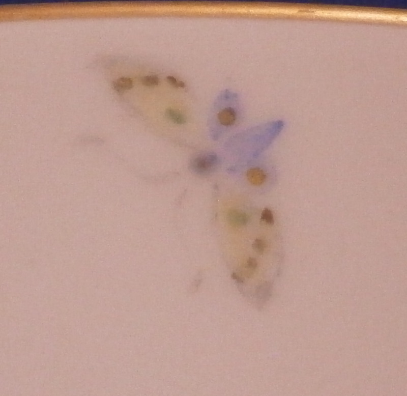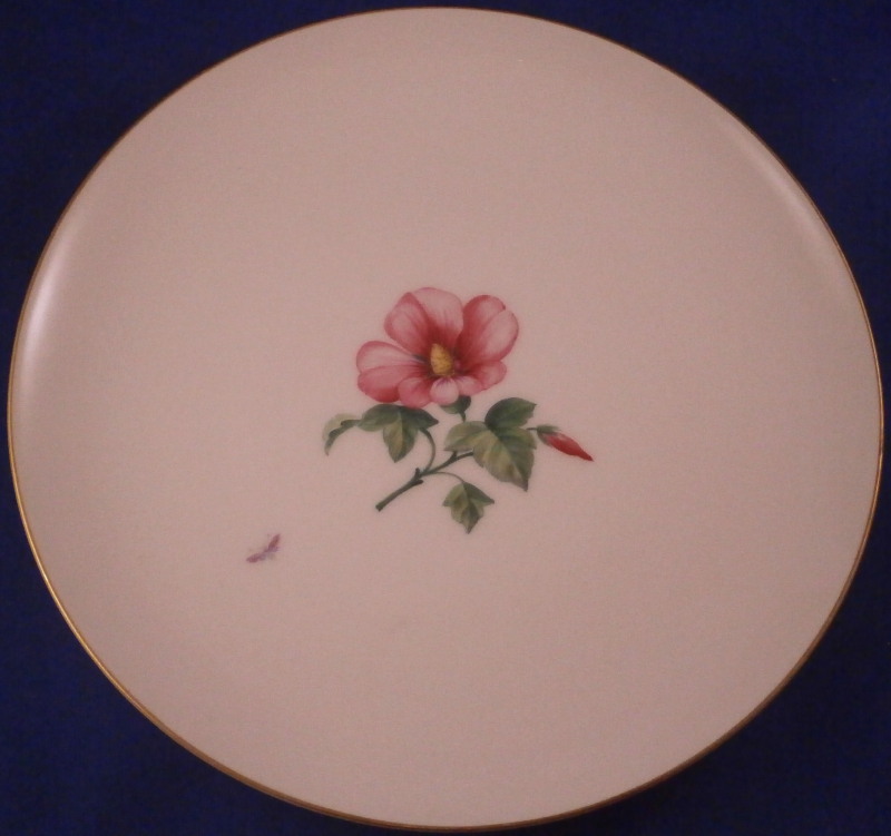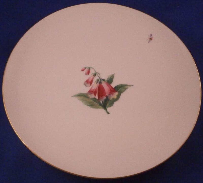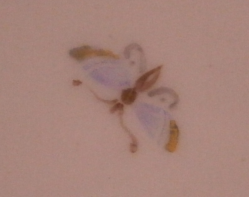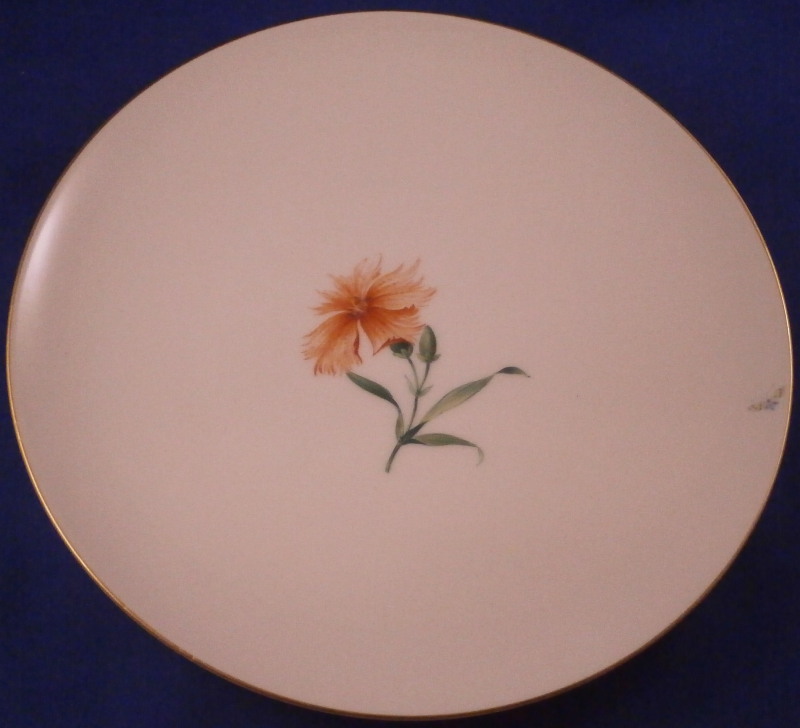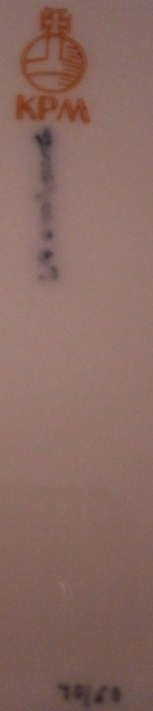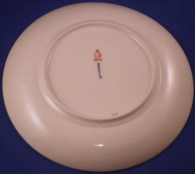This is a nice set of 6 dessert plates made by KPM right around the mid 20th century. I think it is in the Urbino but could also be the Berlin design. Each plate is hand painted with a nice flower in the center and some also ahve a single little butterfly to cover a small flaw which was often used by them on this service. Each piece has a simple yet elegant shape with a gold trim to the edge. All pieces are in superb condition and are marked underneath with the under glaze blue scepter with the S under it for the Selb factory, the red orb mark as well as some black and impressed numbers as shown. The plates are 0.875 inches tall and have a diameter of 7.5 inches. Please email me for more information or other pictures.