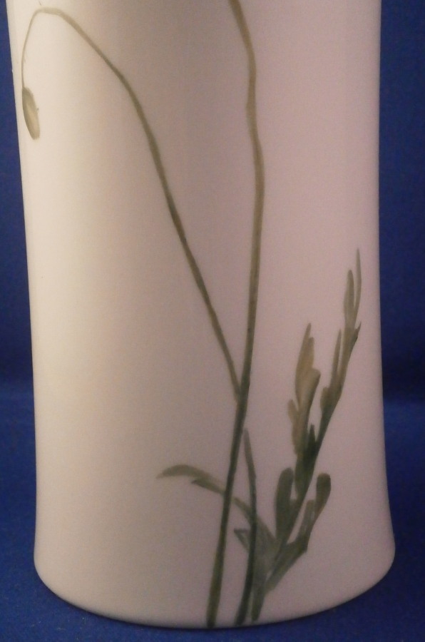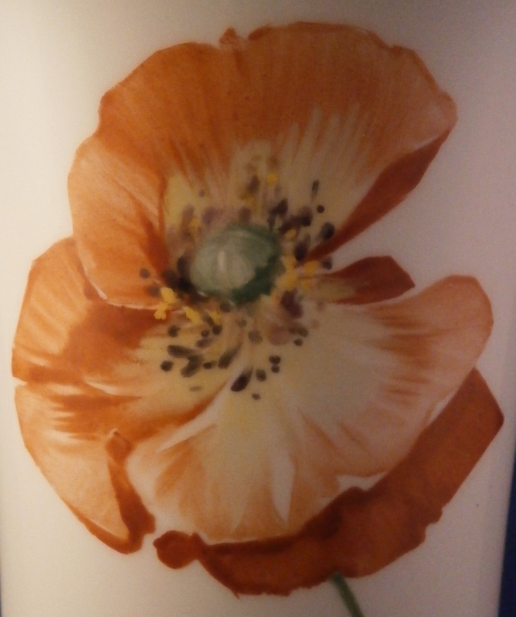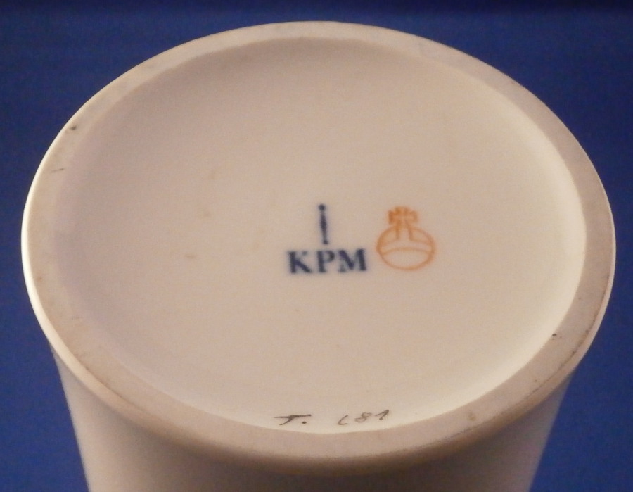 This is a really nice looking vase vase made by KPM in the late 20th century. First designed in 1972 by Johannes Henke and its one of those pieces you just know will be a classic in 100 years! The simplicity of the shape and superb single poppy flower make this a super elegant piece! The vase has a really nice shape to it with that pronounces top rim and the front has an orange poppy flower with a large blossom and a thin stalk with another unopenend flower bug on a second stalk and a single leaf. The rest is left blank. A stunning look! The vase is in perfect condition! It is are 8.25 inches tall and 4.375 inches in diameter at the top. The bottom of the vase is marked under neath with the under glaze blue scepter with KPM under it as well as the red orb mark and some black numbers and letters as shown. Please email me for more information or other pictures.