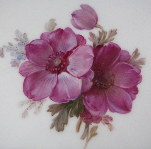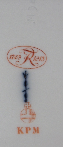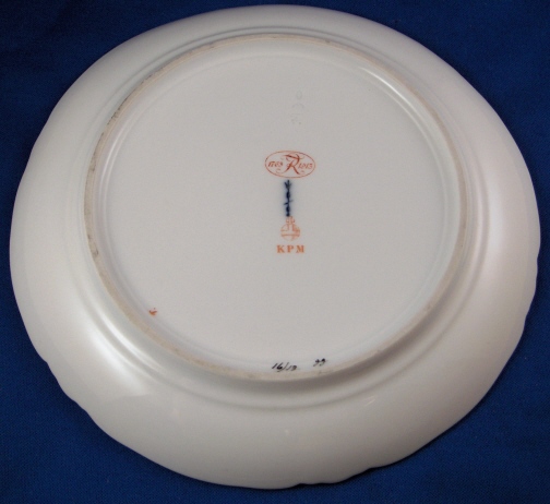 This is a superb plate made by KPM in 1913. It is handpainted with a nice purple flower scene in the center with some greenery and a small blue flower to one side. Painted in the Art Nouveau style of the period which I think are the best flowers out there! The rim itself is painted with gold on a raised design that is quite nice as well. The plate is in perfect condition with a tiny bit of wear. It is 7.375 inches in diameter and 0.875 inches tall. The plate is marked underneath with the underglaze blue scepter, the red orb mark, painter's marks, the usual impressed marks of the period and the 1913 anniversary mark in a red oval. Please email me for more information or other pictures.