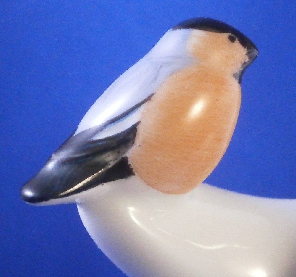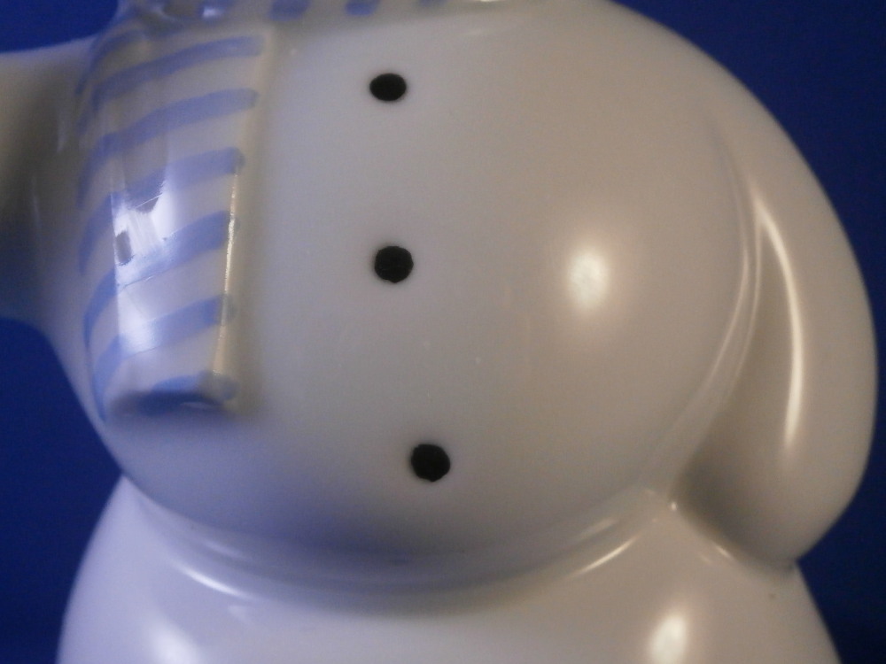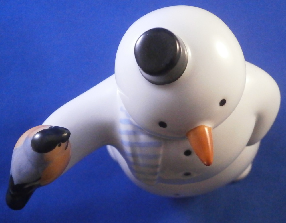 This is a really cute and fun figurine of a snowman made by KPM in the late 20th century. He is nicely modeled like a typical snowman with the black coal as buttons, a carrot note, top hat, a blue and white striped scarf and has one arm out with a red bird on it. I think it is a bullfinch. Just a truly fun figurine that you rarely ever come across. The piece is marked underneath with the under glaze blue scepter, the red orb and the usual other marks one would find one pieces from this period as shown. The figure is in perfect condition which is always nice to find! It is 5.5 inches tall, 4 inches wide and 2.5 inches deep. Please email me for more information or other pictures.