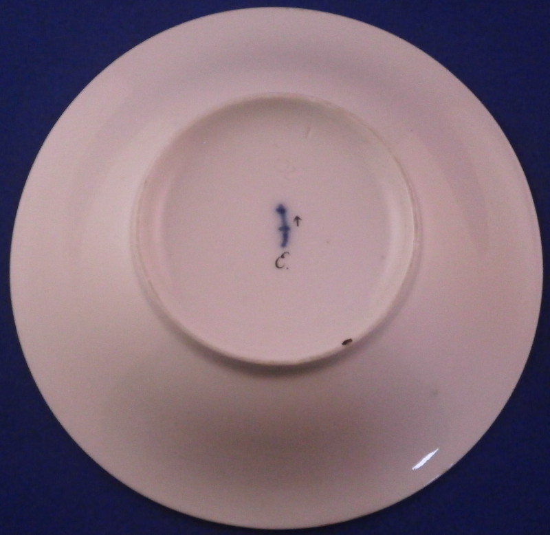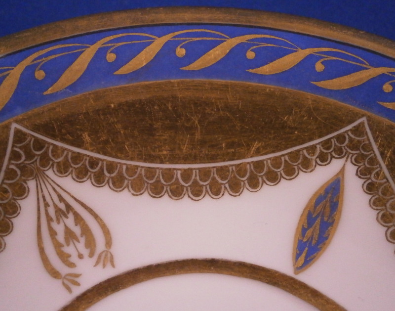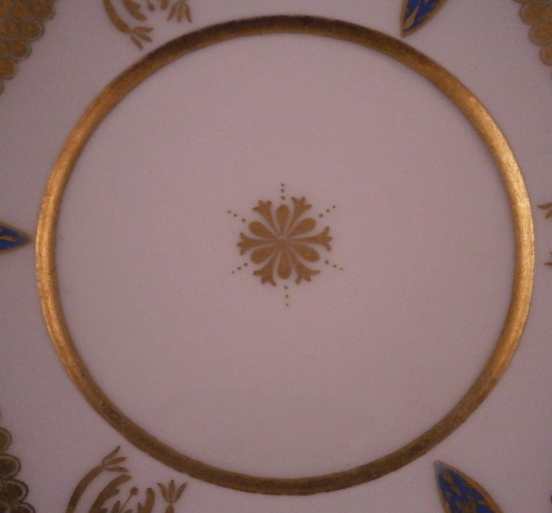 This is a really nice saucer made by KPM in the early 19th century during the Biedermeier period. Reminds me more of the Sorgenthal pieces of Vienna than KPM. A really nice design in blue and gold with the blue along the rim being matte instead of shiny and I also really like that gold scale design along the inner edge of the rim. A stunning design! The piece was made before they used their red orb mark thus you only have the blue scepter and impressed marks / painter's mark which is the case here. The saucer is in great condition with just some very minor wear and some use marks. It is just over 1 inch tall and 5.375 inches in diameter. It is marked underneath with the under glaze blue scepter mark as well as two painter's / gilder's marks and some impressed numbers as shown. Please email me for more information or other pictures.