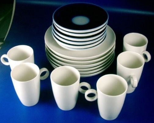 This is an Expresso set in the famous Stambul design made by KPM 1960's. It is fairly simple in decoration being cobalt blue and white but the design is a classic and just superb and rare as well. It is a set for six people with 6 plates, 6 cups and saucers, a pot, a creamer and a sugar dish. All in perfect condition. Marked underneath with the underglaze blue scepter on the white pieces and the underglaze blue scepter and blue orb on the pieces with cobalt decoration. The cups are 3 inches tall and 2 inches in diameter. The saucers are 4.5 inches in diameter. The plates are 6 inches in diameter. The sugar dish is 3 inches tall and 2.75 inches in diameter. The creamer is 2.875 inches tall and 2.25 inches in diameter. And lastly the pot is 8.875 inches tall and 3 inches in diameter. Please email me for more information or other pictures.