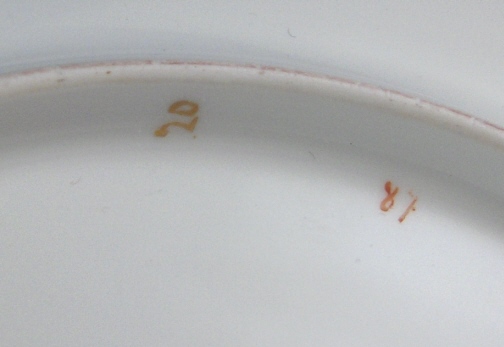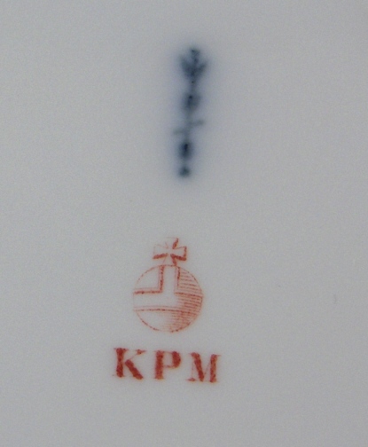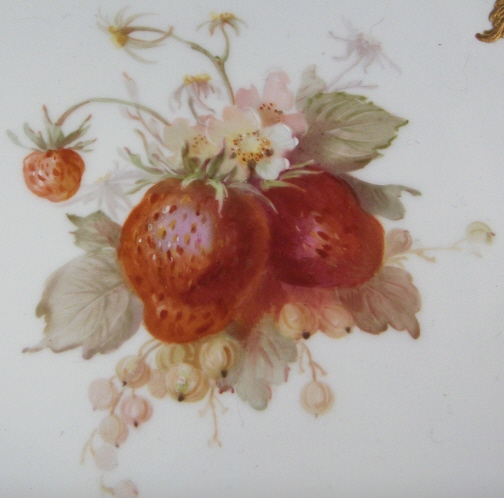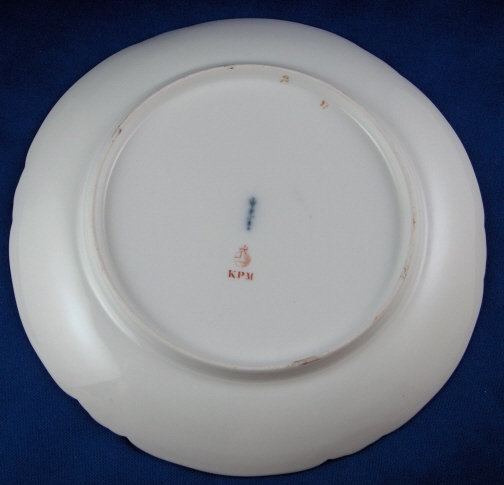 This is a great plate made by KPM around 1900. It is handpainted in the center with a superb scene of strawberries and currants with a nice raised gold trim to the rim which makes this one elegant plate! The plate is in perfect condition. It is about 7.375 inches in diameter. The piece is marked underneath with the underglaze blue scepter, the red orb mark and some painter's marks. No impressed date code so it dates to before 1901. Please email me for more information or other pictures.