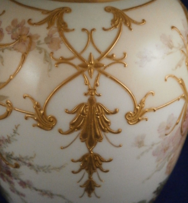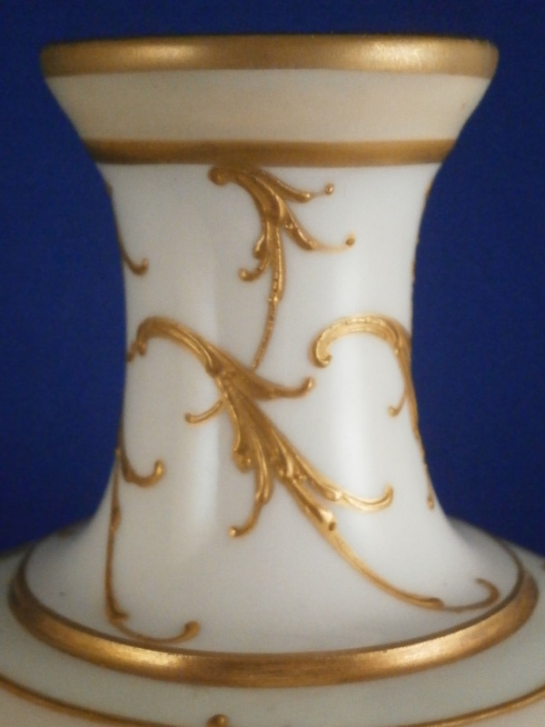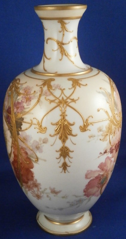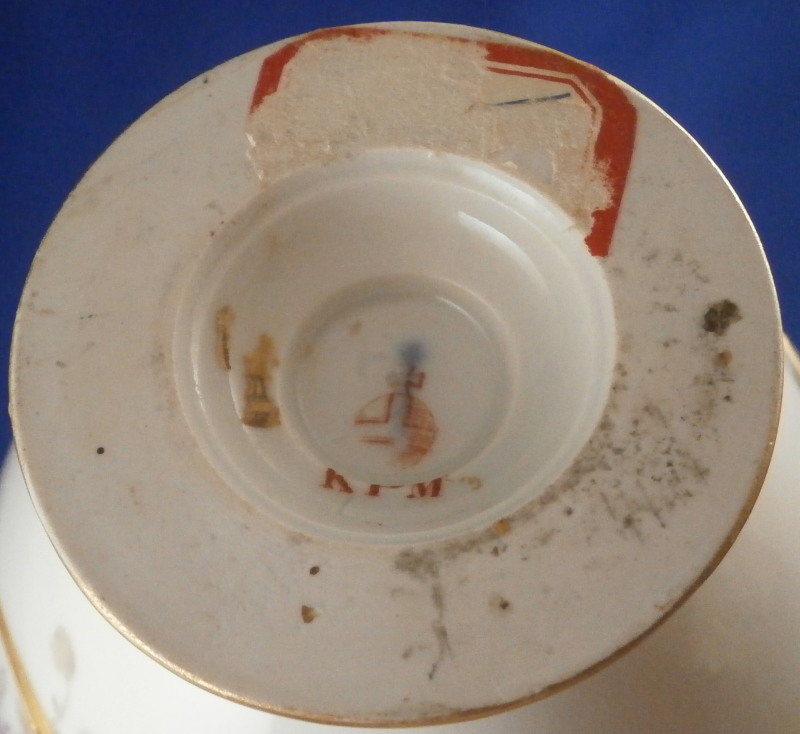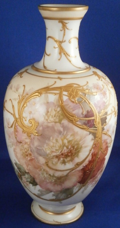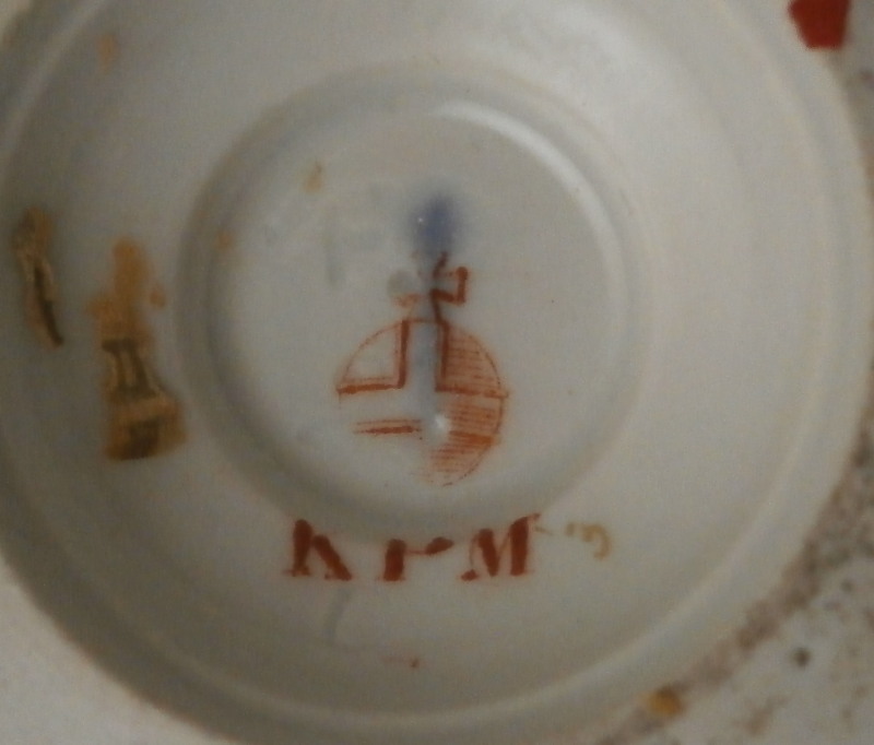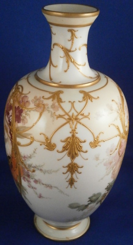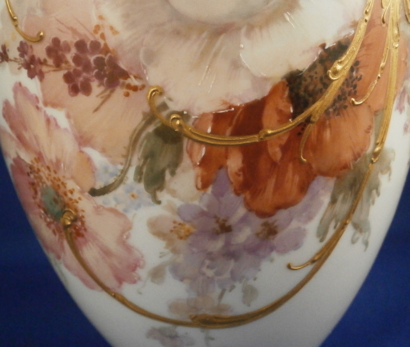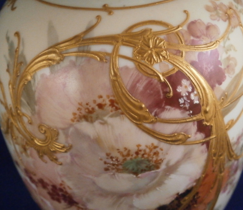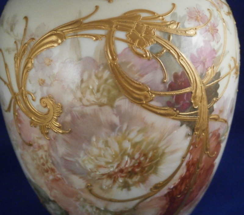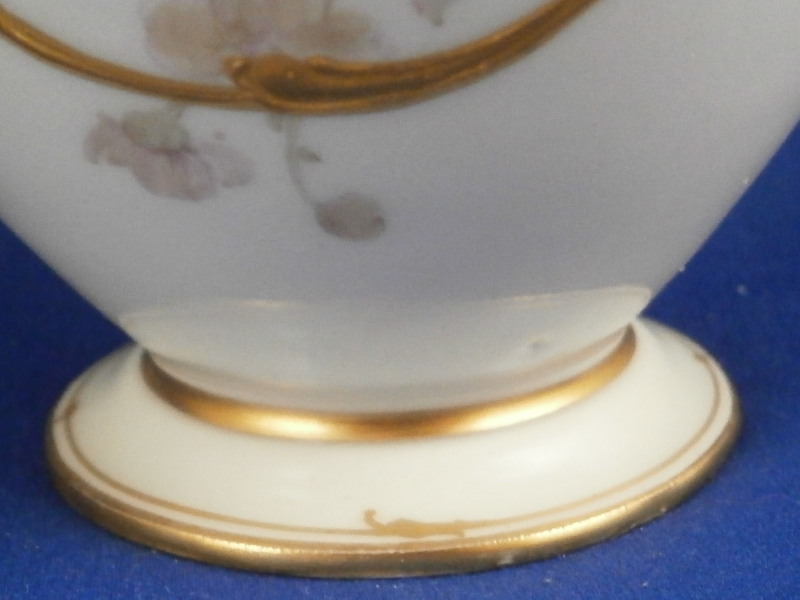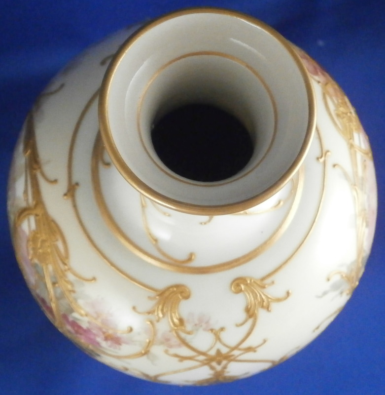 This is a stunning vase made by KPM in the early 20th century during the Art Nouveau / Jugendstil period. The piece is hand painted with some very detailed and naturalistic flowers in the Weichmalerei style. The softer tones of this style make for extremely superb floral designs and the raised gold trim designs just make these extra elegant pieces! The vase has a thin neck with a small opening of about 1 inch on the inside, a nice foot with some gold trim to it and the main body has two different floral designs with the superb gold trim. There is some slightly greenish ground color to the very top of the main body where it meets the neck and some off white ground right under that with the rest of the vase being white. The top edge and the foot also have a slightly yellow ground color (not restoration!). Really an amazing and elegant piece and a bit bigger than many pieces I ahve previously owned which is nice. It is 7.75 inches tall and 4 inches in diameter. The vase is in perfect condition. The bottom is marked underneath with the underglaze blue scepter as well as the red orb mark and the usual impressed marks from this period. Please email me for more information or other pictures.