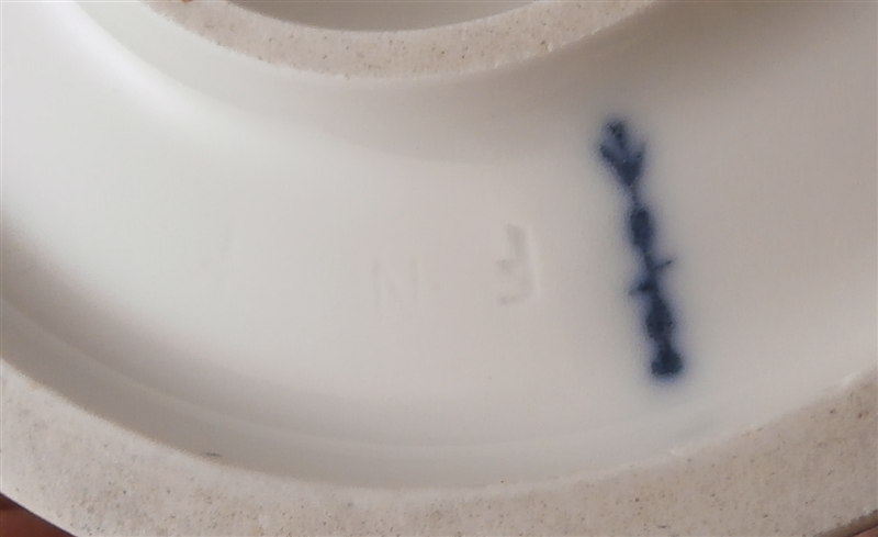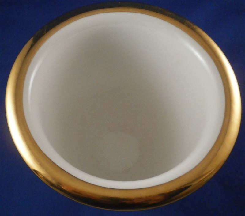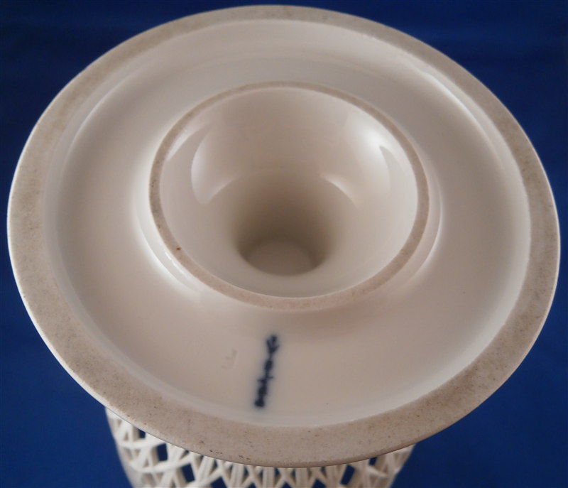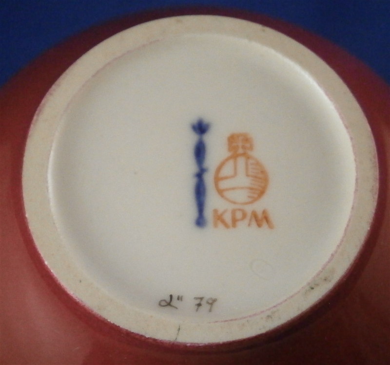 This is a basket vase aka sugar basket aka Schinkelkorb made by KPM in the 20th century. It was designed originally designed by Karl Friedrich Schinkel around 1820 and comes in the outer white reticulated part and an inner colored liner / insert which in this case is marron in color. The outer piece is amazingly reticulated which supposedly takes 3000 separate little cuts into the porcelain! The reticulated area is unglazed which is a bit unusual and really nice but the top rim and the bottom part is glazed. The foot has a nice ring of raised "pearls" on it which gives it a very elegant look. The liner has a nice deep color that shows through the reticulated part when inserted and a gold top edge. The piece is in perfect condition with one minor scratch to the liner color. The outer piece is marked underneath with the underglaze blue scepter mark as well as the usual impressed marks of this period and the liner is marked with the red orb as well, black painter's marks and the usual impressed marks as well. The piece including the liner is 7 inches tall and 6.125 inches in diameter. Please email me for more information or other pictures.
