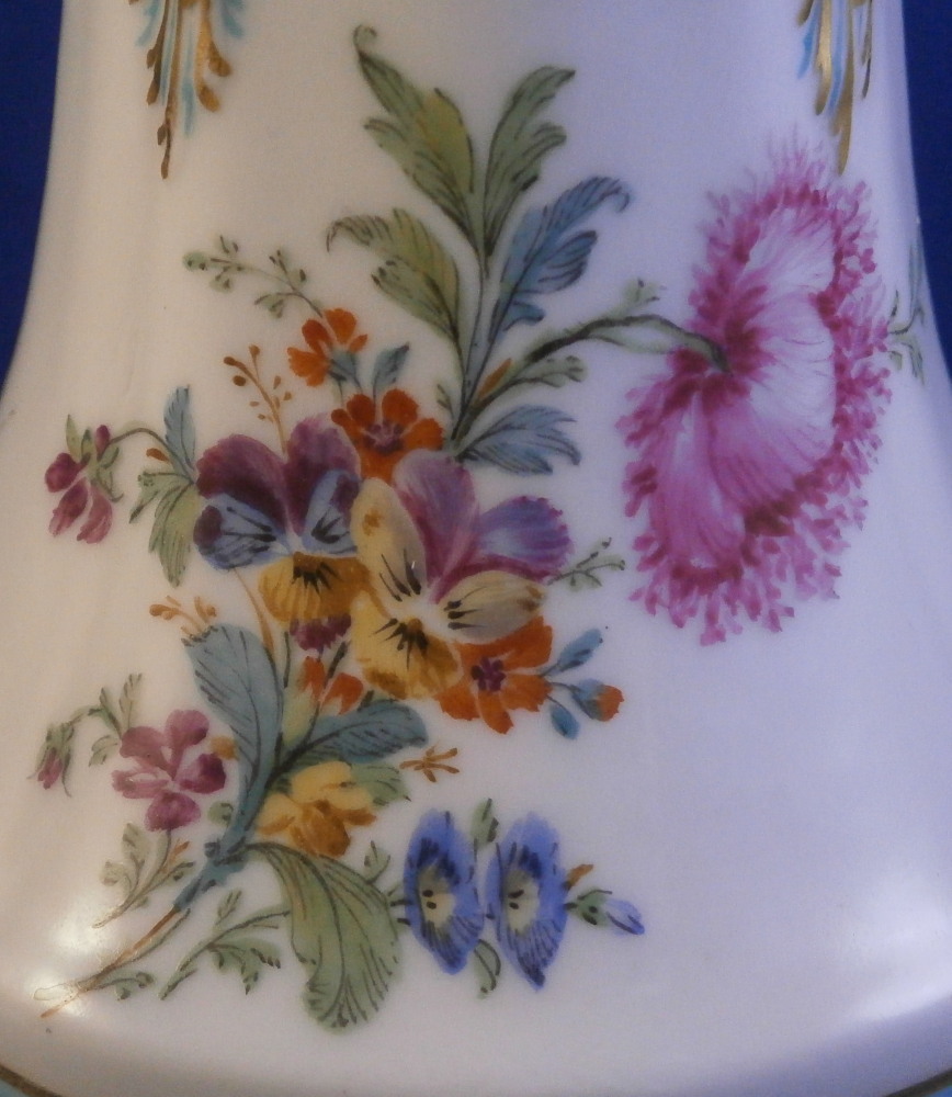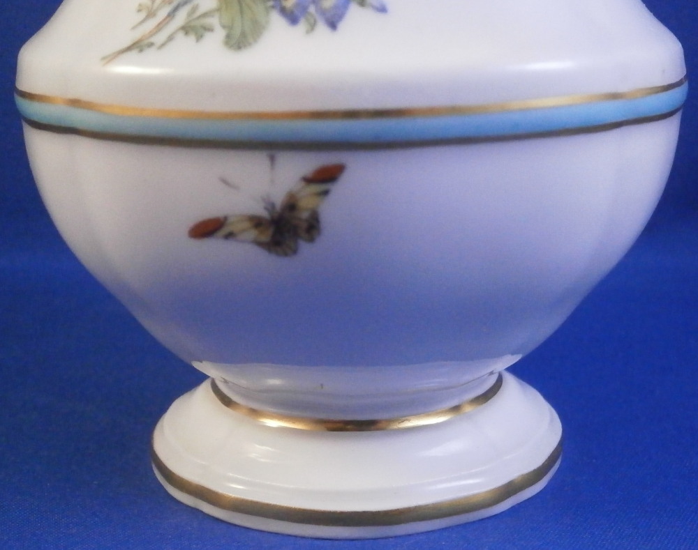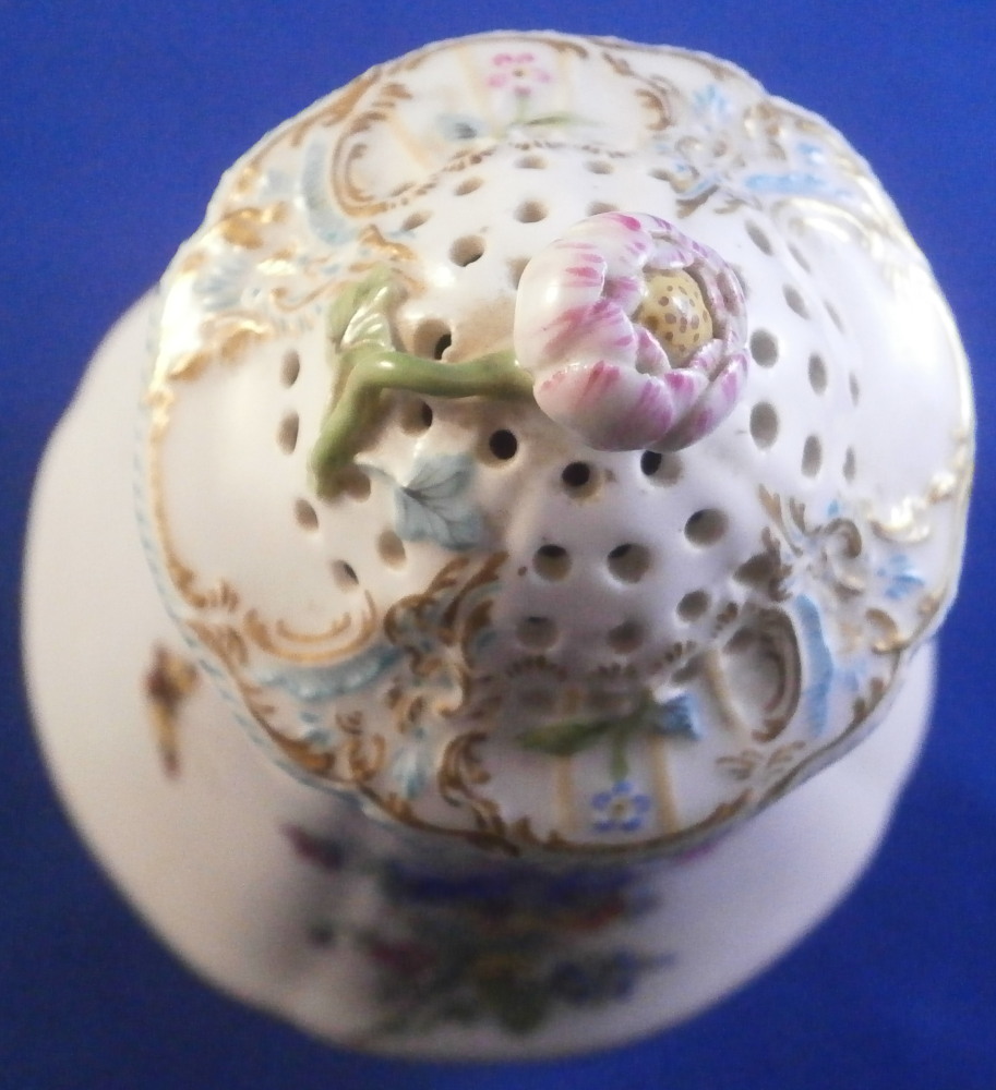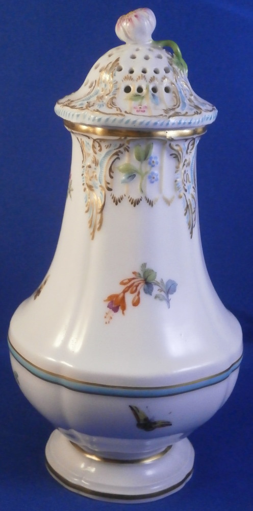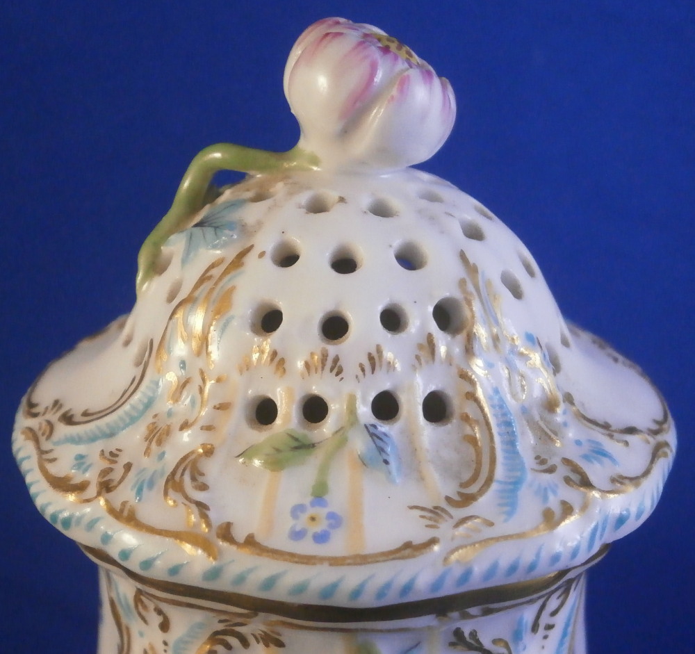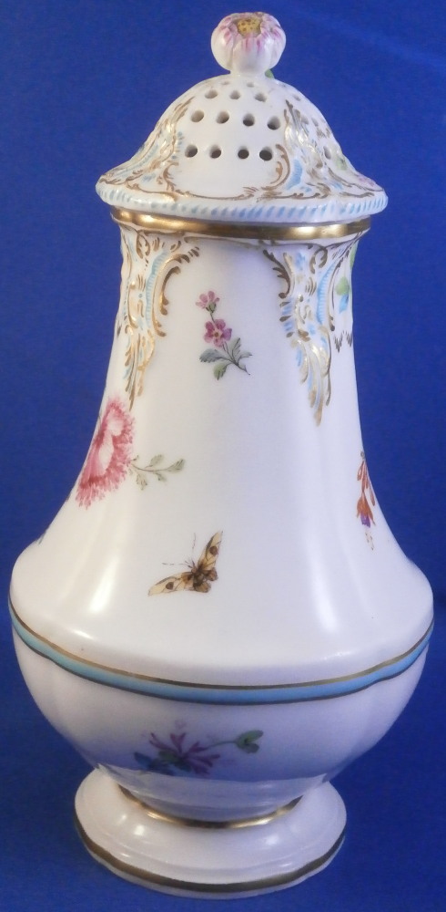 This is a fancy sugar shaker / caster / muffineer made by KPM in the early 20th century . It is of a nice size and is hand painted with a polychrome floral arrangement on the front as well as some butterflies and single flowers scattered throughout the rest of the body. There is a relief design to the paste of the upper part highlighted with gilding and turquoise which then goes into the top. The top has the characteristic holes in it for the sugar to come out of. Floral finial with its stem and leaves to the top. Turquoise and gold ring around the widest part and gold trim to the bottom edge. A really nice looking piece! It is in perfect condition. The cork in the bottom is missing but that is an easy thing to replace if need be. The pot is marked with the under glaze blue scepter mark as well as the red orb mark as shown. It is 6 inches tall and 3 inches in diameter at the widest middle section part. . Please email me for more information or other pictures.