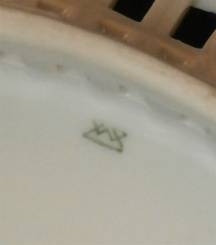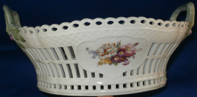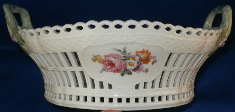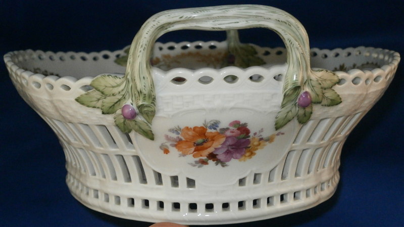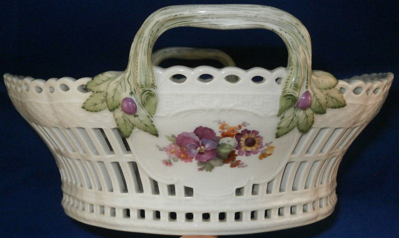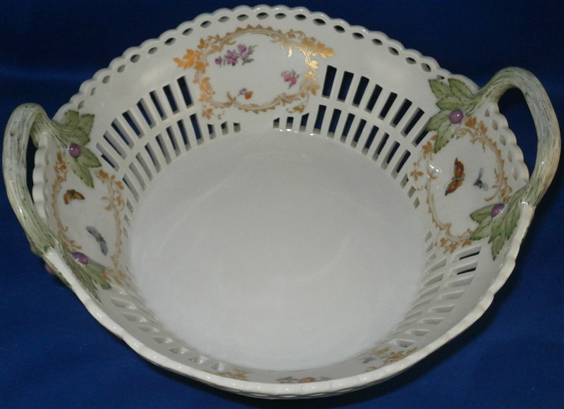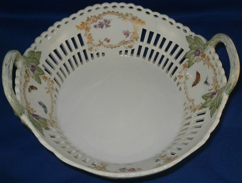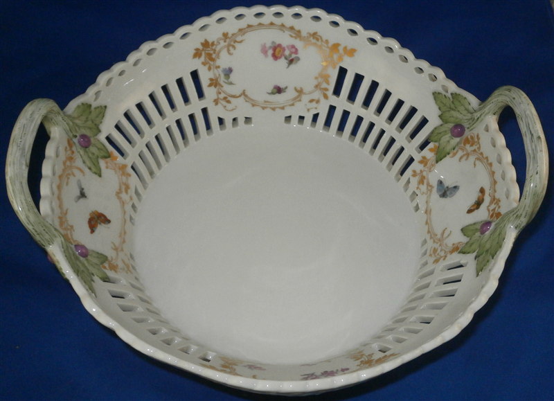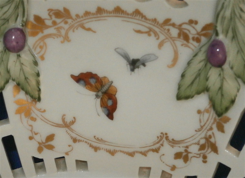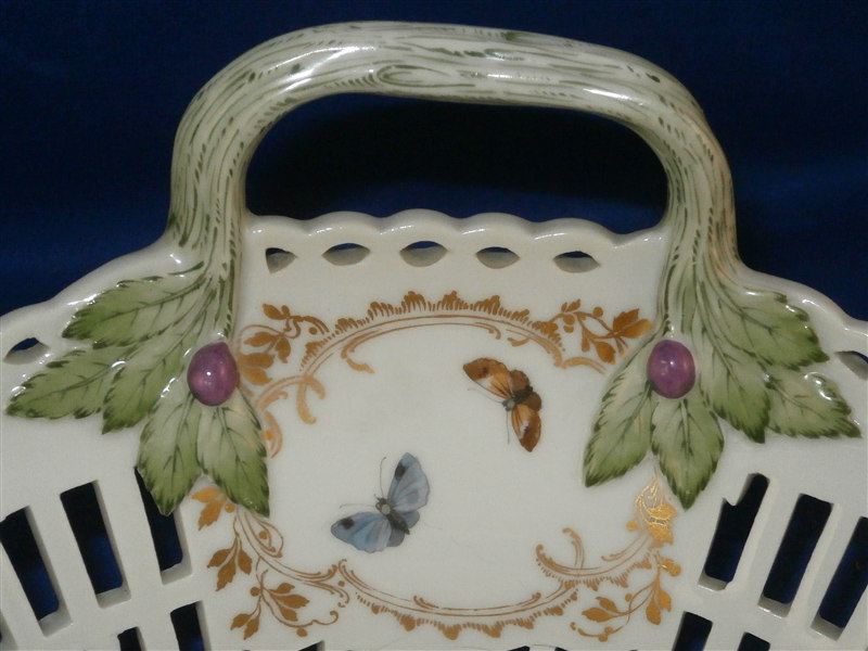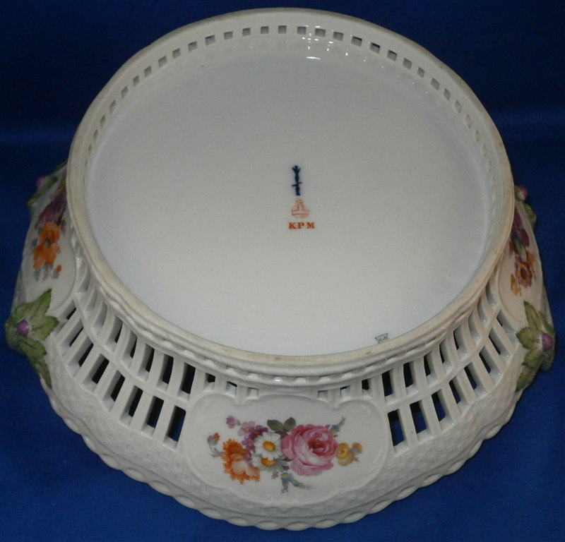 This is a superb reticulated basket made by KPM in the early 20th century. I ahve not come across this style basket before as most one sees are oval in shape and with flowers on the bottom inside. This one here I like much better. It is round in shape with two nice barnch handles ending in leaves and a puce berry, has a very nice reticulated edge all around with four cartouches on the inside surrounded by a nice gold trim with flowers and butterflies but the best part are the four floral panels on the outside of the piece. Just a superb piece all around! The basket is in perfect condition which is somewhat amazing :) The piece is 2.875 inches tall without the handles - add an inch for those, 9.25 inches wide and 8.5 inches deep. It is marked underneath with the under glze blue scepter mark as well as the red orb, the usual impressed marks as well as a painter's mark as shown. Please email me for more information or other pictures.