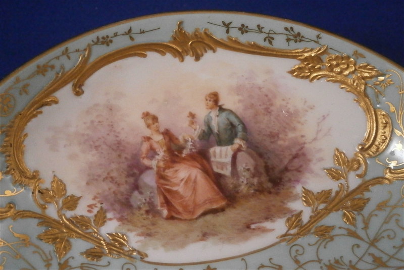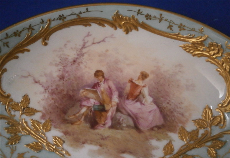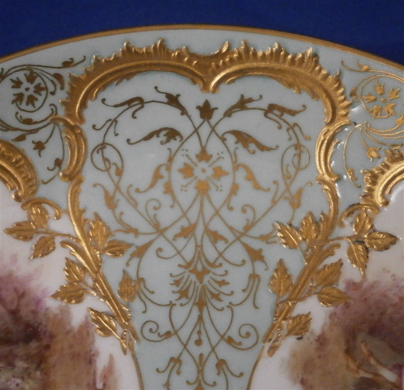 This is the fanciest design of this style saucer made by KPM in the early 20th century. It is handpainted with two high quality large scenes of couples in a landscape surrounding and an amazing raised gold trim with the open areas having a greenish ground color with lots of amazingly detailed gold designs to it. About as superb a saucer as you can find from KPM of this period! The piece is in perfect condition which always helps :) The saucer is 1.25 inches tall and has a diameter of 5.125 inches. It is marked underneath with the underglaze blue scepter, the red orb mark as well as s painter's or gilder's mark and the usual impressed marks pieces of this period have. Please email me for more information or other pictures.