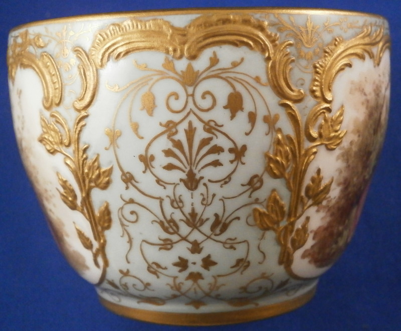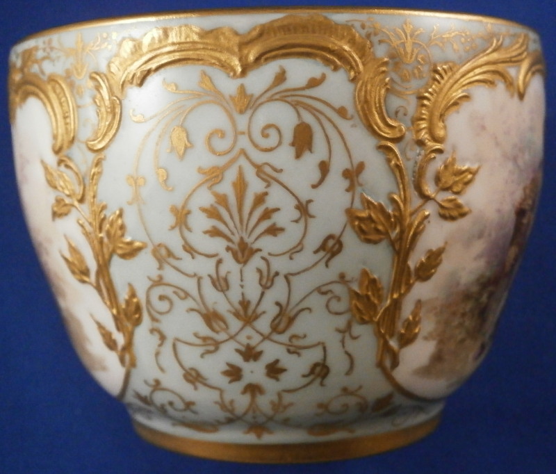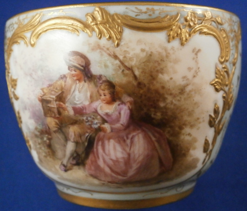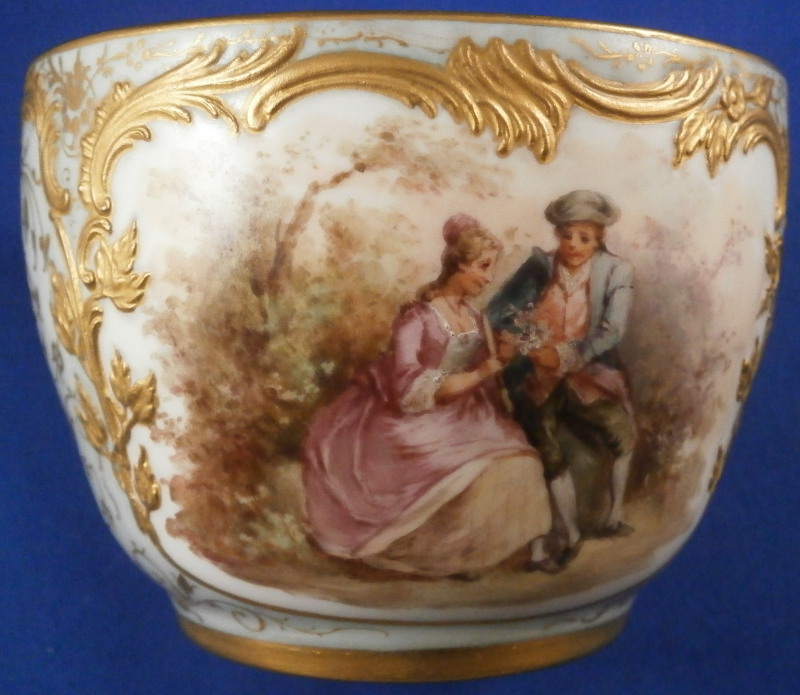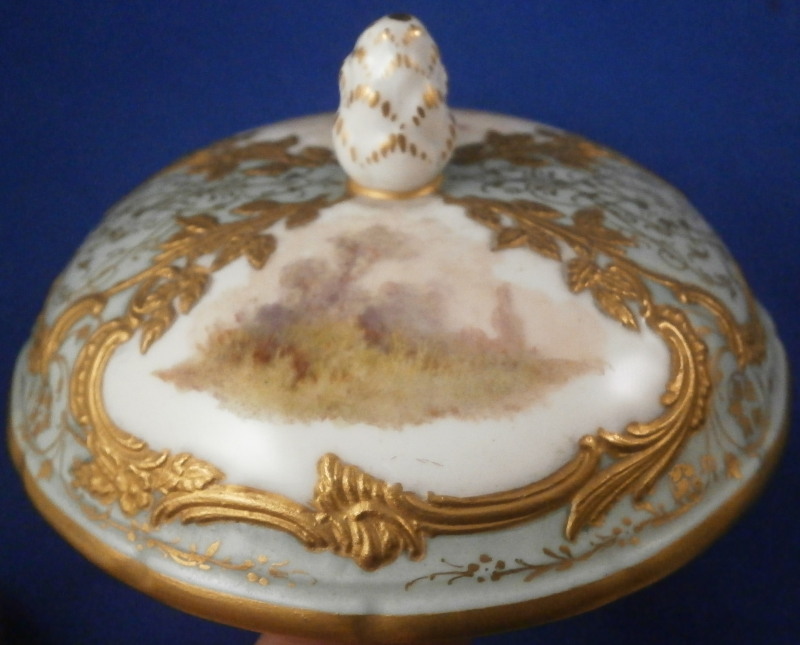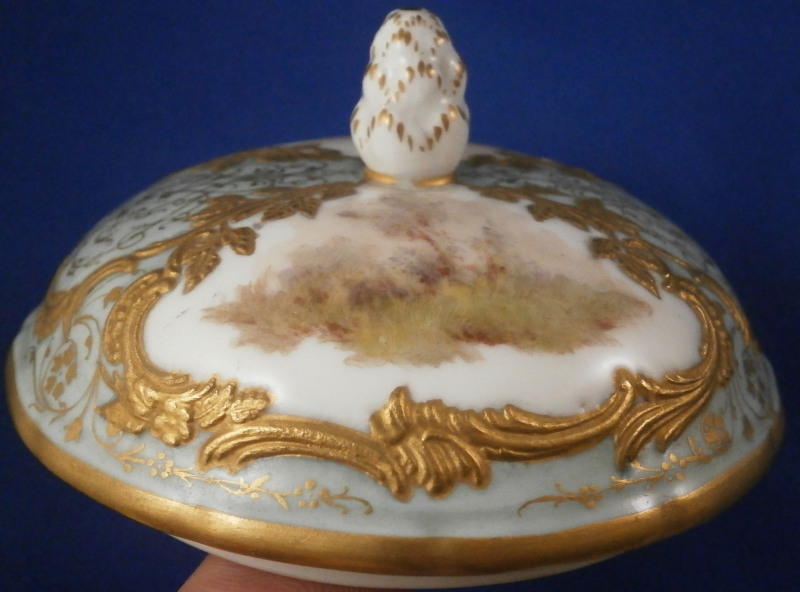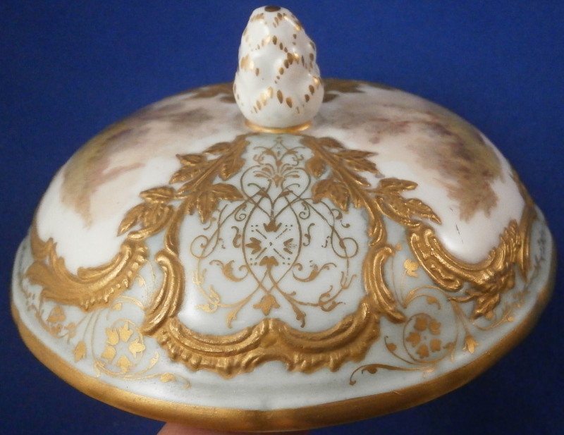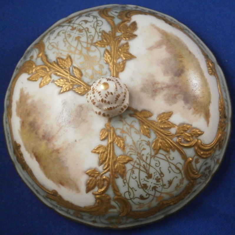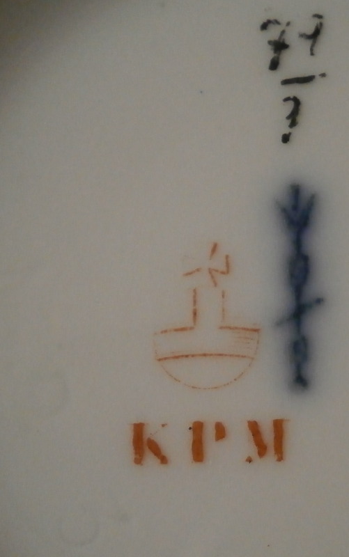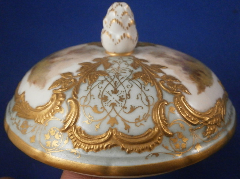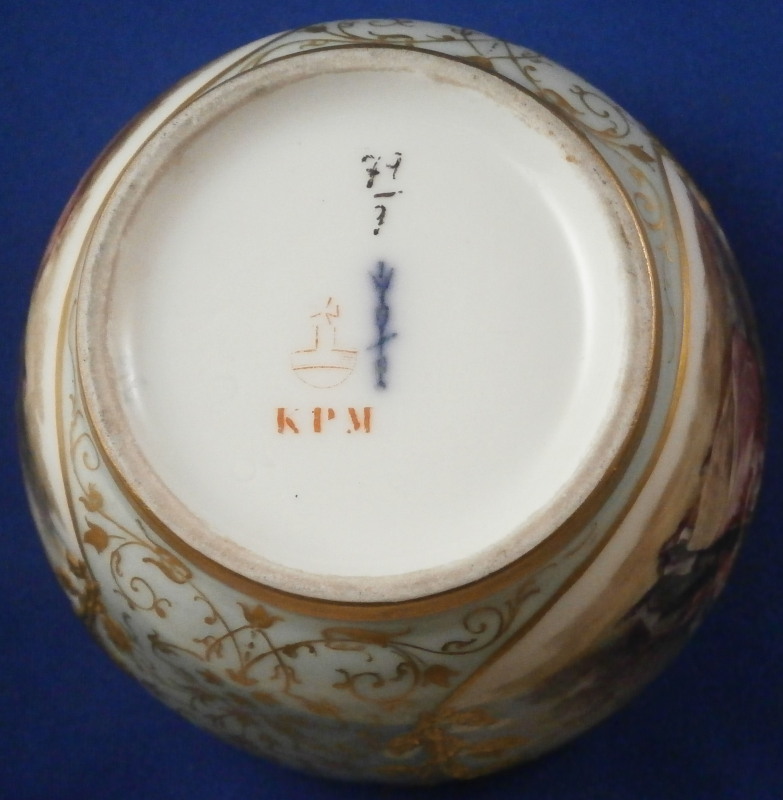 This is an amazing sugar dish made by KPM in the early 20th century. It is hand painted the fanciest design of the Neuzerat style with two high quality large scenes of couples in a landscape surrounding and an amazing raised gold trim with the open areas having a greenish/bluish ground color with lots of amazingly detailed gold designs to it. The lid has the same design except the two scenes are landscape scenes only without any people in it. About as superb a sugar dish as you can find from KPM of this period! The piece is in perfect condition which always helps :) The dish including its lid are about 4 inches tall and has a diameter of 3.5 inches. It is marked underneath with the underglaze blue scepter, the red orb mark as well as some black numbers as well as the usual impressed marks pieces of this period have and some markings under the lid as well to show it is the original one. Please email me for more information or other pictures.