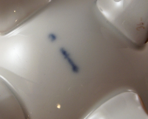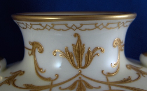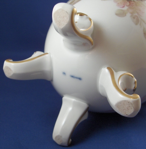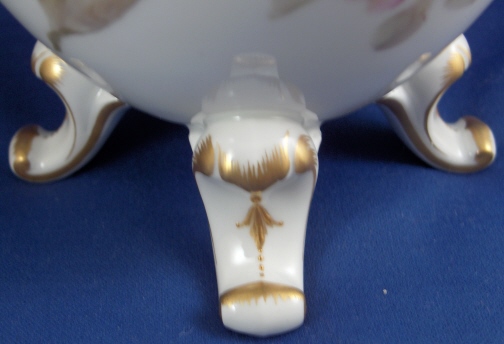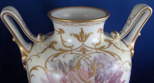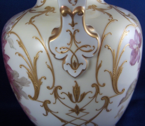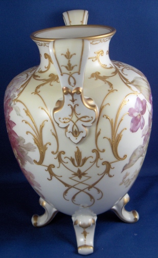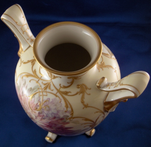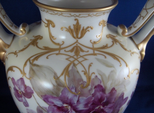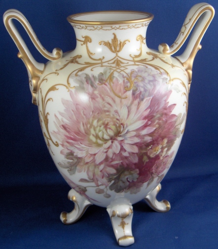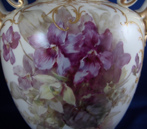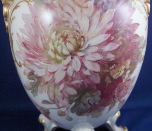 This is a superb vase made by KPM in the early 20th century in the Art Nouveau / Jugenstil period. It is the same shape as the smaller one I have on the site which is neat but much larger in size. The piece is handpainted with some very detailed and naturalistic flowers in pink, purple and blue tones on one side and purple on the other. Think they are mums on one side and violets on the other but don't quote me on that :) The colors are in the softer tones of the Weichmalerei style which is my wife's favorite! They look real enough to want to smell them. Superb handles and four feet are a nice addition and make this the perfect vase! The final touch is lots of gold detail much of which is raised and the areas in between filled with an off white color. Really an amazing and elegant piece! The vase is in perfect condition. It is 8 inches tall, 7 inches wide and 5 inches deep. The bottom is marked underneath with the underglaze blue scepter with the letter E or C underneath (a bit blurry so hard to tell) as well as a gilders mark and the orb mark but it is only visible at the right agle to the light. Must have fired funny and disappeared mostly. No question this was painted by KPM and is first quality. Please email me for more information or other pictures.