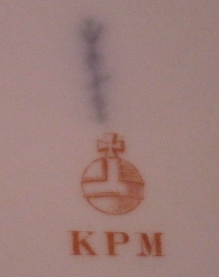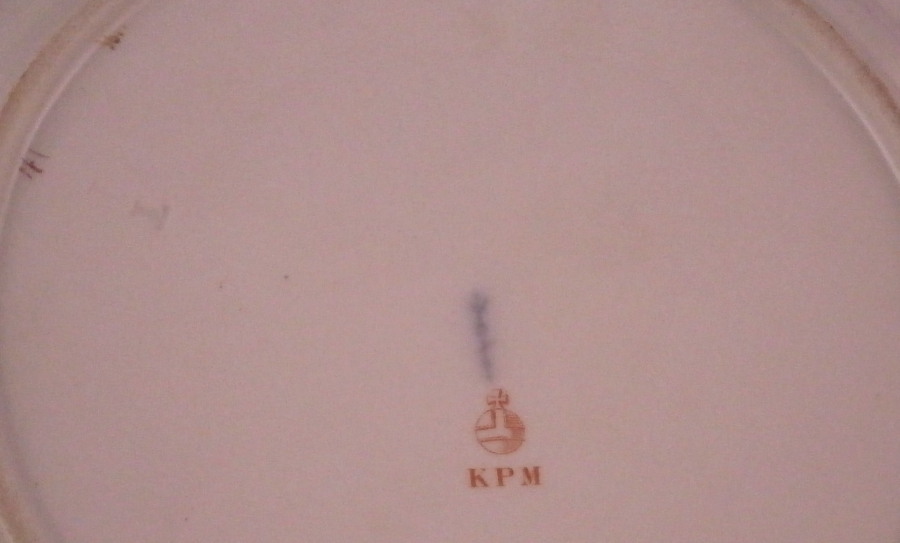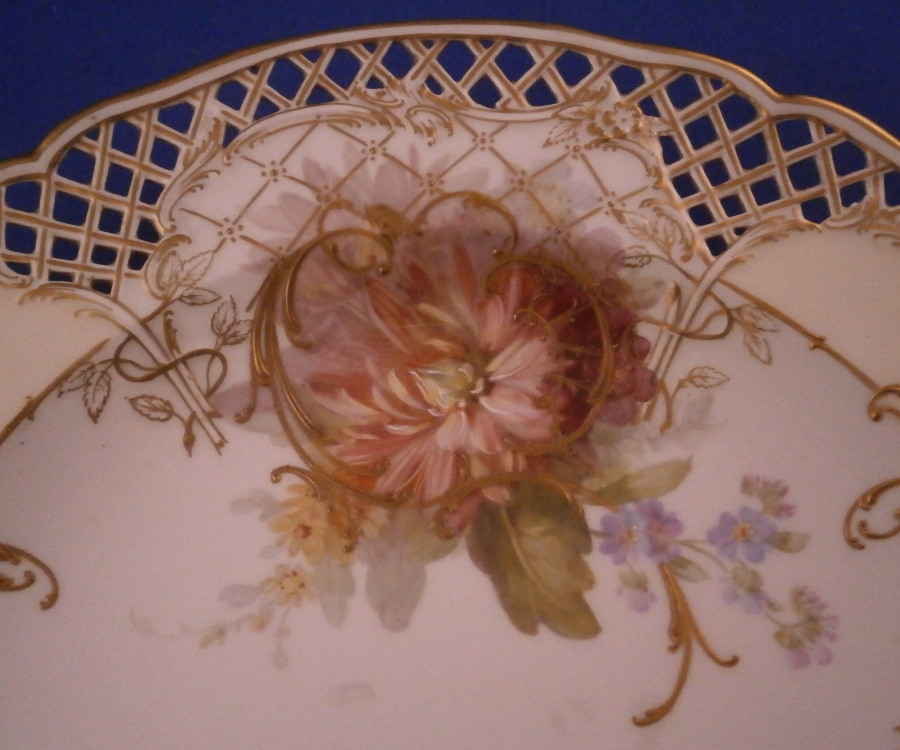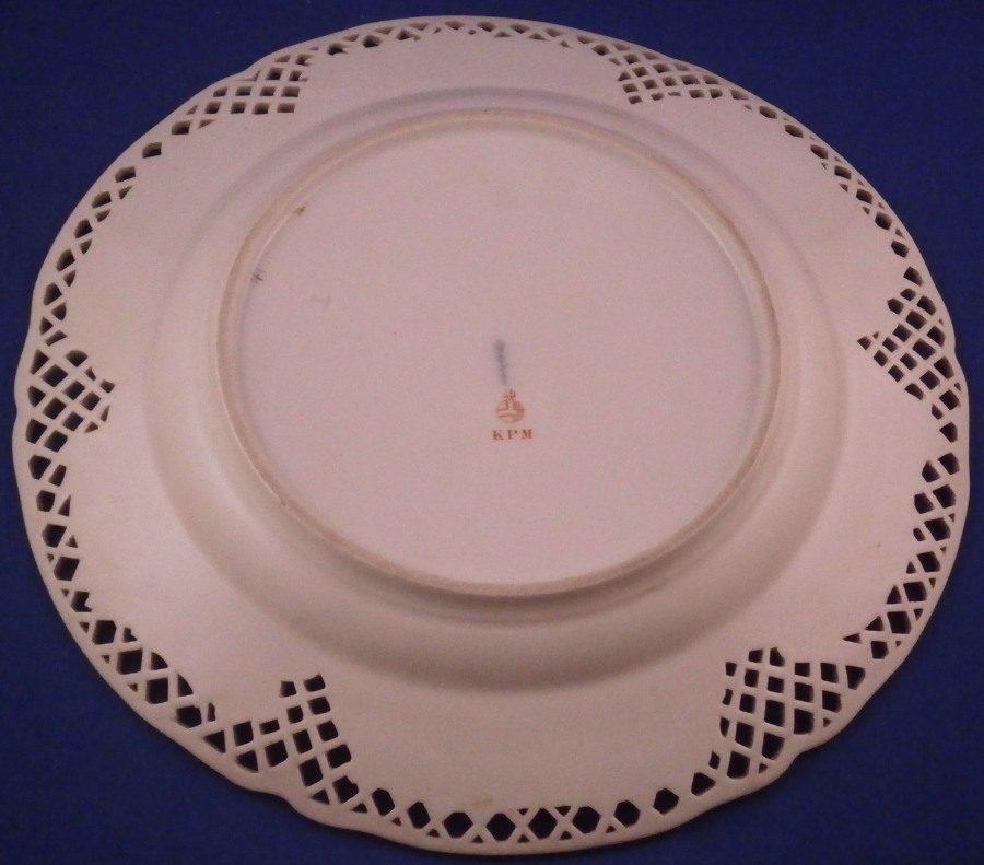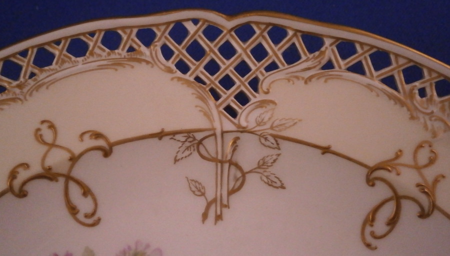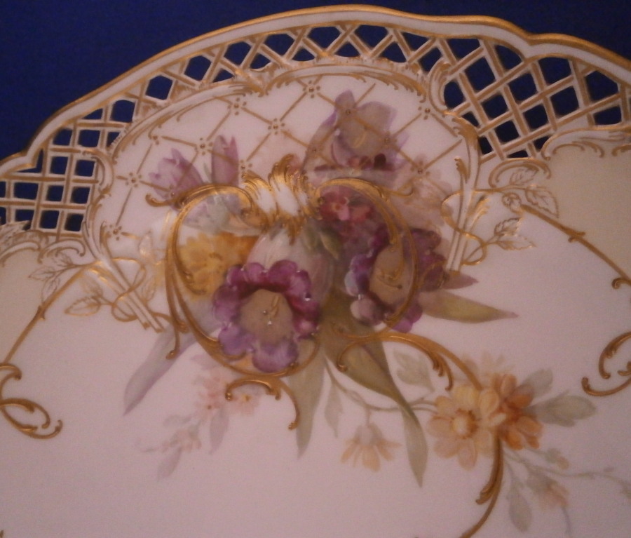 This is an amazing reticulated plate made by KPM in the early 20th century. I have not had a plate in this style - just a cup and saucer. The piece is hand painted superbly with two flower designs in the Weichmalerei style as well as a raised gold trim and a light yellow ground color on the rim in the parts that have not been reticulated. Lots of really nice gold trim including vines with leaves going from the rim into the plates as wellas a couple of gold flowers. One of the most stunning pieces I have seen in this style! The plate is marked underneath with the under glaze blue scepter mark as well as the red orb and various painter's / gilder's and impressed marks. The piece is in perfect condition which is amazing. There is what looks to be a scratch in the orange flower but that was painted that way. The plate 1 inch tall and 8.875 inches in diameter. Please email me for more information or other pictures.