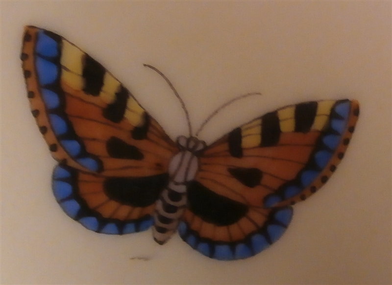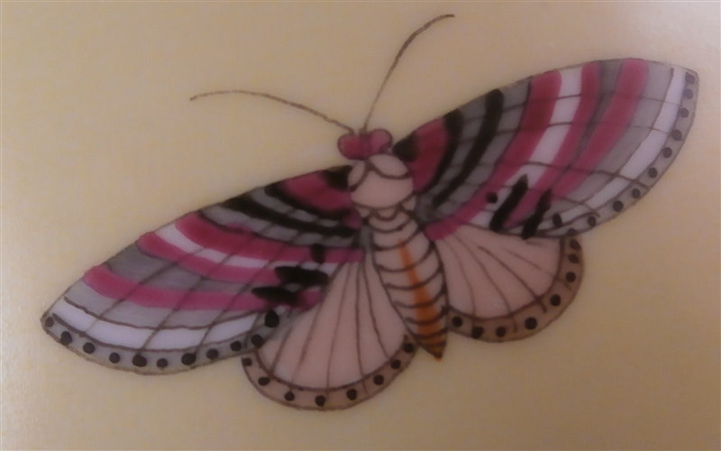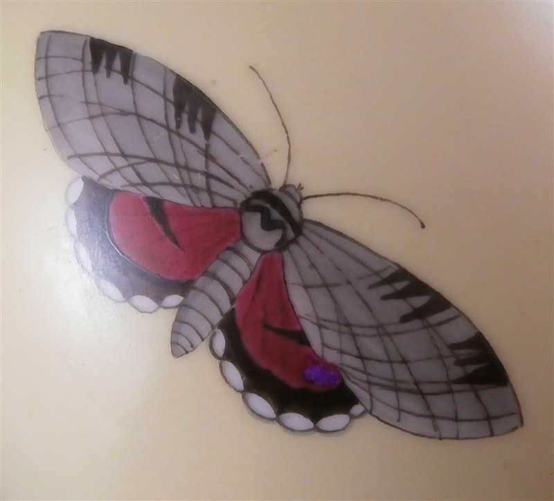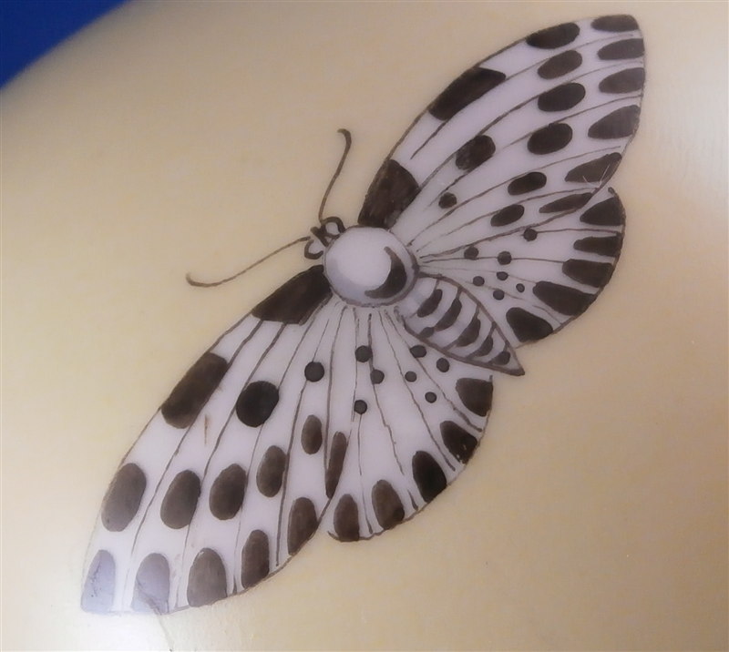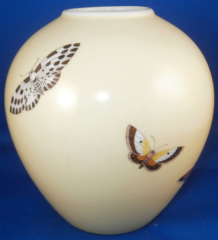 This is a vase made by KPM in the mid 20th century right after WWII. It was designed by the famous Trude Petri and has a very rare design of hand painted butterflies all around on a yellow ground. A very modern and elegant design that is popular among collectors and it comes in many different painted versions this one being one I have never seen before. The vase is in perfect conditon except for two small paint flakes in the puce color of two butterflies which was painted over to hide them and it displays perfectly. The piece is 5.25 inches tall and 5 inches in diameter so a bit bigger than some of Petri's vases. It is marked underneath with the underglaze blue scepter mark with the S underneath for the Selb location of the factory right around the end of WWII. It also has the red orb mark and some black numbers as shown underneath. Please email me for more information or other pictures.