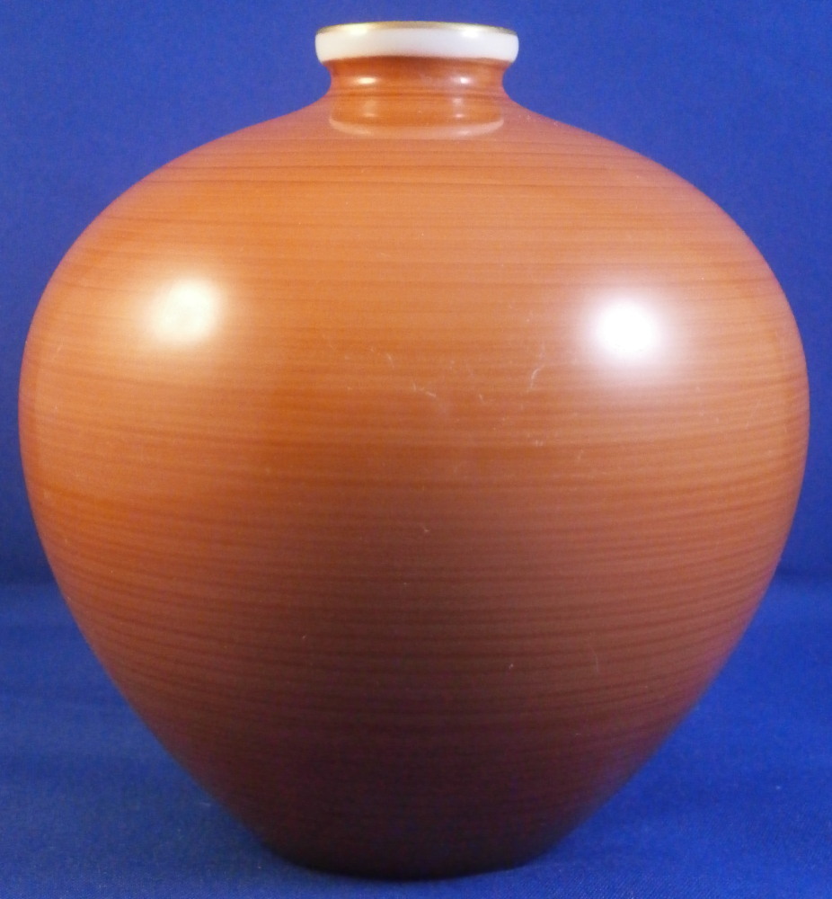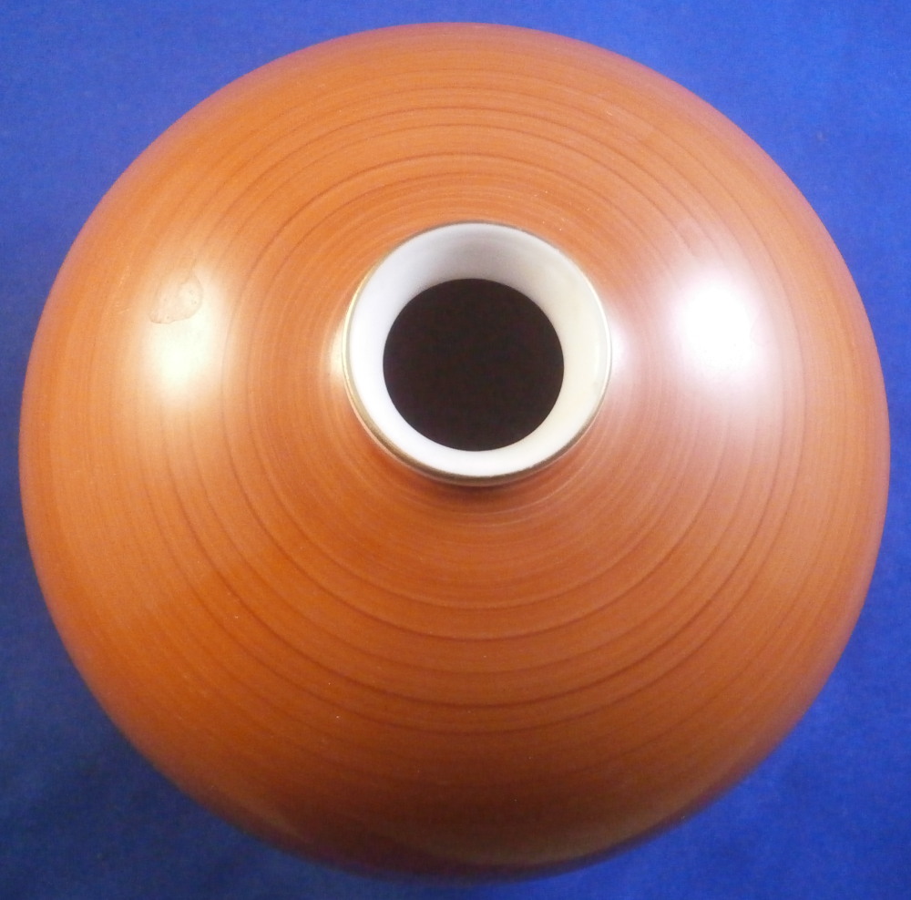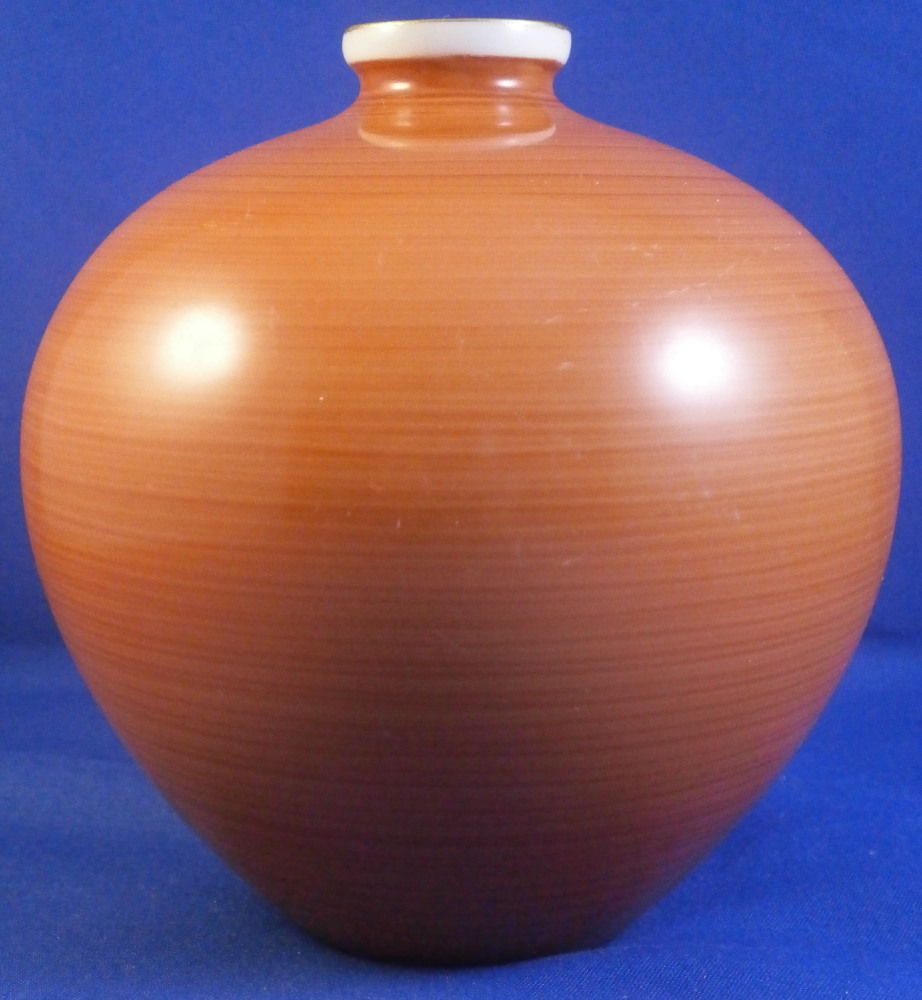 This is a small but superb vase made by KPM in the mid 20th century. I believe this spiralling orange ground ring decor was the design of the famous Trude Petri. A simple shape with a spiral / fun ring design decoration. Orange in color but the rings have different shades to give it more depth. The top is left white with a gold trim to the edge. A very elegant looking piece! The vase is in superb condition with some minor use marks common to these pieces. It is 4.125 inches tall and 3.75 inches in diameter. The bottom of the piece is marked underneath with the under glaze blue scepter mark with the letter S for the Selb location under that as well as the red orb mark, some red numbers and Made in Germany in green. So this would date to before 1949 when theys tarted using West Germany to mark items. Please email me for more information or other pictures.